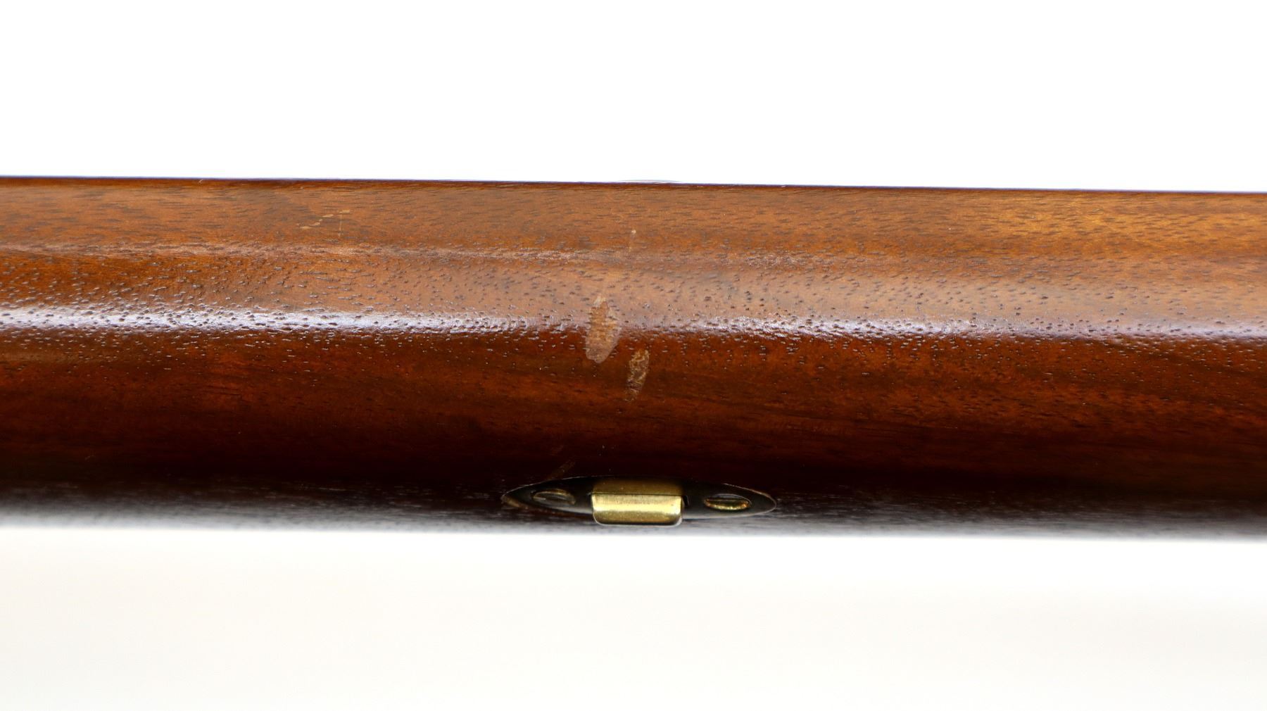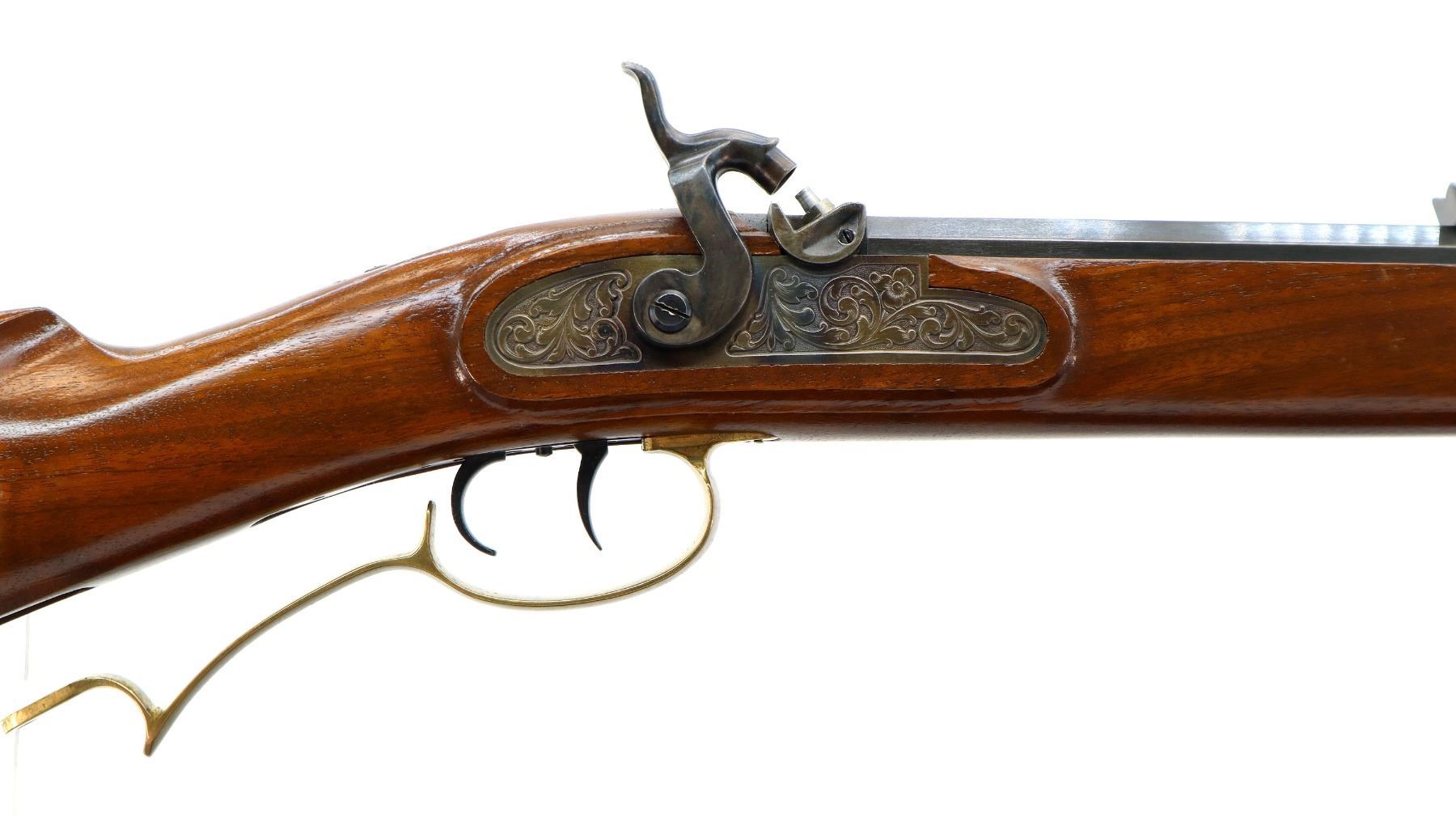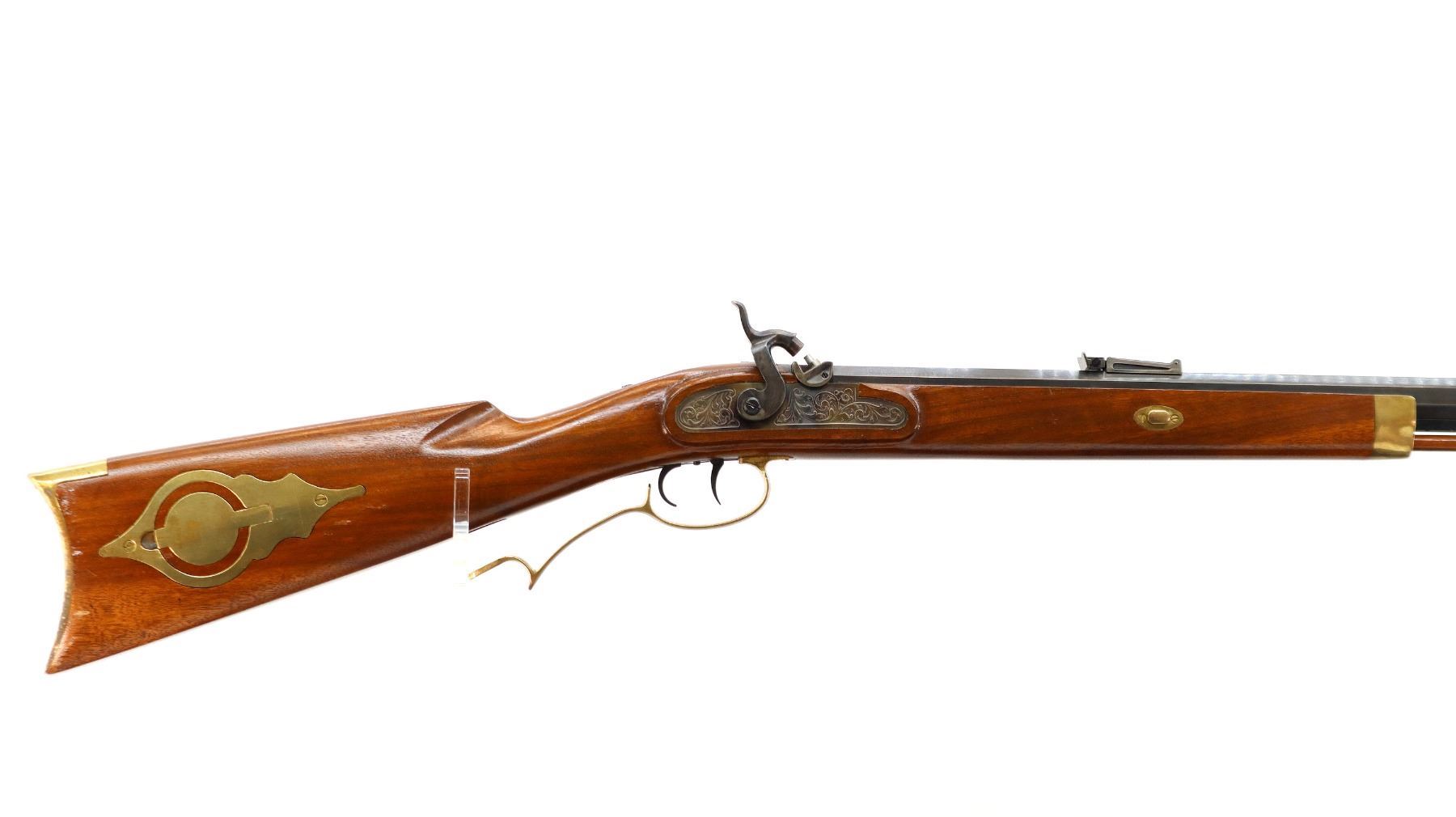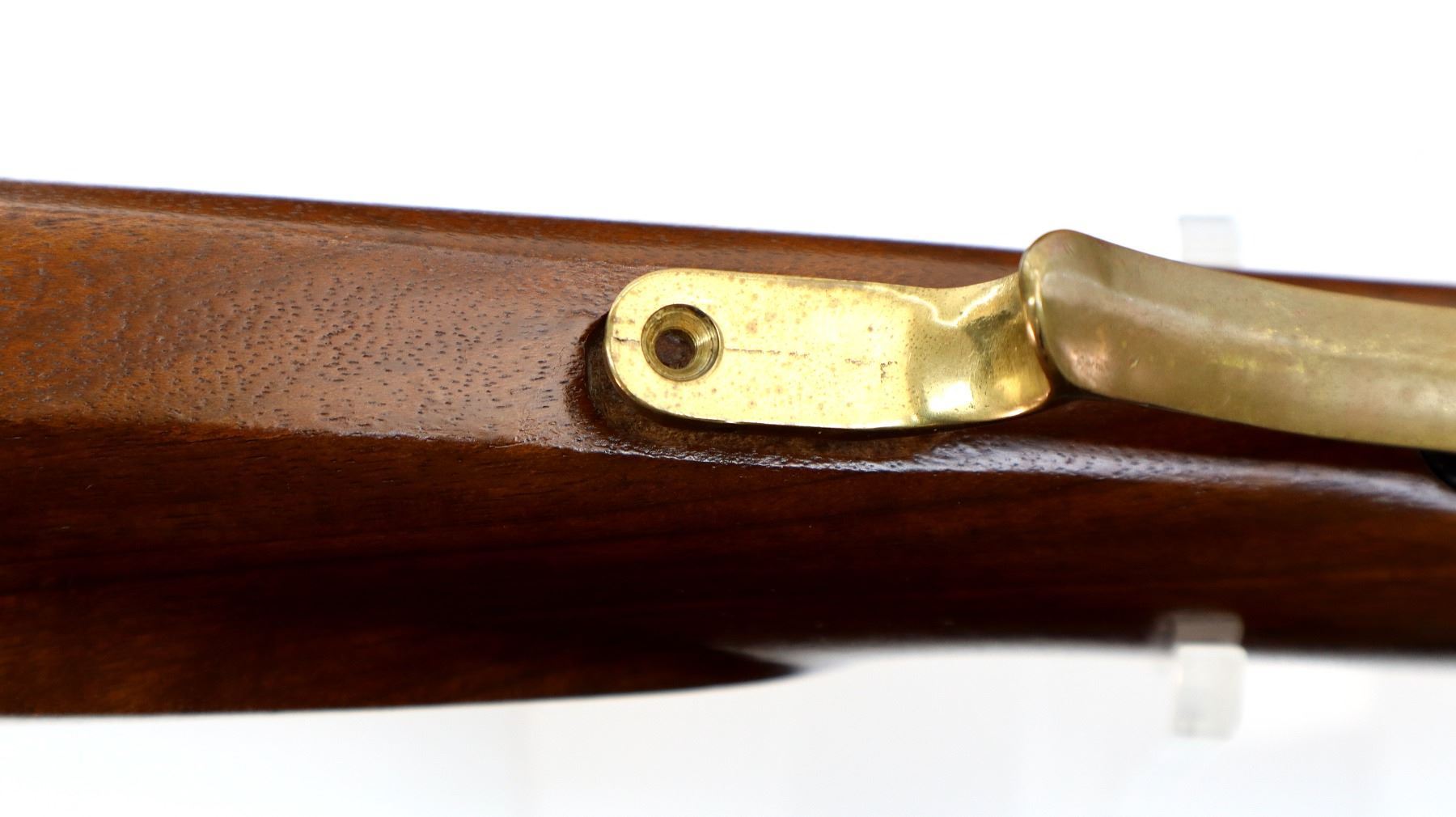 Main Description: Blade front sight, adjustable u notched rear sight, octagon barrel, engraved colour case hardened lock, grooved spur hammer that functions on double set position only, trigger requires adjustment or repair. One piece half length wood stock, single forearm wedge, straight grip, cheek rest, smooth brass butt plate, patch box, finger rest trigger guard (missing one screw), nose cap. Wood ramrod with brass tip.