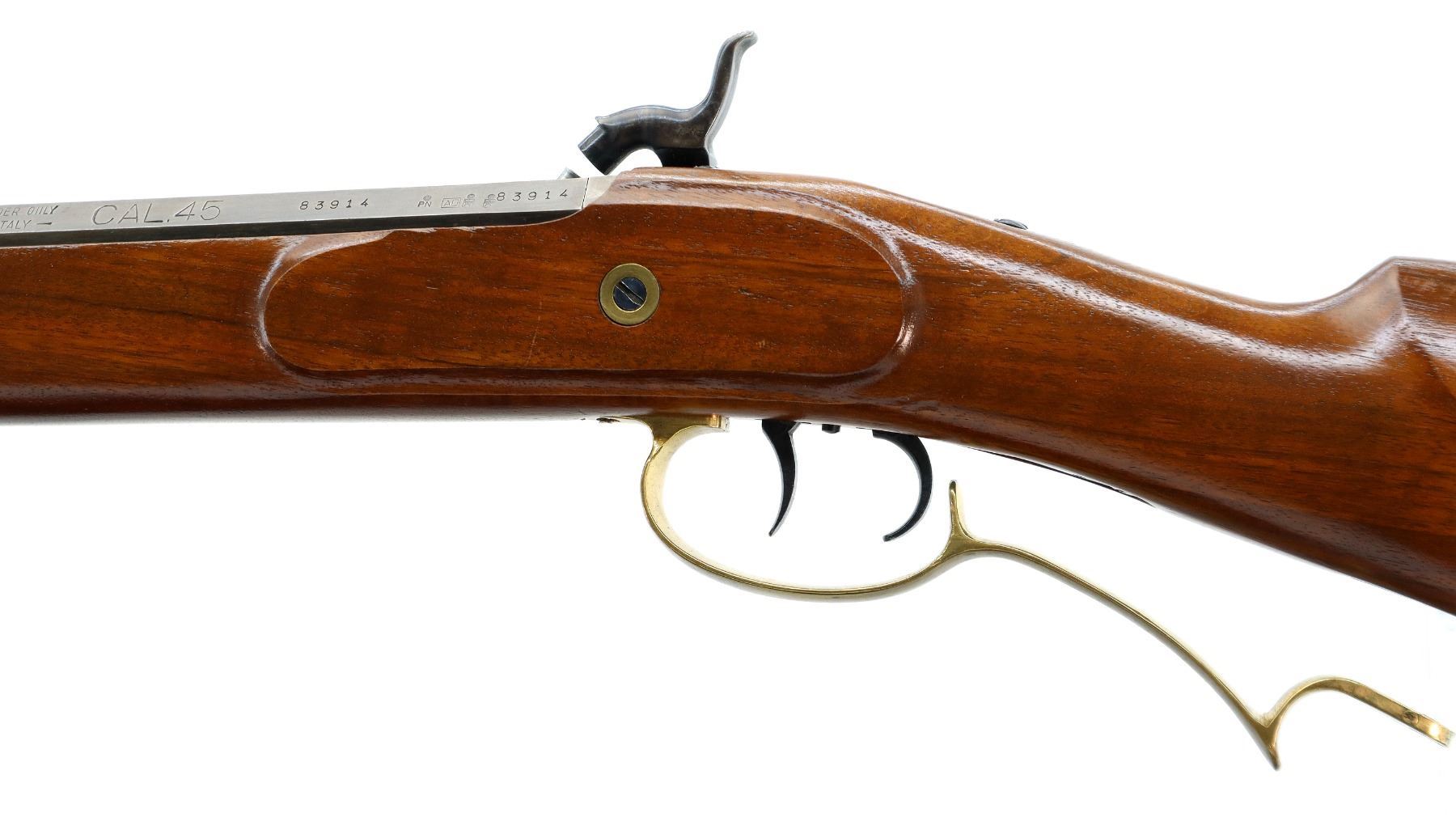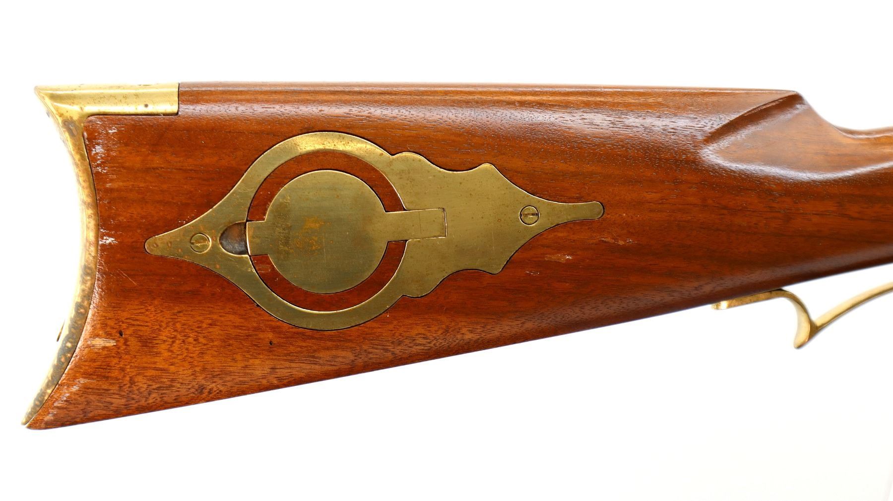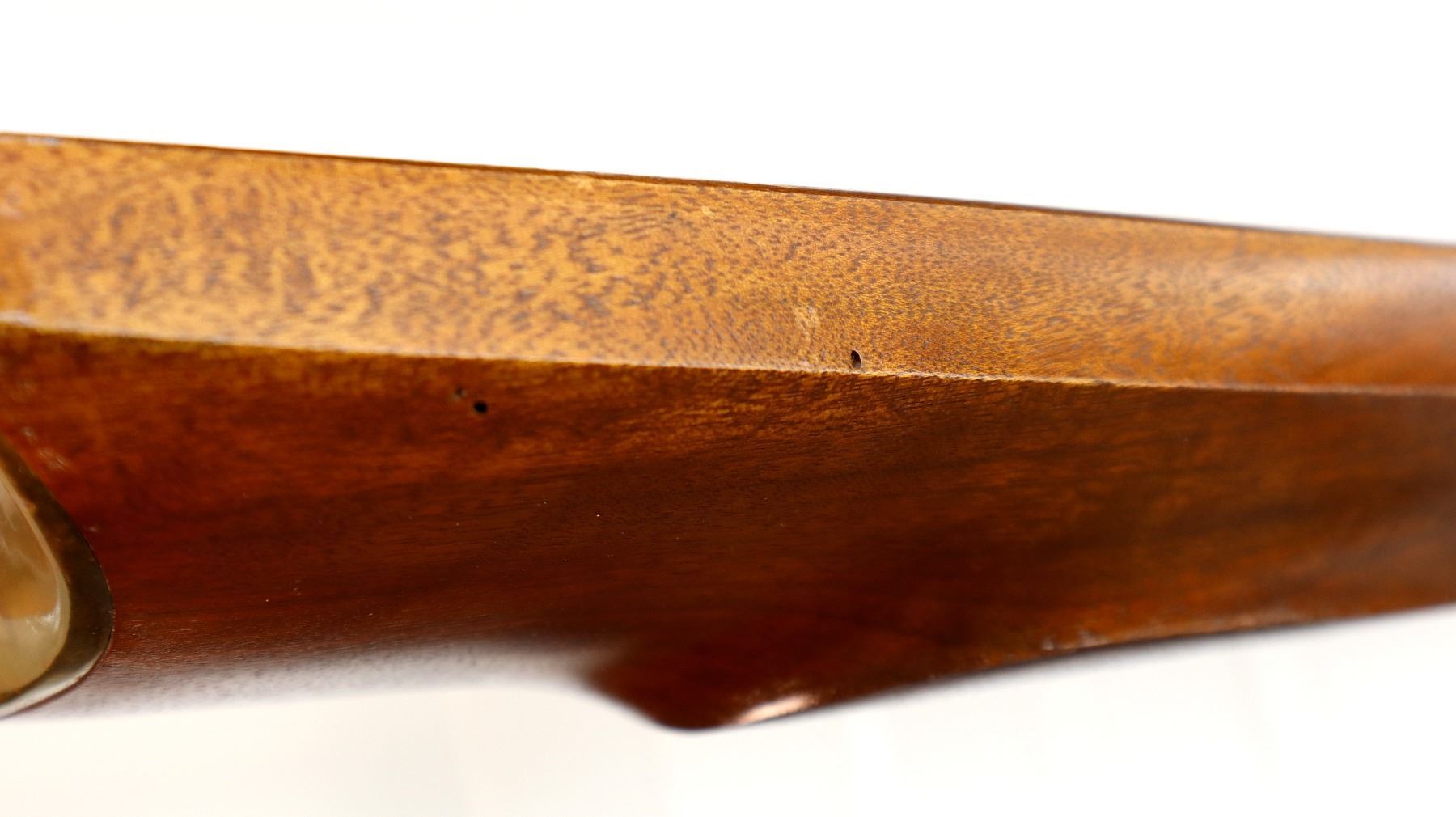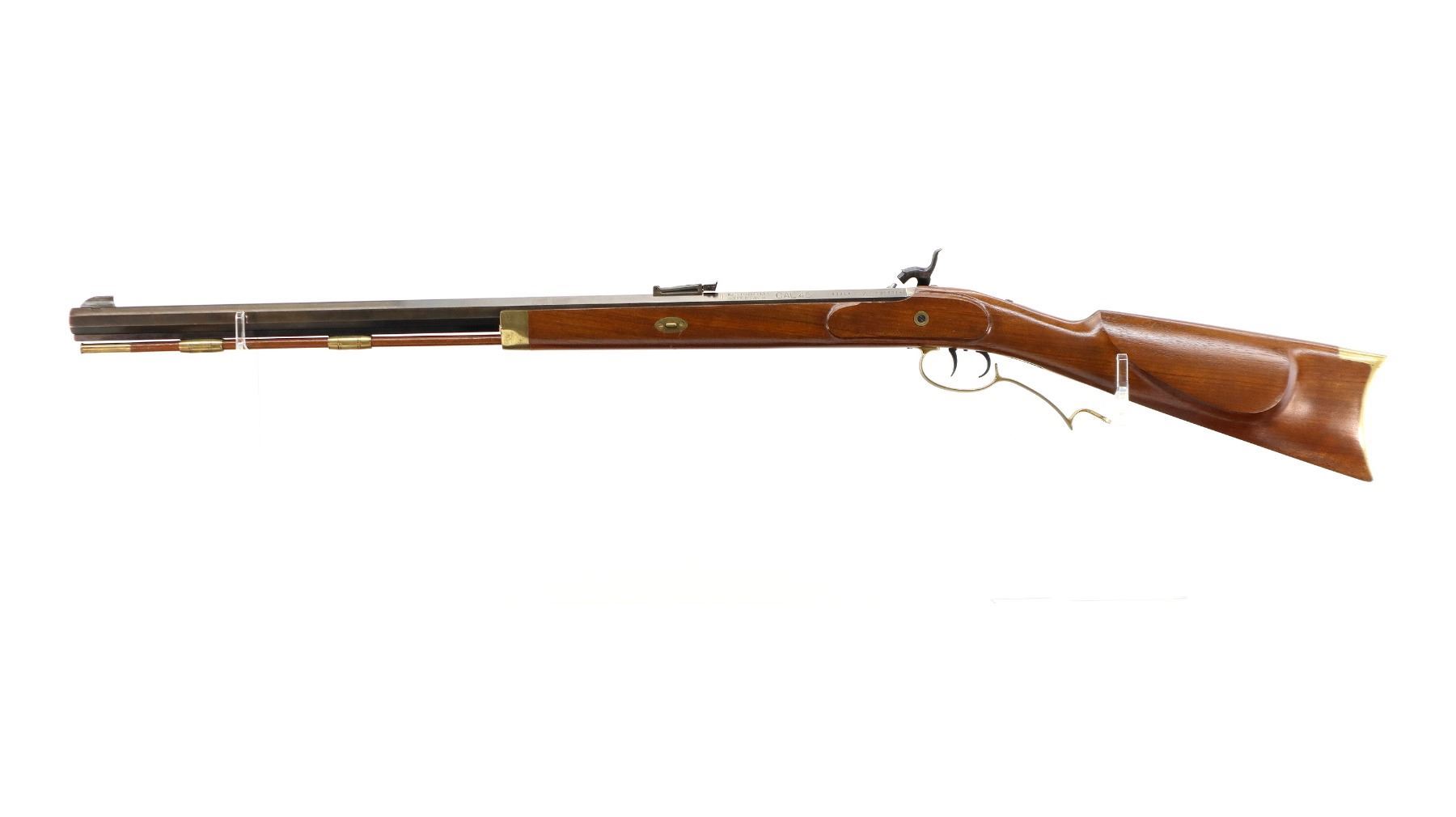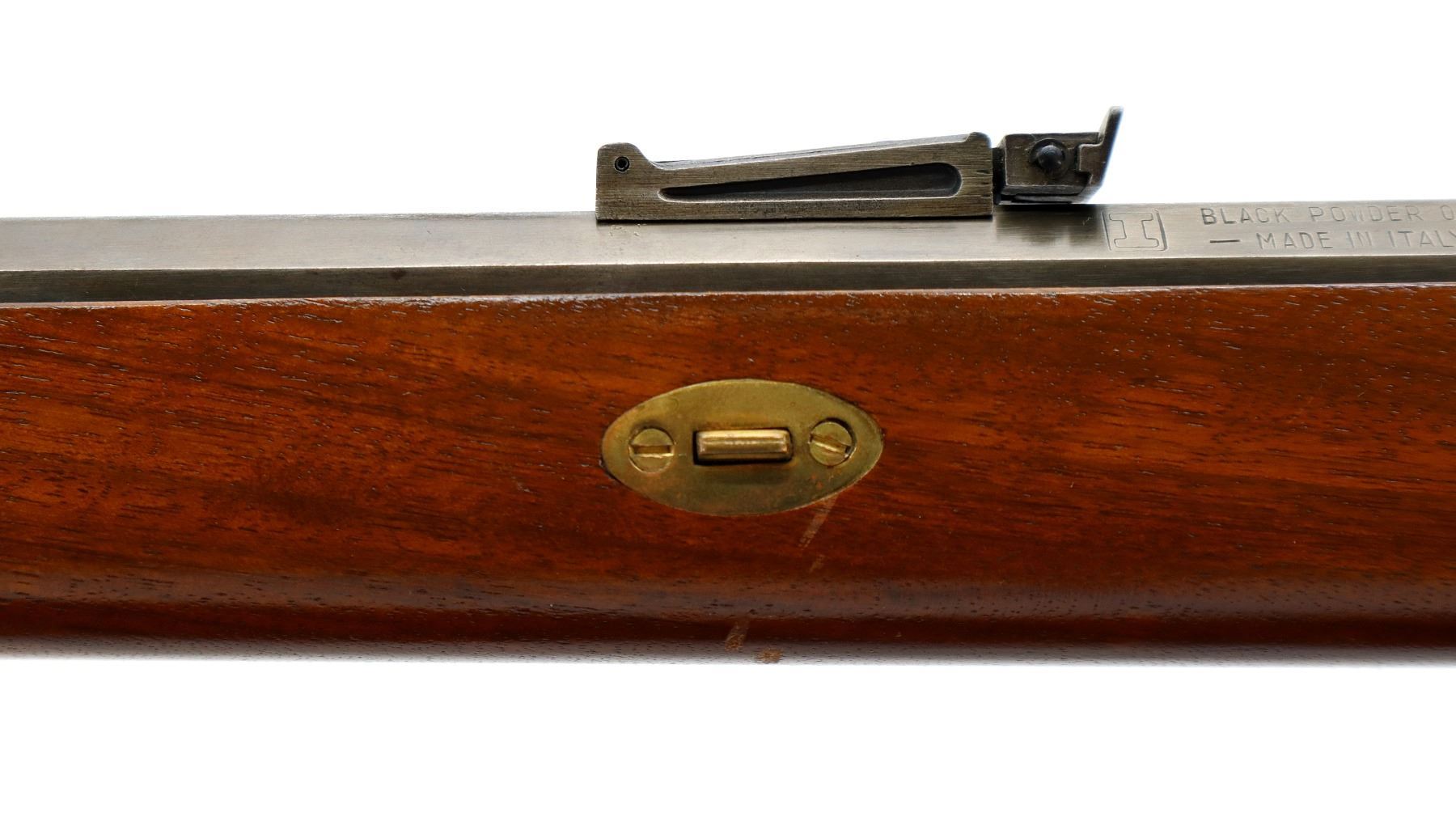 Main Description: Blade front sight, adjustable u notched rear sight, octagon barrel, engraved colour case hardened lock, grooved spur hammer that functions on double set position only, trigger requires adjustment or repair. One piece half length wood stock, single forearm wedge, straight grip, cheek rest, smooth brass butt plate, patch box, finger rest trigger guard (missing one screw), nose cap. Wood ramrod with brass tip.