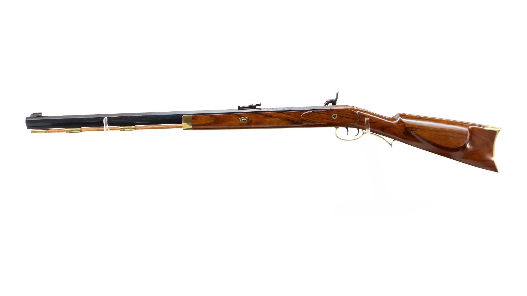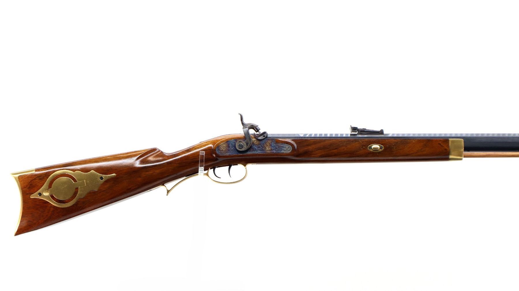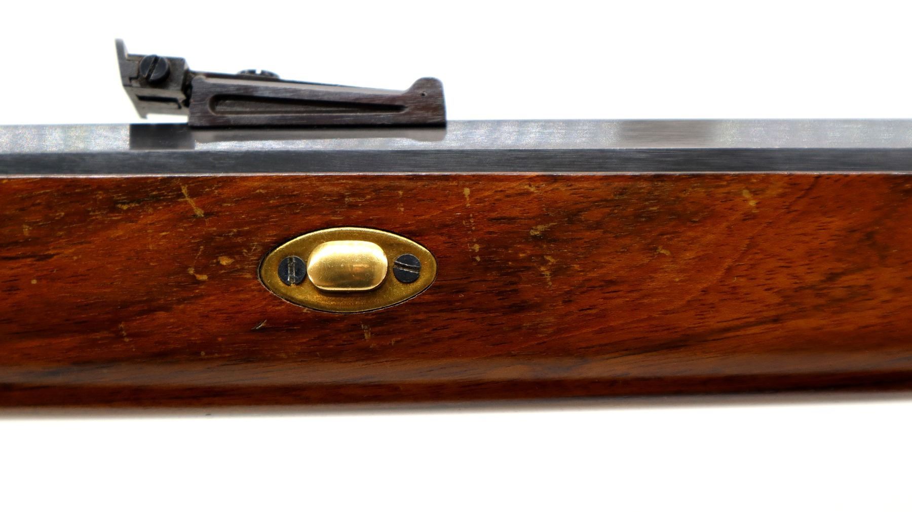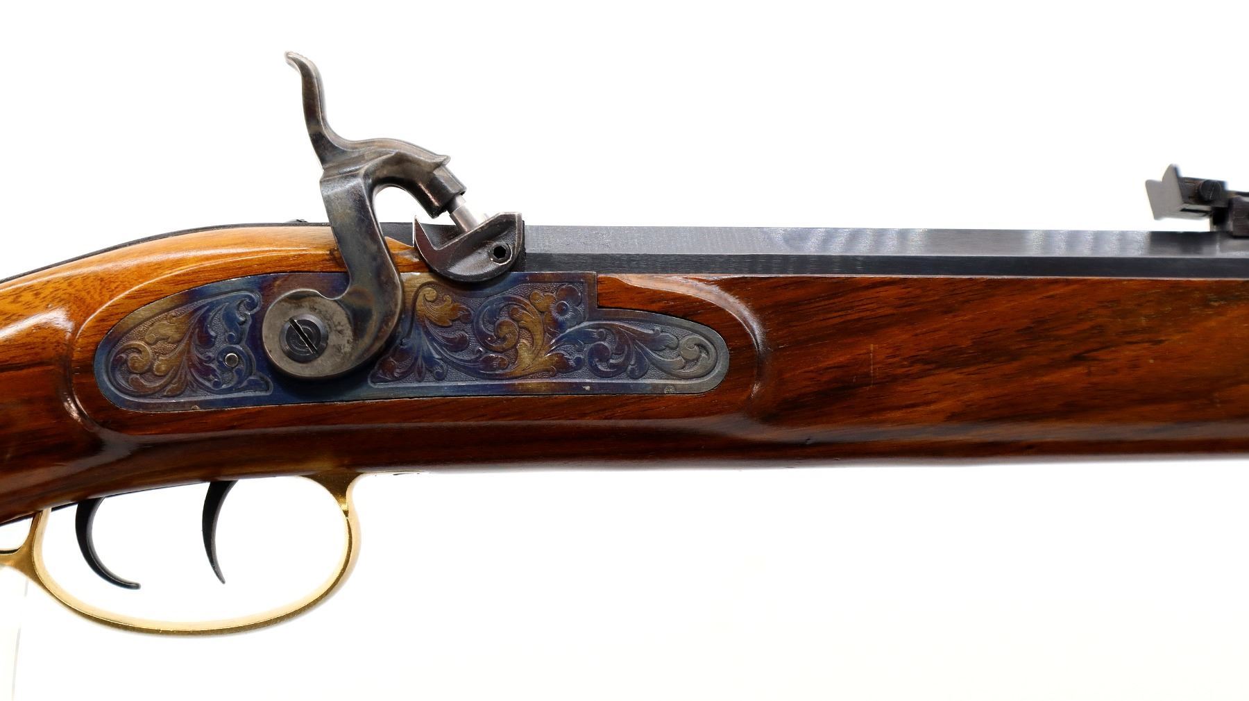 Main Description: Blade front sight, adjustable u notched rear sight, blued octagon barrel, engraved colour case hardened lock and grooved spur hammer that functions. One piece half length wood stock, single forearm wedge, straight grip, cheek rest, smooth curved brass butt plate, patch box, finger rest trigger guard and nose cap. Wood ramrod with brass tip