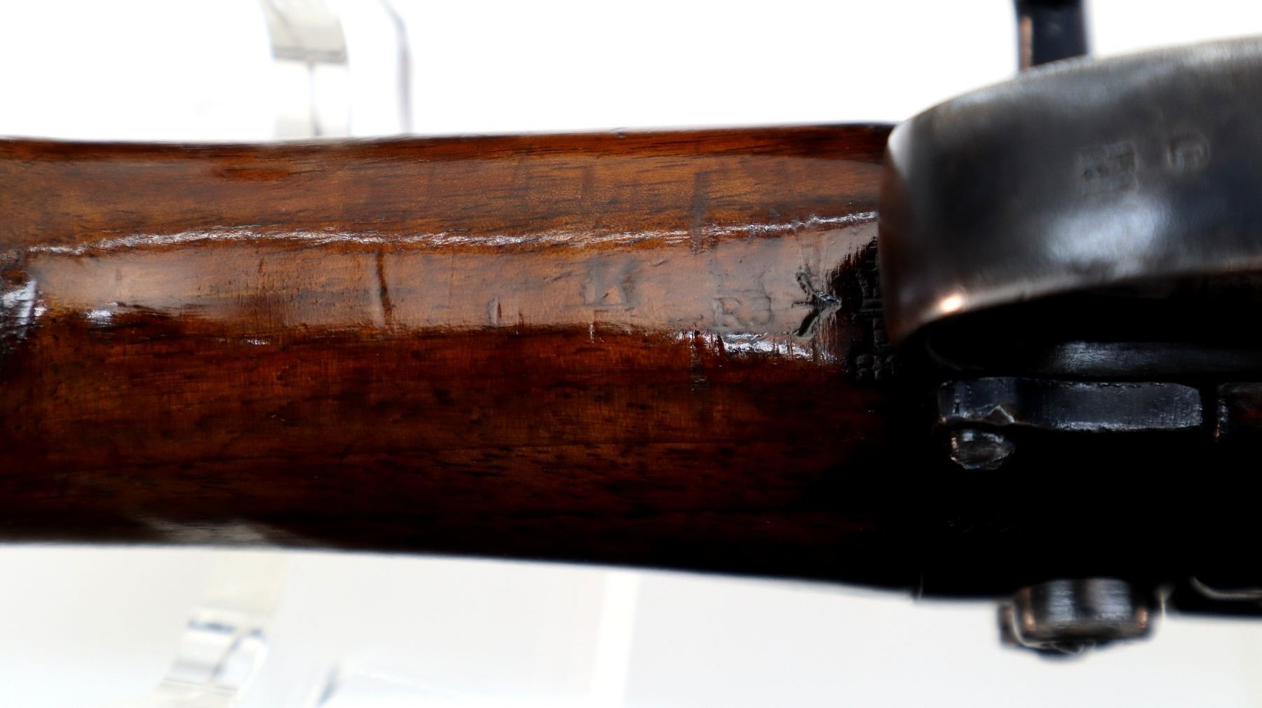 Main Description: Manufactured by FR 44, bolt and nose cap are unnumbered. Blade front sight with ears and ramp, adjustable u notched rear sight with ears, blued finish. Four piece full military wood stocks, forearm has Ishapore screw, pistol grip, smooth brass butt plate with trap, stock has armourer repair, wood stock disk, sling and stacking swivels, bayonet lug.
