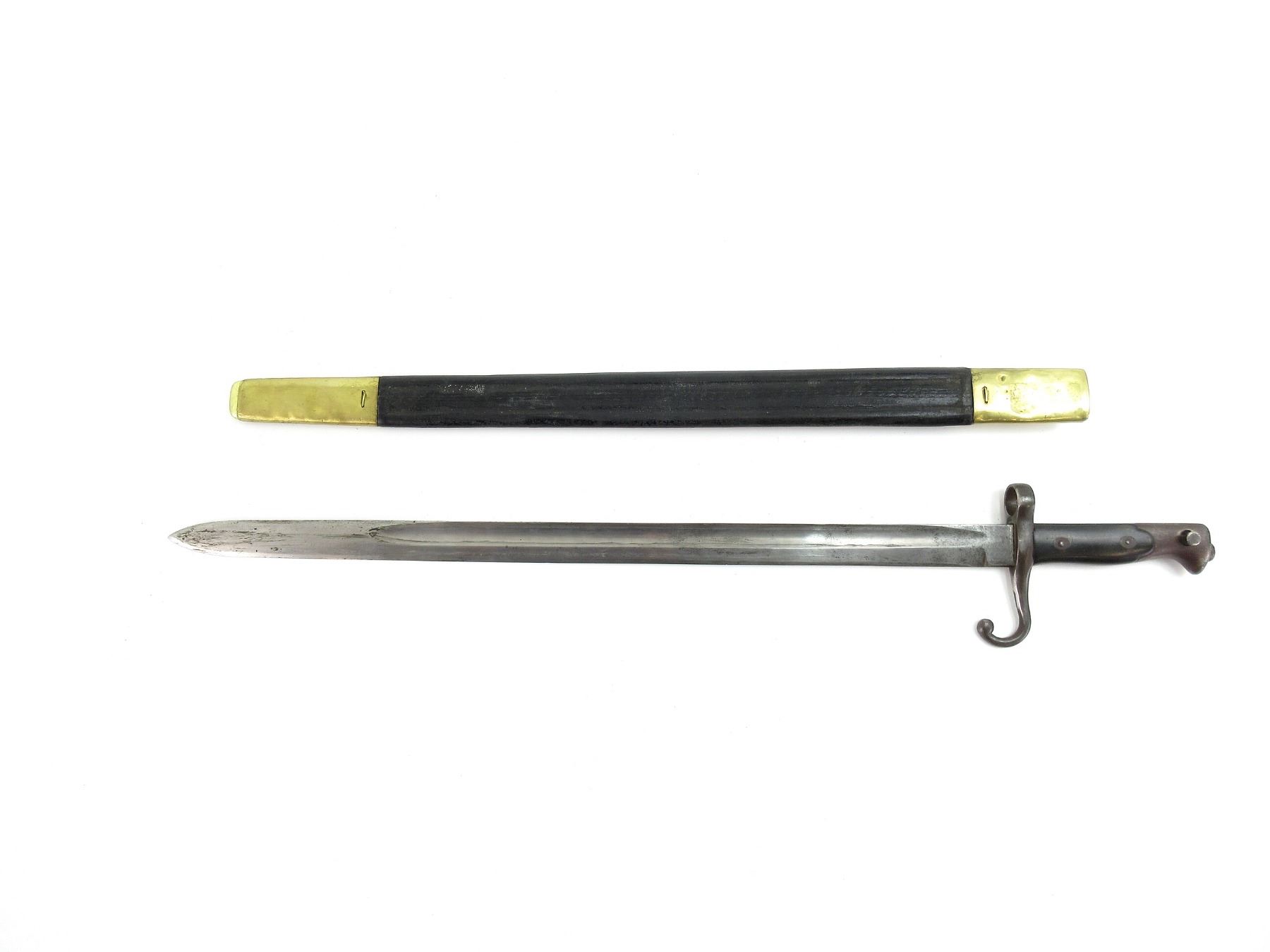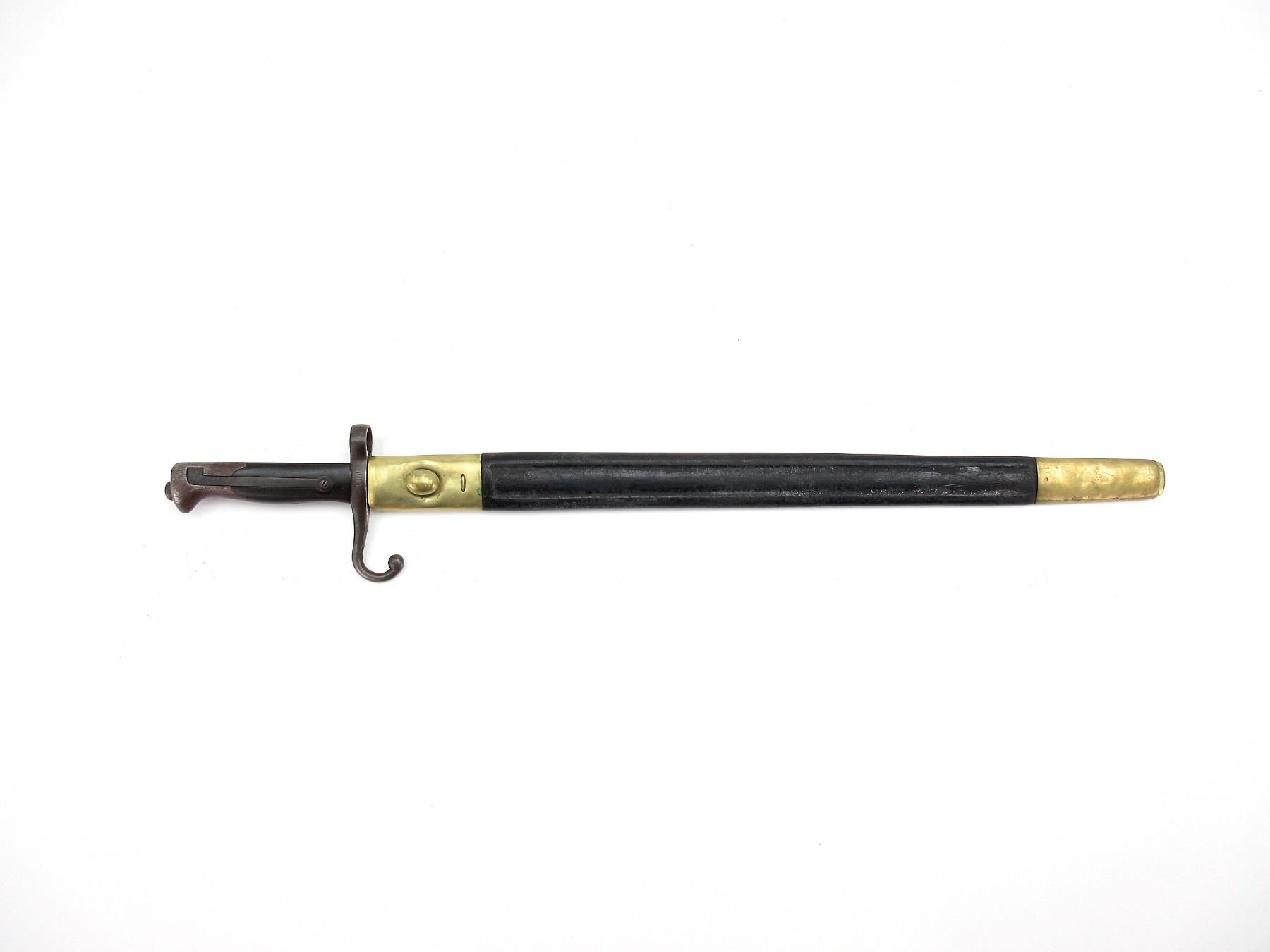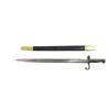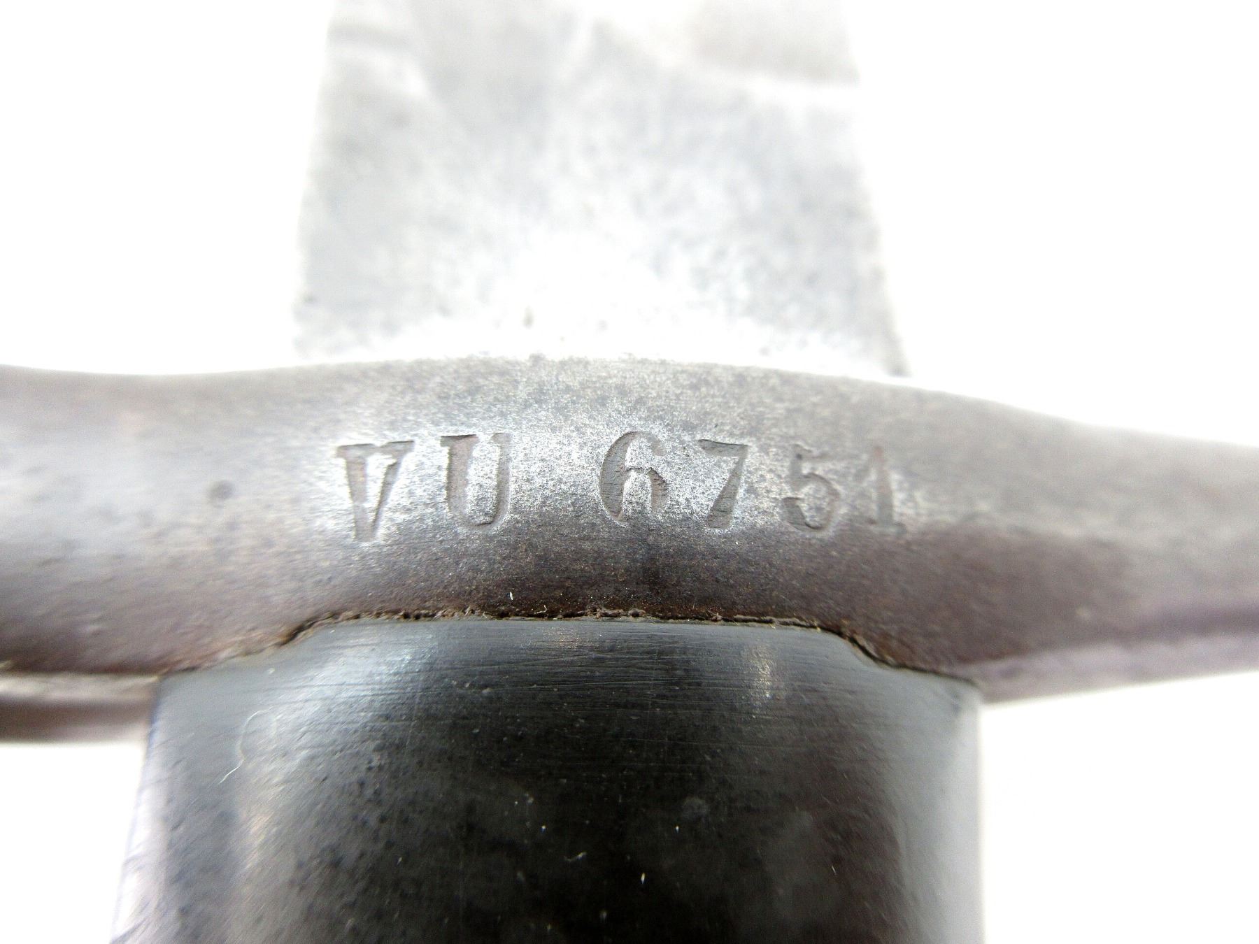(1) FITS 10.4MM M1870 VETTERLI & M1870/87 VETTERLI-VITALI RIFLES, SINGLE-FULLERED BLADE, NO VISIBLE MARKINGS, CROSS-PIECE MARKED: "VU6751", HOOKED QUILLON, BLACK 2-PIECE BAKELITE GRIP, LONG CATCH SPRING, METAL POMMEL WITH PARTIAL PROOF MARK IN SLOT, BRASS & LEATHER SCABBARD, VARIOUS PROOF MARKS ON BRASS TIP END, BLADE APPROX 20.5" & OAL APPROX 25.5". SEE PHOTOS.
