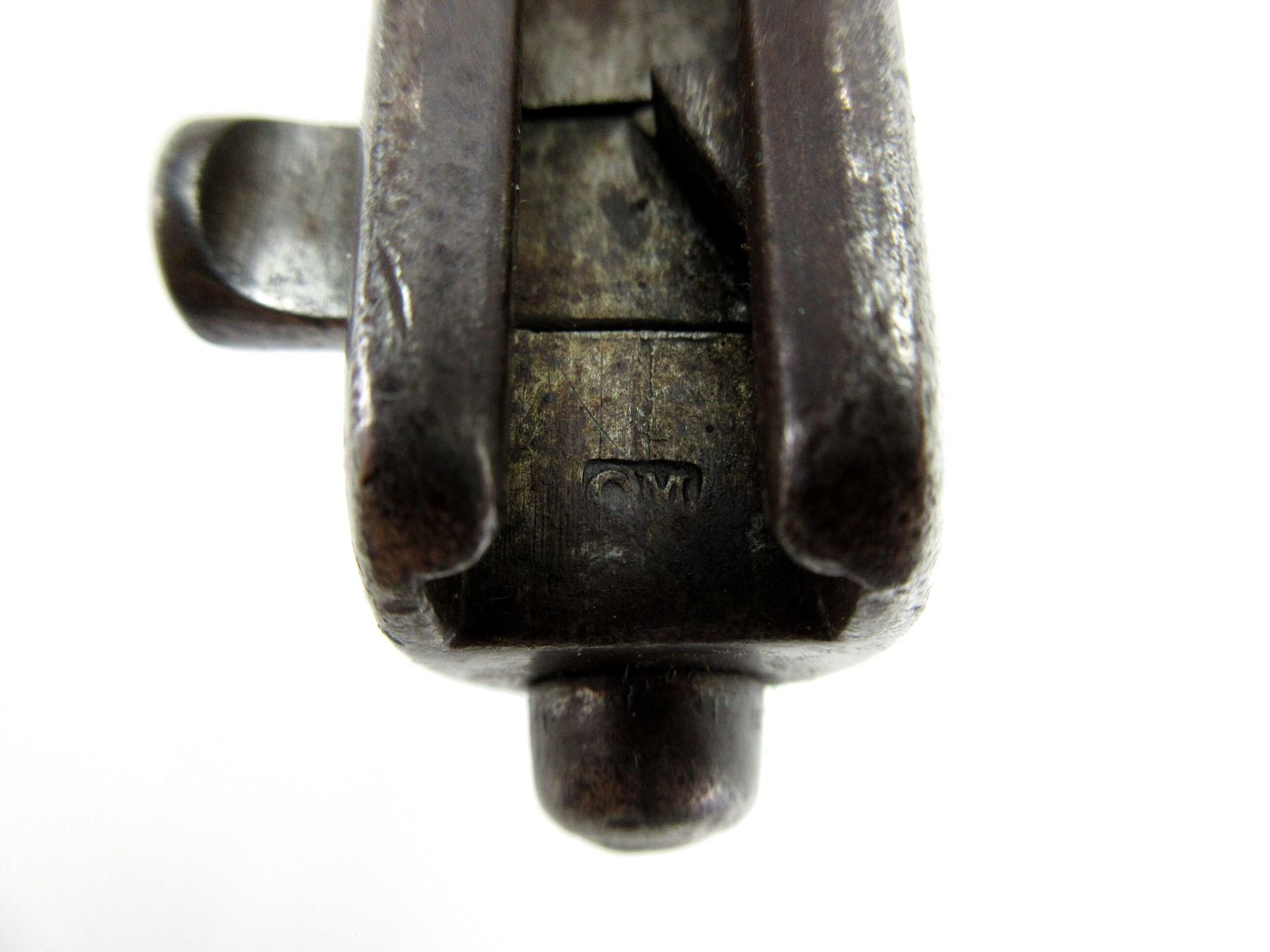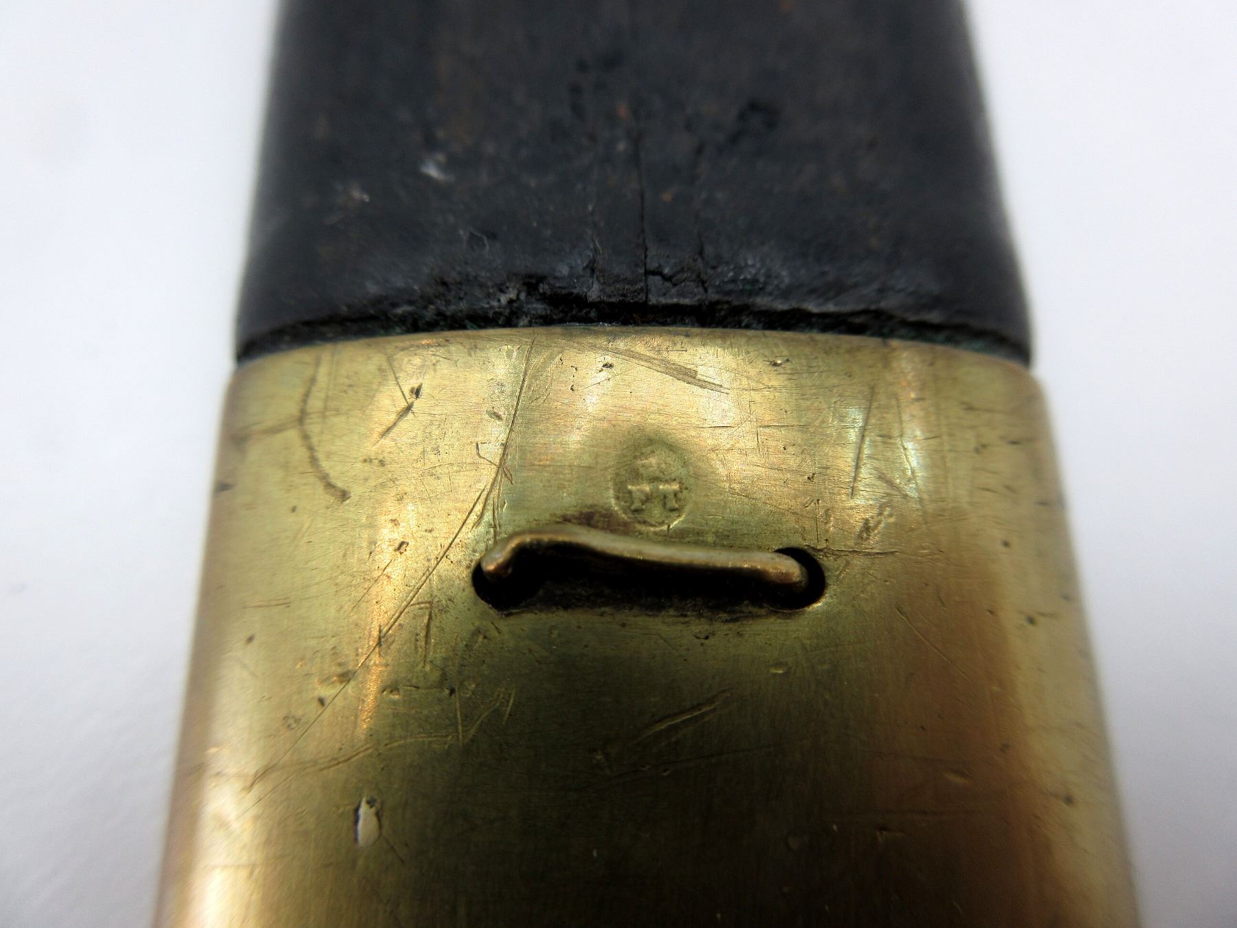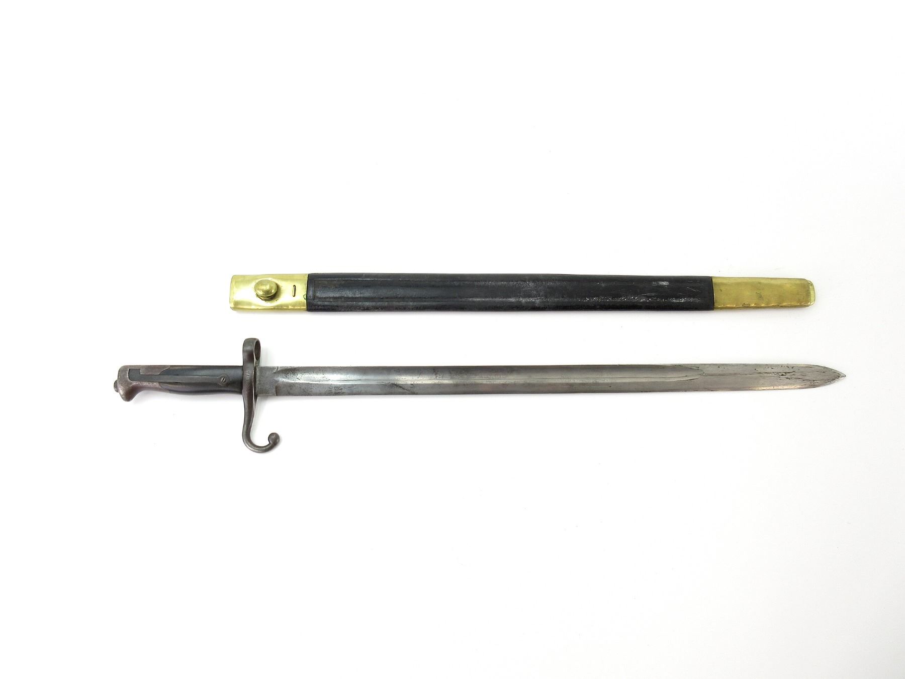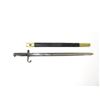 (1) FITS 10.4MM M1870 VETTERLI & M1870/87 VETTERLI-VITALI RIFLES, SINGLE-FULLERED BLADE, NO VISIBLE MARKINGS, CROSS-PIECE MARKED: "VU6751", HOOKED QUILLON, BLACK 2-PIECE BAKELITE GRIP, LONG CATCH SPRING, METAL POMMEL WITH PARTIAL PROOF MARK IN SLOT, BRASS & LEATHER SCABBARD, VARIOUS PROOF MARKS ON BRASS TIP END, BLADE APPROX 20.5" & OAL APPROX 25.5". SEE PHOTOS.
