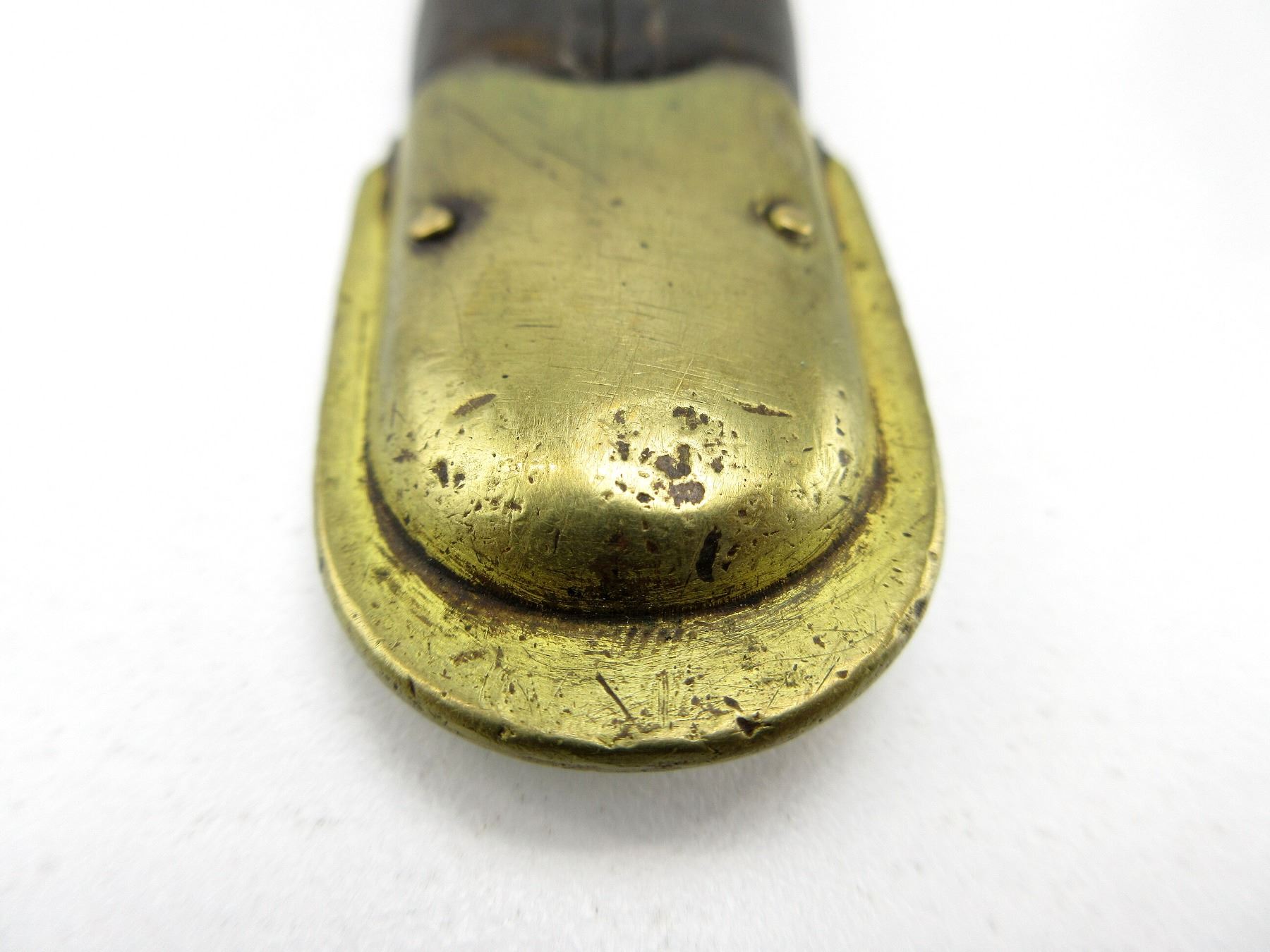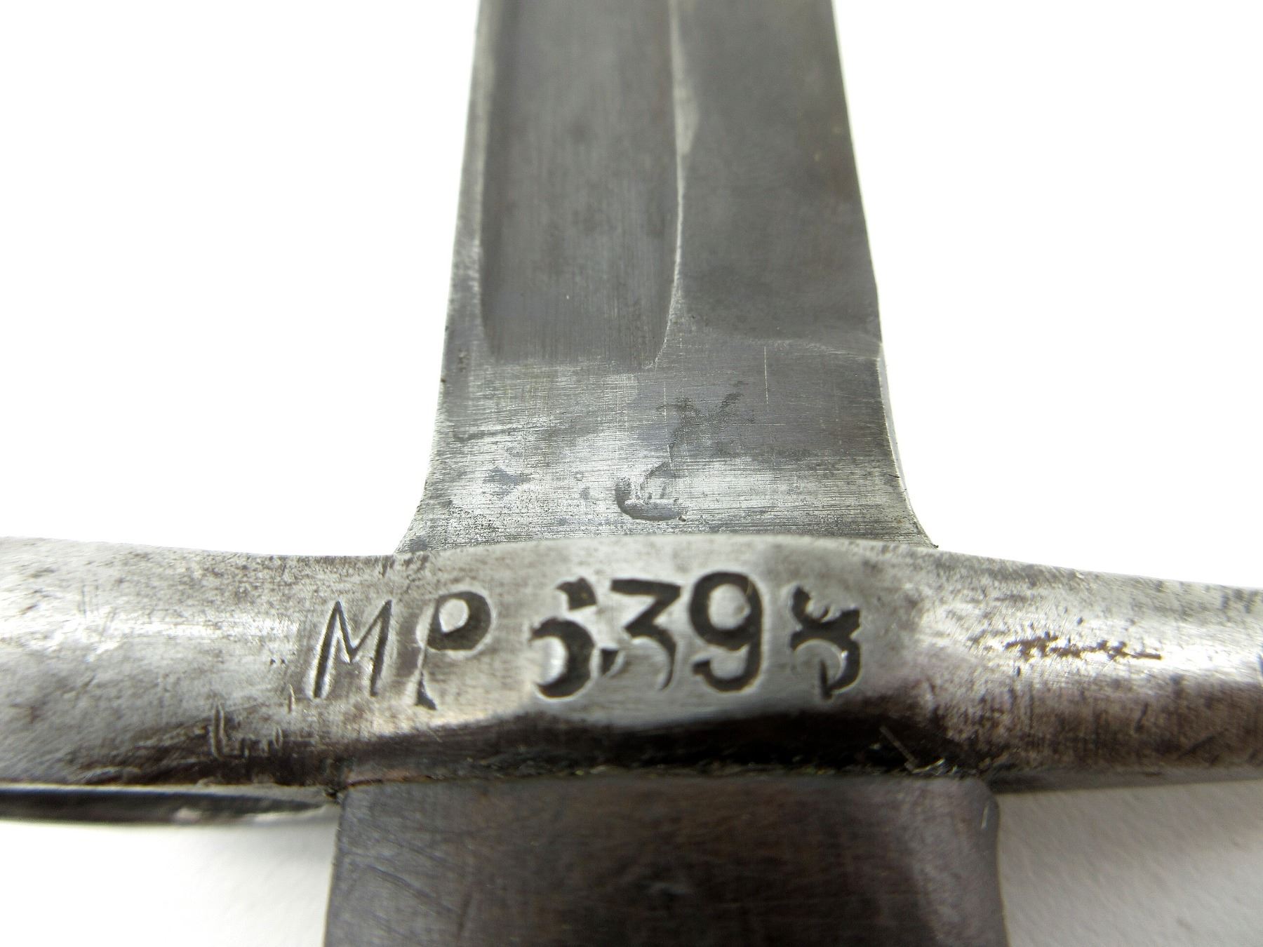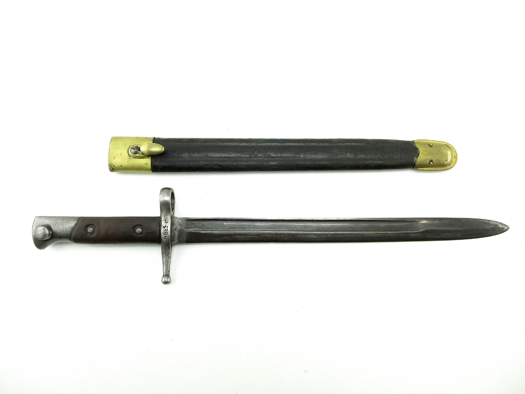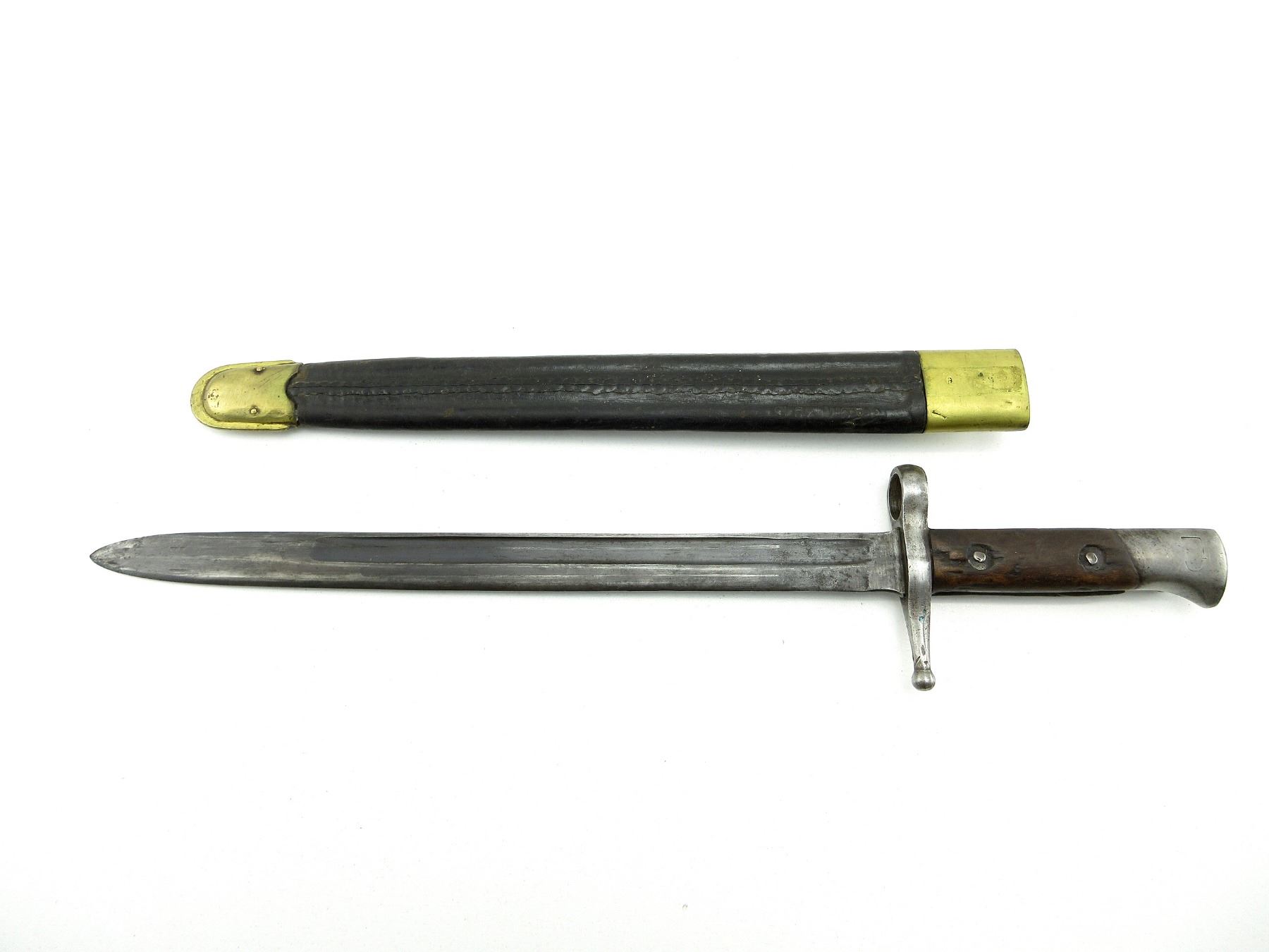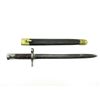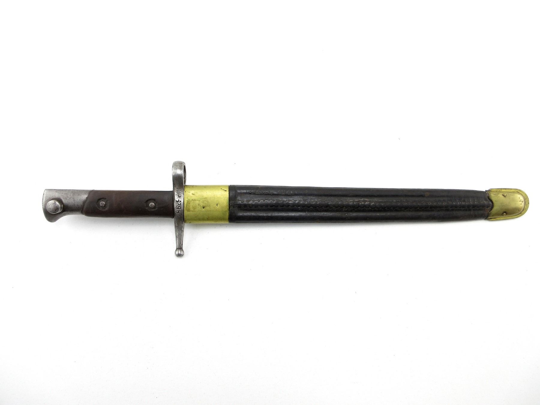 (1) M1891 CARCANO CONVERTED TO FIT THE VETTERLI M. 1871/87 RIFLE, RICASSO FAINTLY MARKED: "M", CROSS-GUARD MARKED: "MP 6398", 2-PIECE WOODEN GRIP, METAL POMMEL, NO VISIBLE MARKINGS, BRASS & LEATHER SCABBARD, FAINT PROOF MARKS ON BRASS ENDS, LEATHER MARKED: "A.C.I. 1915", BLADE APPROX. 11 7/8" & OAL APPROX. 16 3/8". SEE PHOTOS.