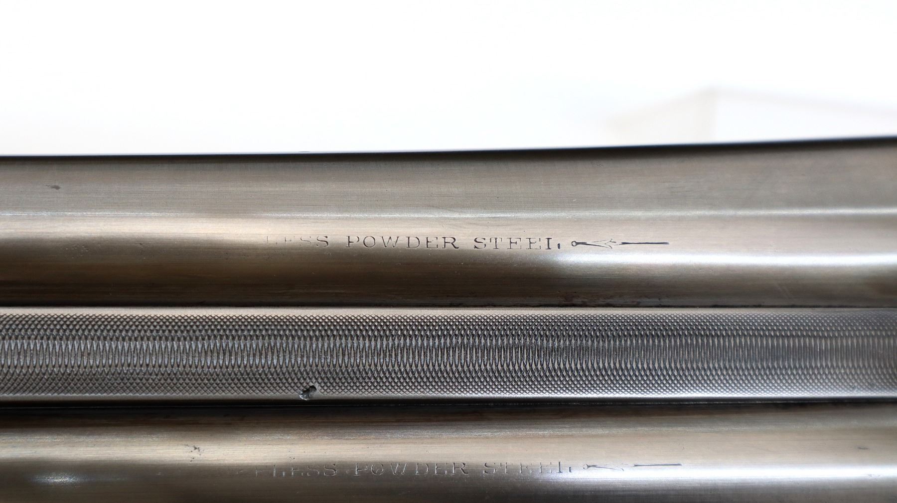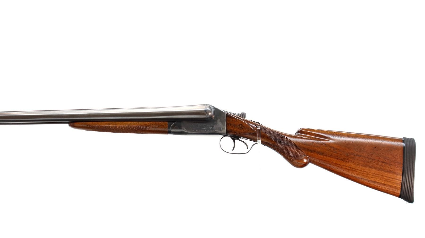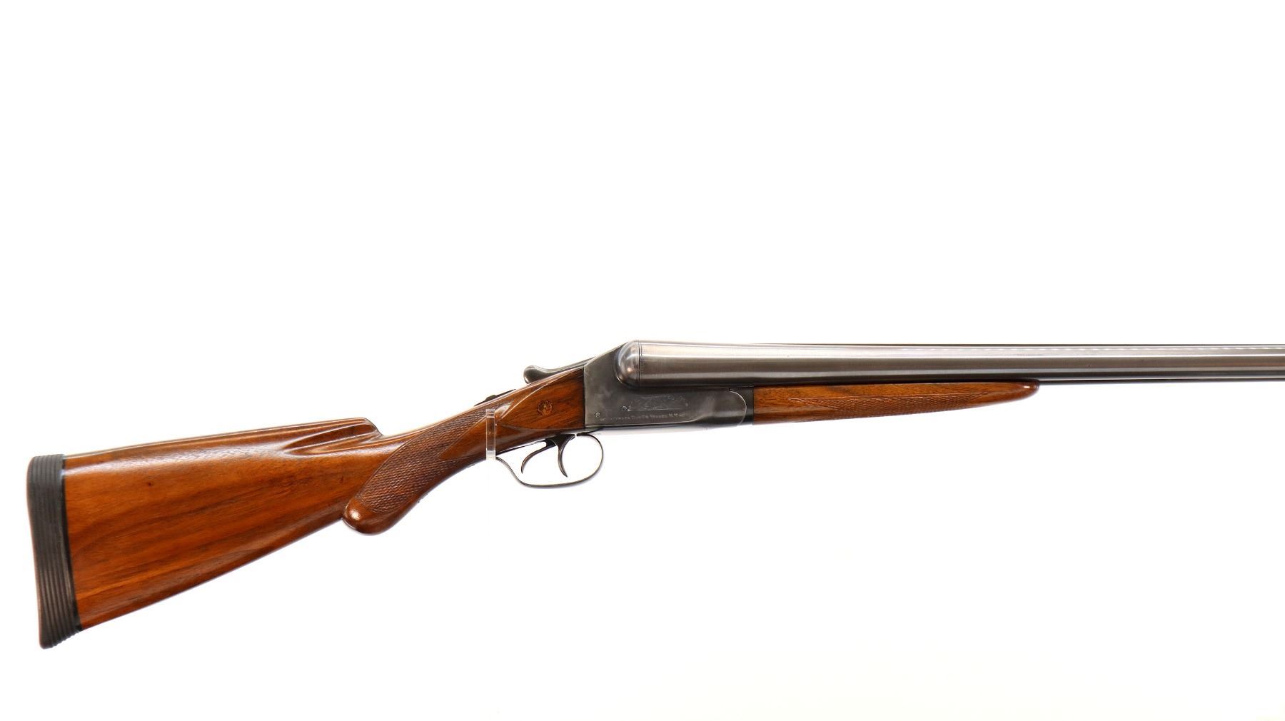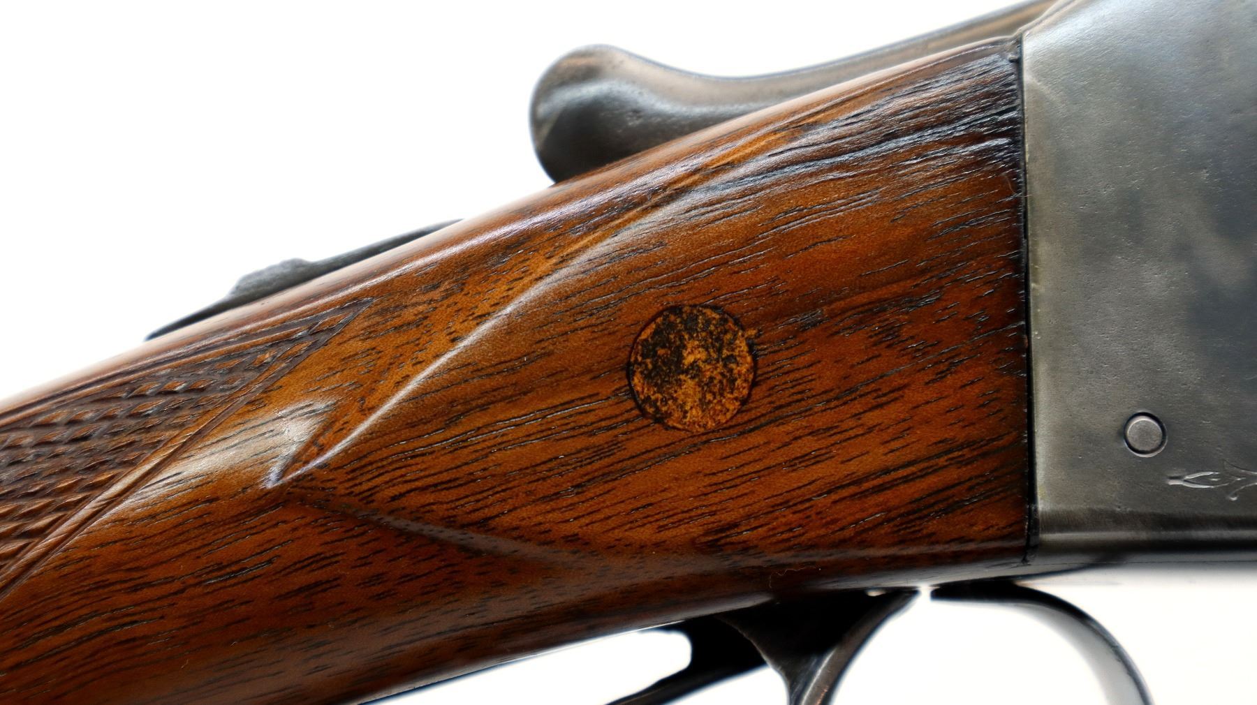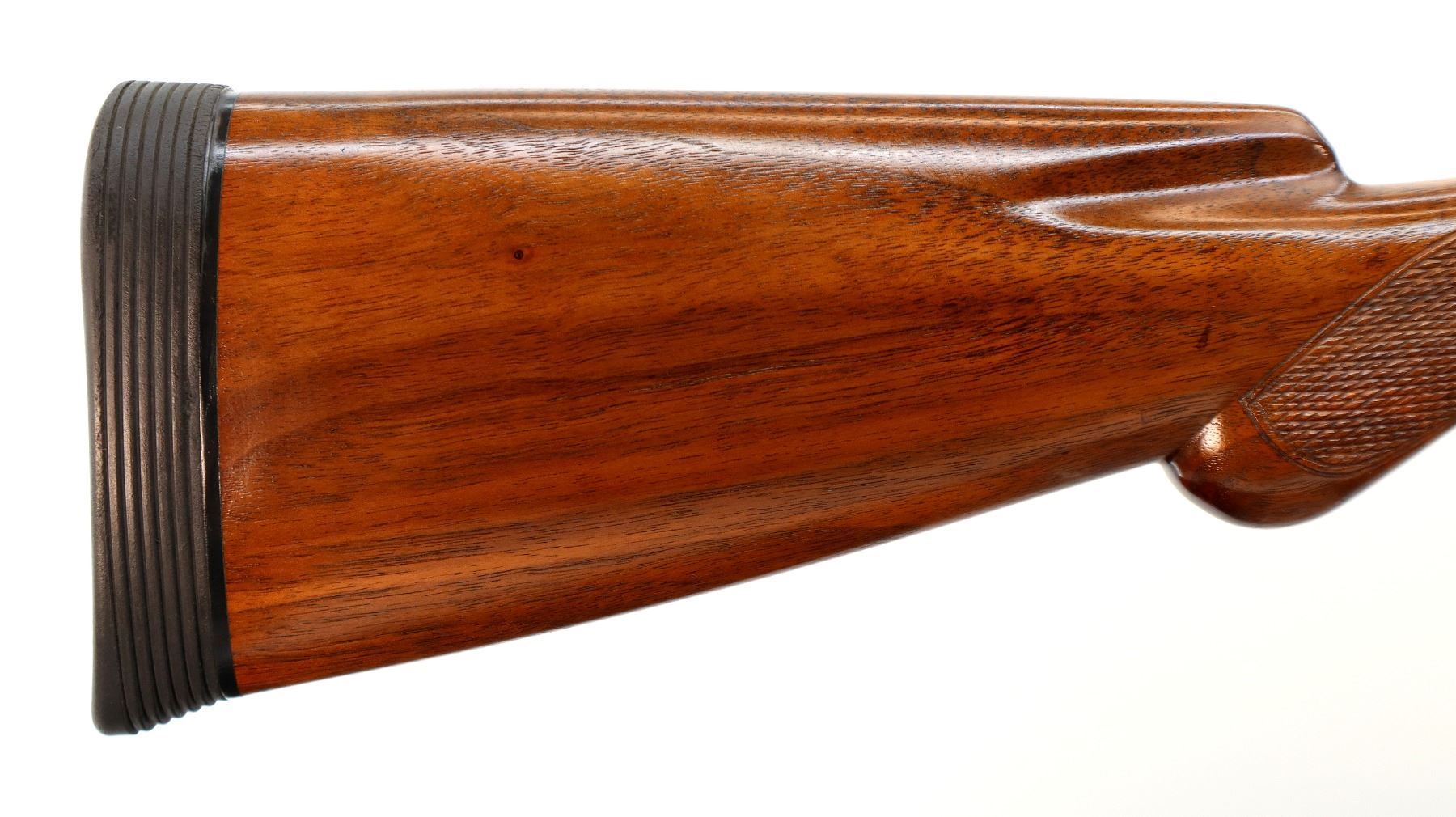 Main Description: Manufactured 1911. Ivory front bead, polished barrels with raised rib marked smokeless powder steel that chime that are slightly loose on face, automatic safety, extractor, double triggers. Two piece wood stocks, checkered splinter forearm and pistol grip with wood plugs on both sides, modern black rubber recoil pad, 14.25" LOP 2" DAC 3" DAH. Bores are 0.769 right and 0.768 left side.