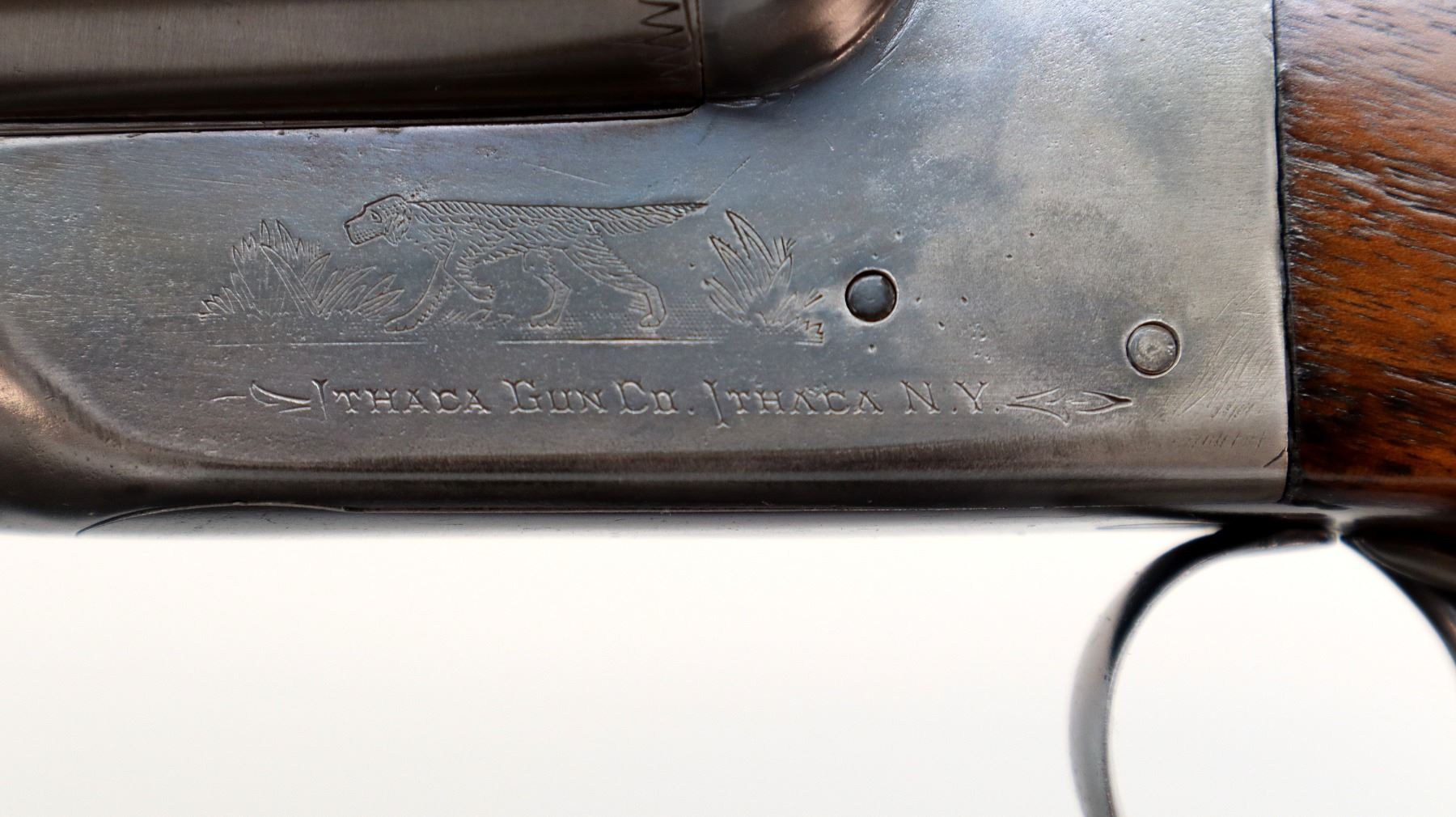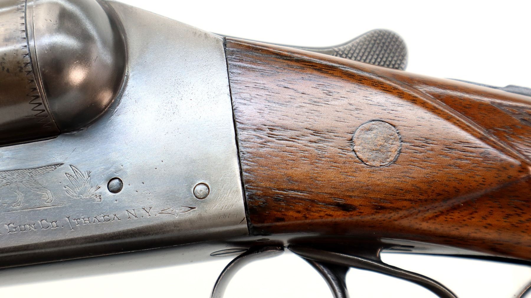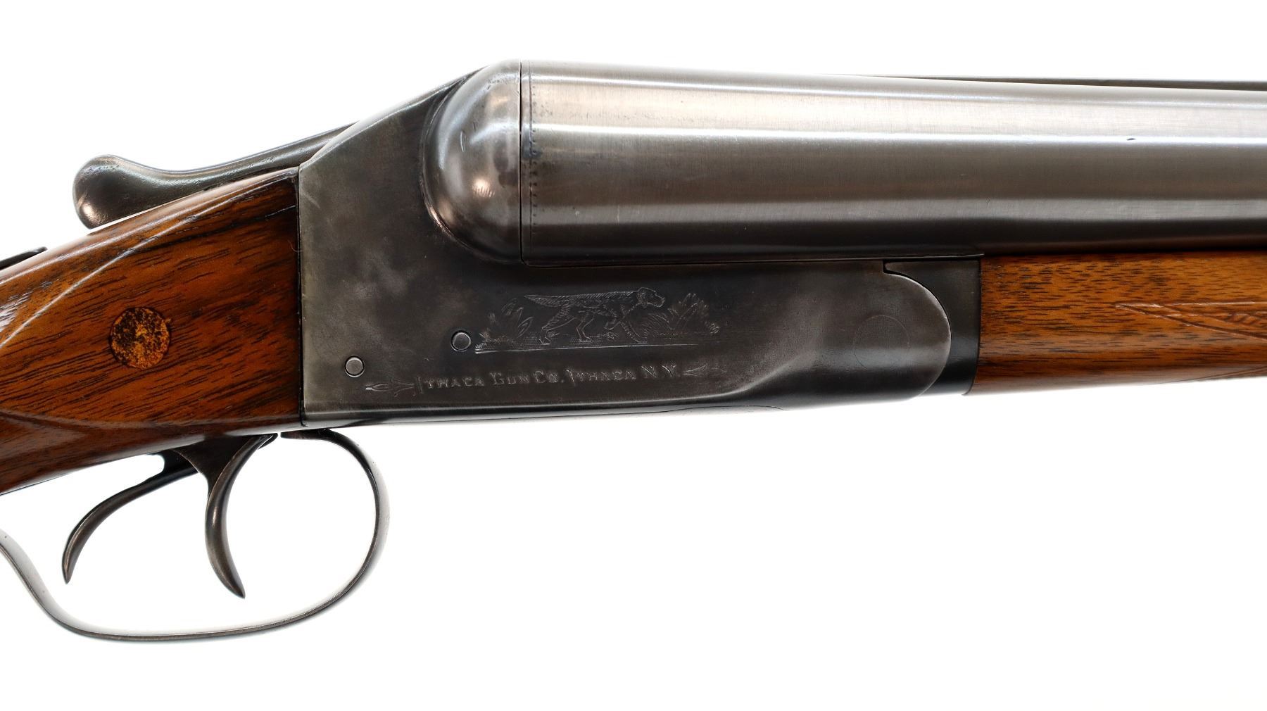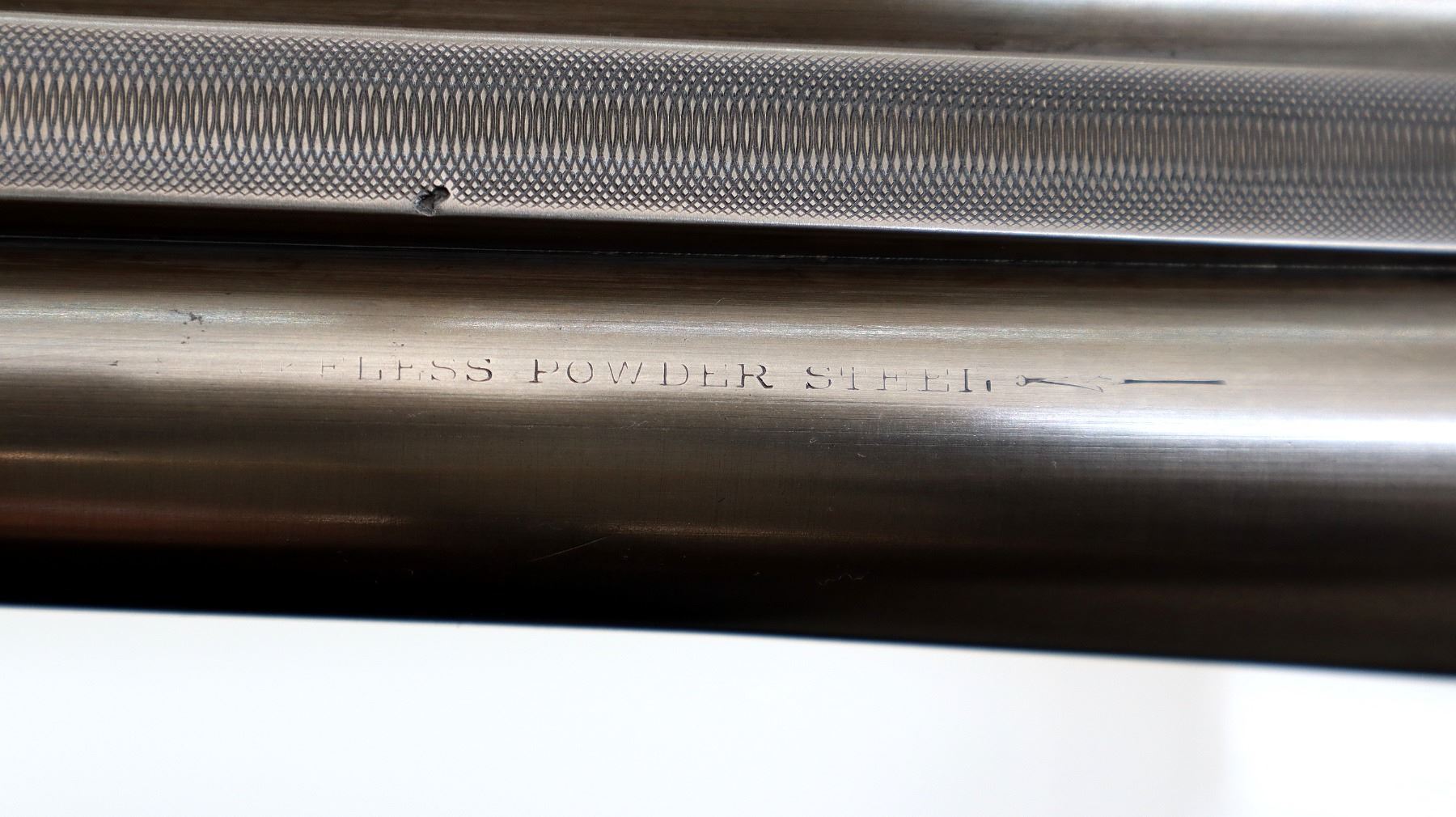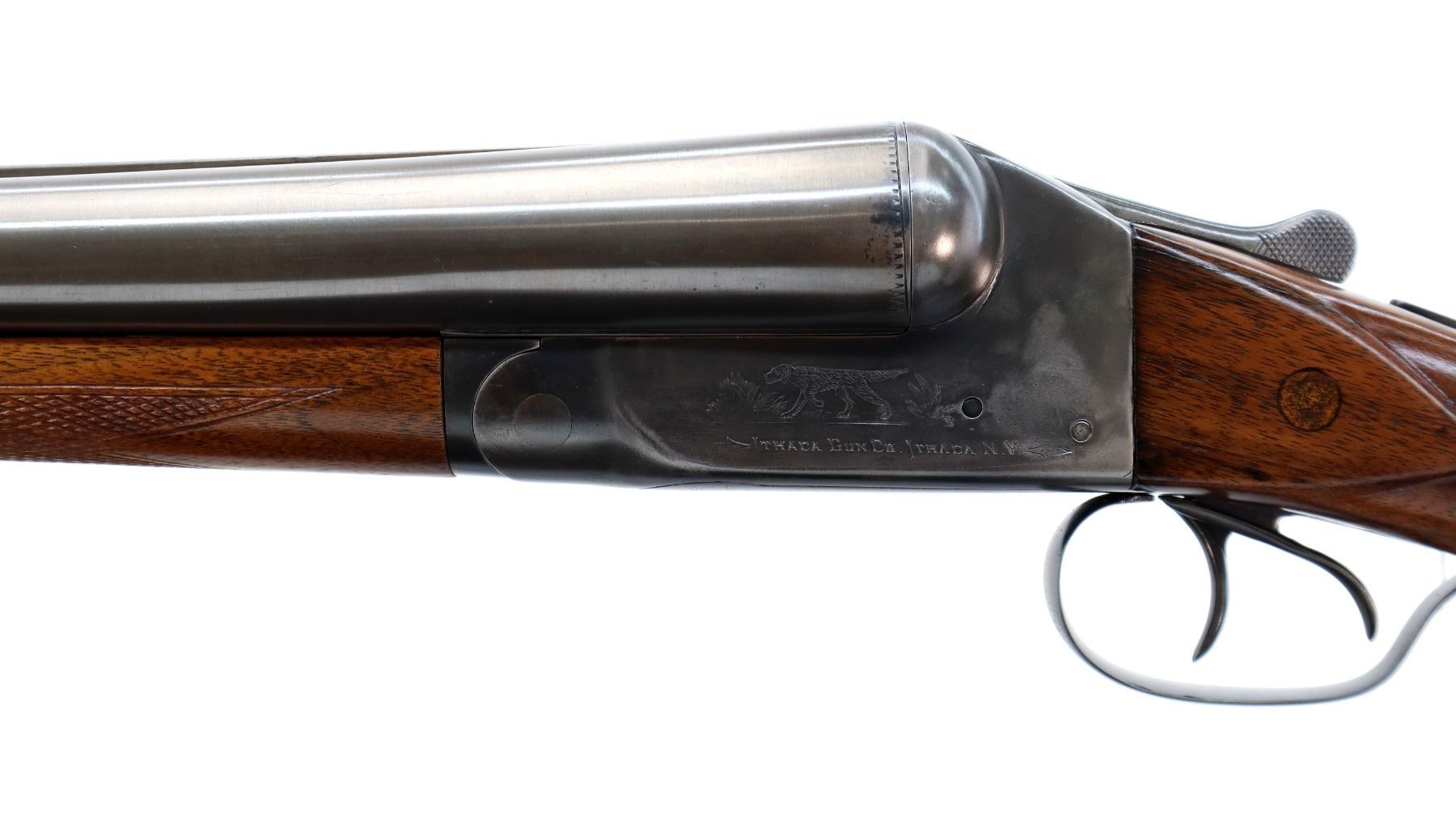 Main Description: Manufactured 1911. Ivory front bead, polished barrels with raised rib marked smokeless powder steel that chime that are slightly loose on face, automatic safety, extractor, double triggers. Two piece wood stocks, checkered splinter forearm and pistol grip with wood plugs on both sides, modern black rubber recoil pad, 14.25" LOP 2" DAC 3" DAH. Bores are 0.769 right and 0.768 left side.