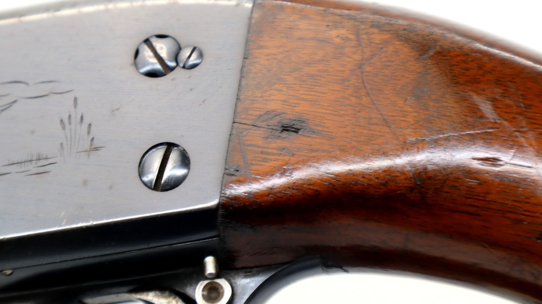 Main Description: Barrel shortened missing bead, blued finish, engraved receiver. Two piece wood stocks, grooved forearm, pistol grip cracked behind receiver, red vented rubber recoil pad, 13.5" LOP.