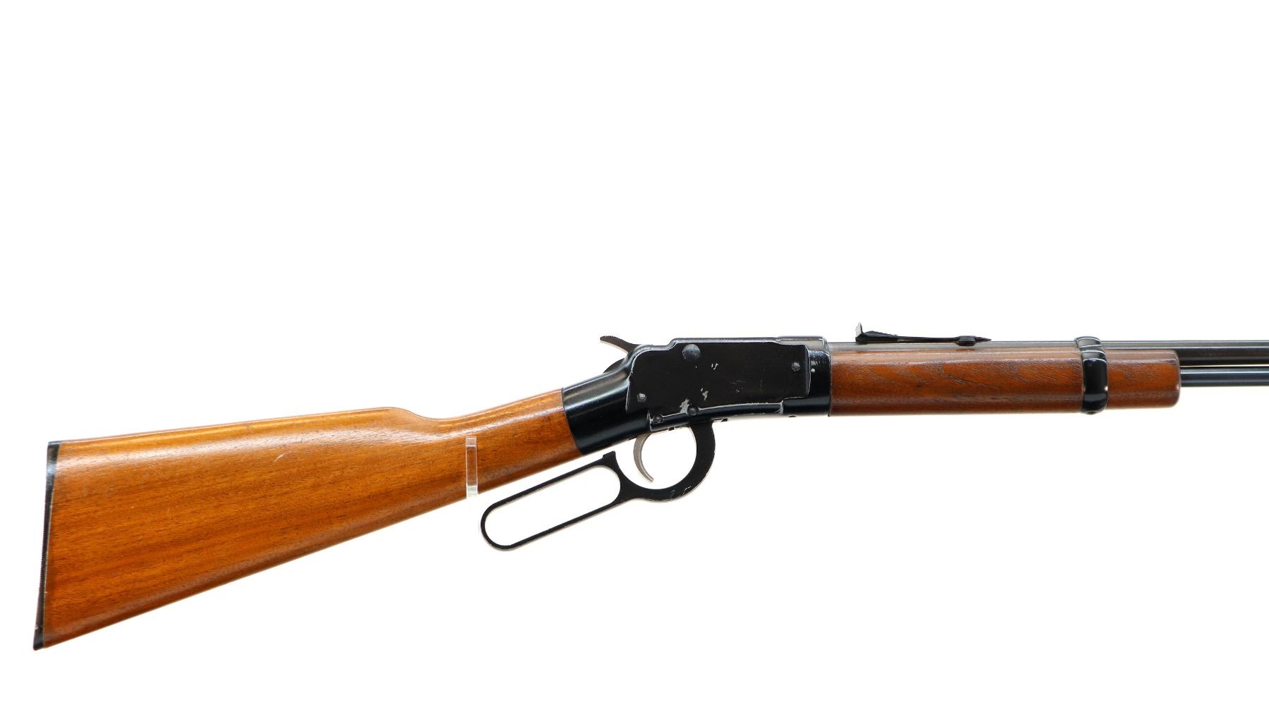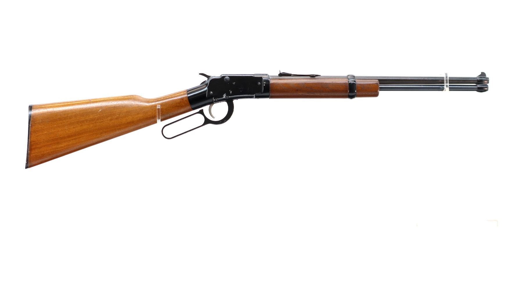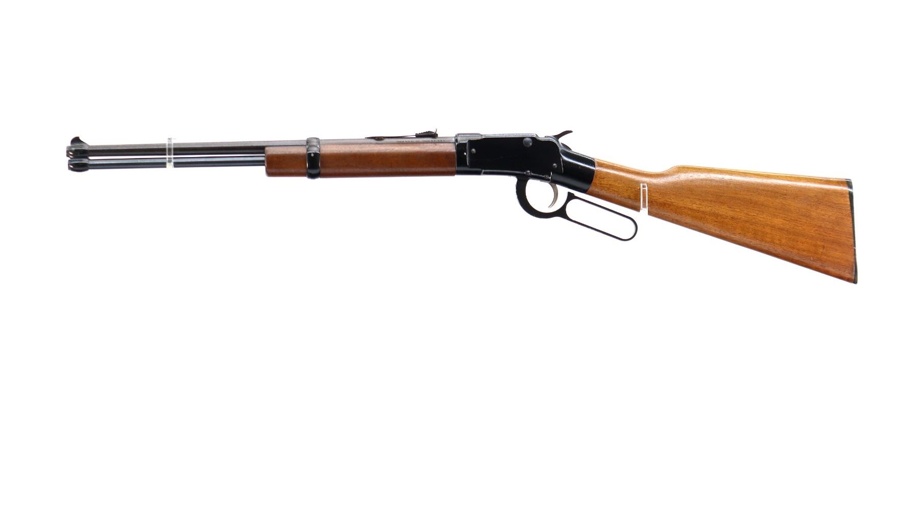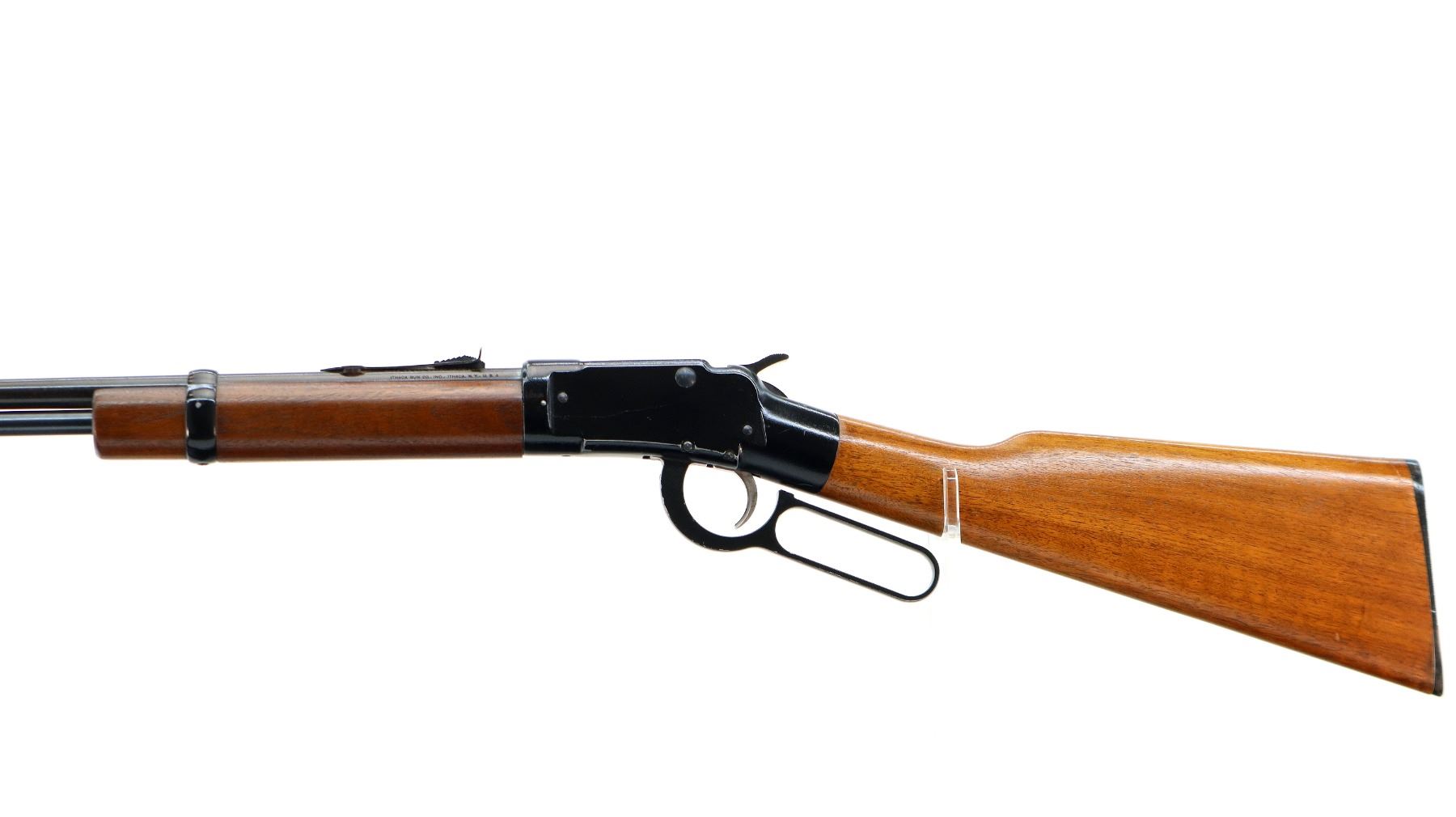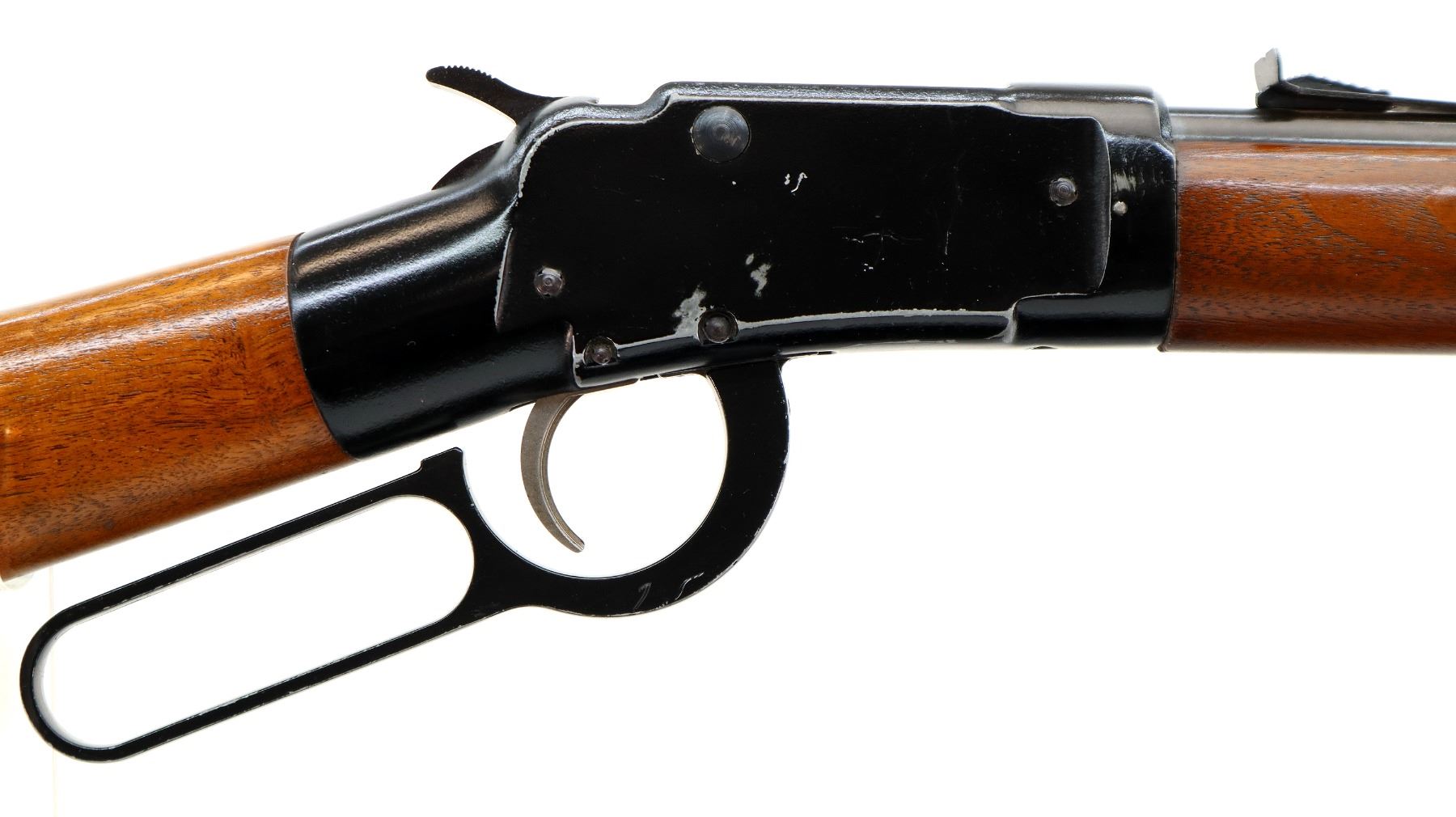Main Description: Blade front sight, adjustable u notched rear sight, blued round barrel and dummy magtube, black alloy receiver, grooved spur hammer. Two piece wood stocks, forearm is loose, straight grip, grooved black polymer butt plate