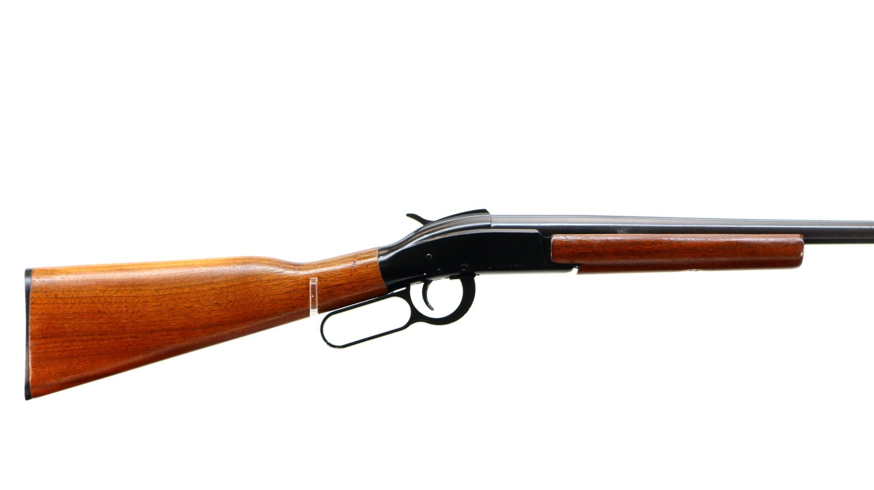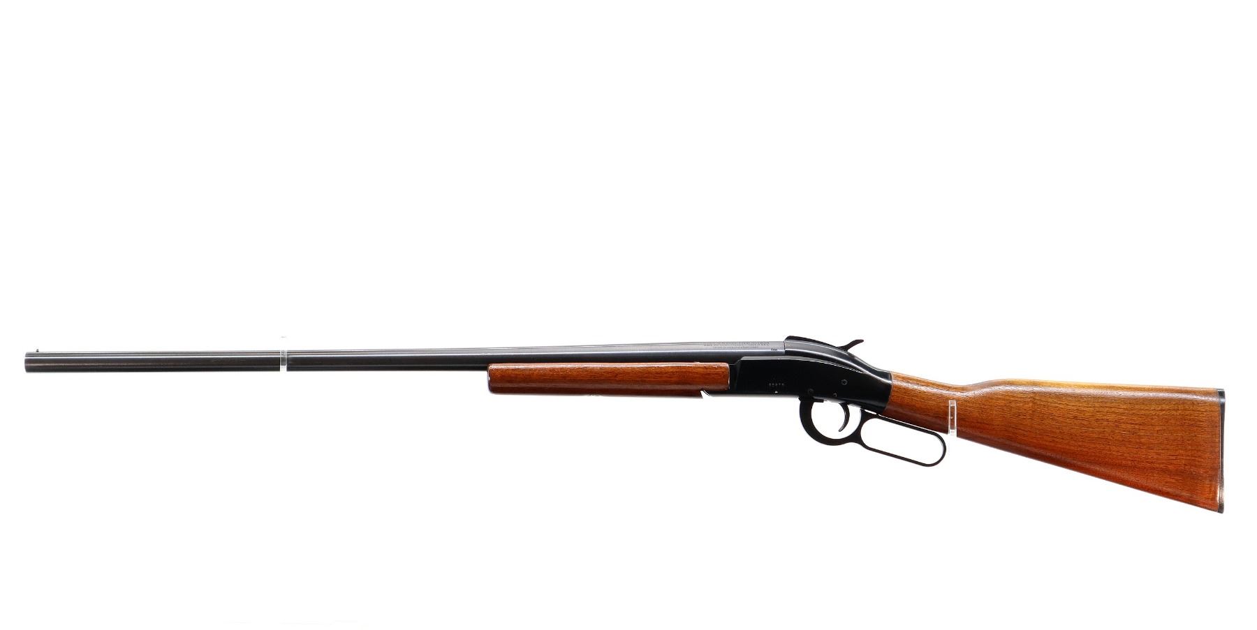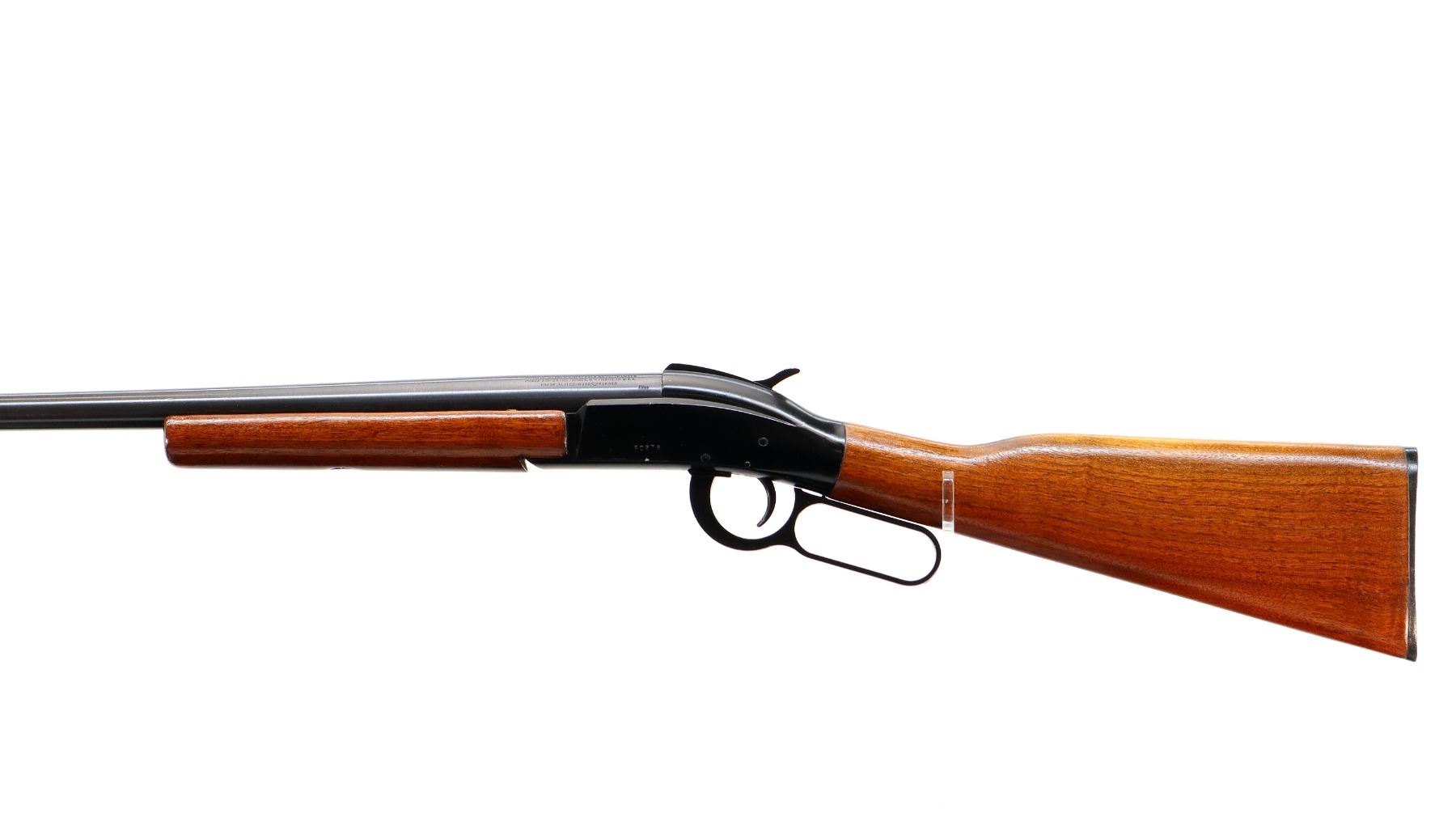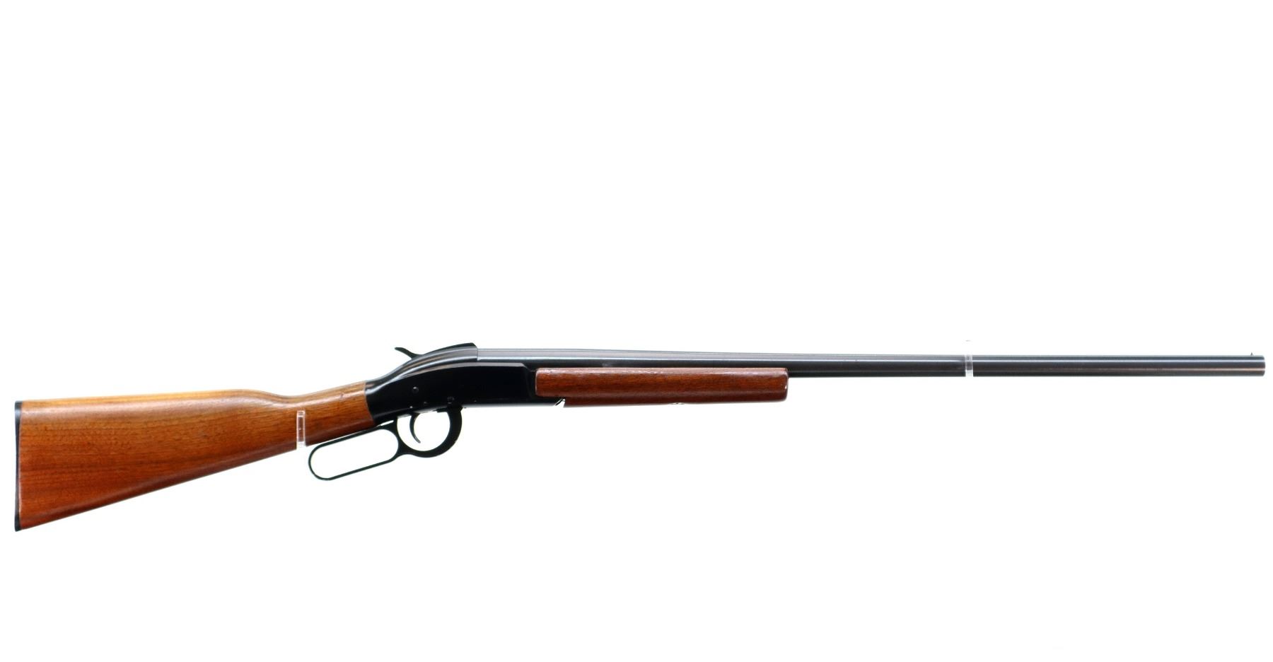 Main Description: Brass bead, blued round barrel, black alloy receiver, grooved spur hammer, extractor. Two piece wood stocks, straight grip, grooved black polymer butt plate.