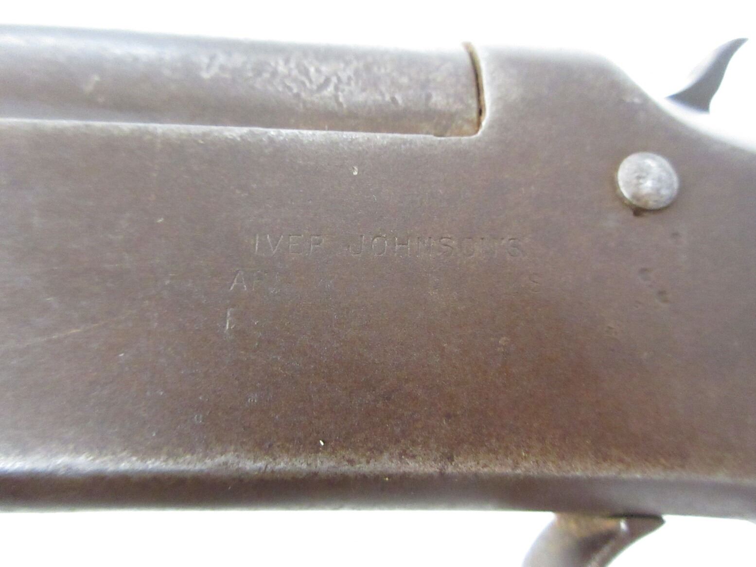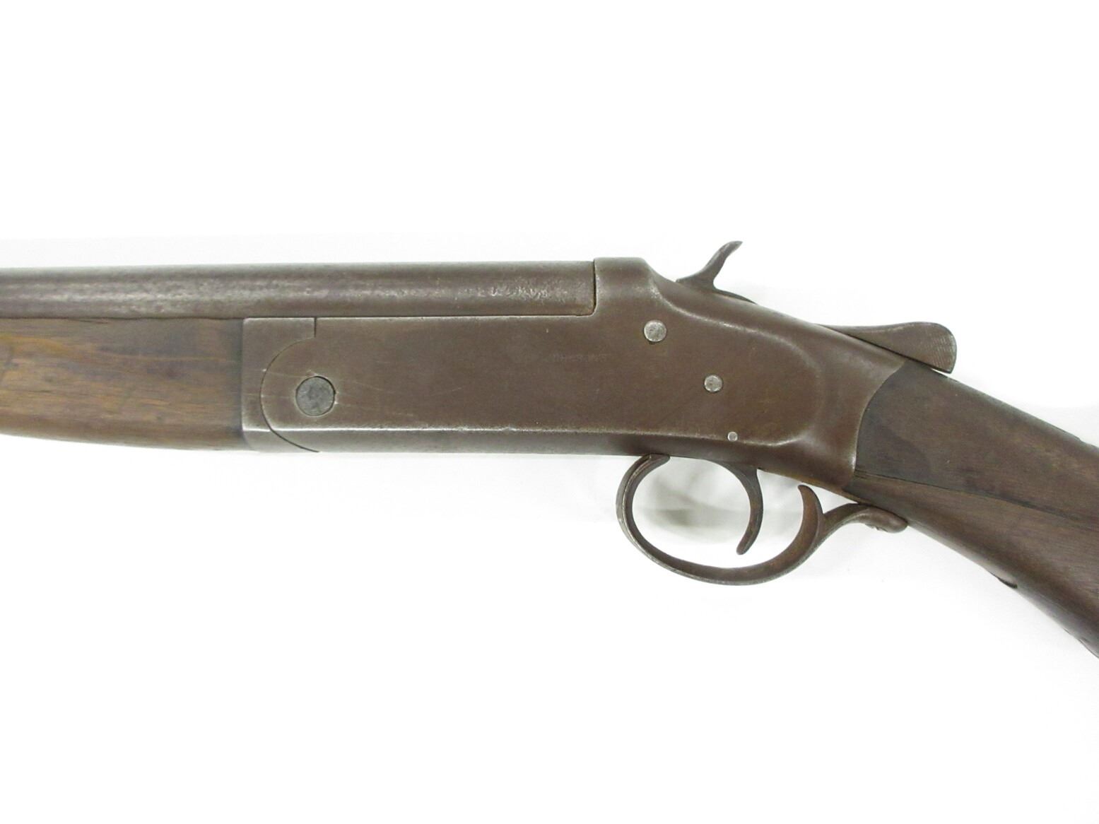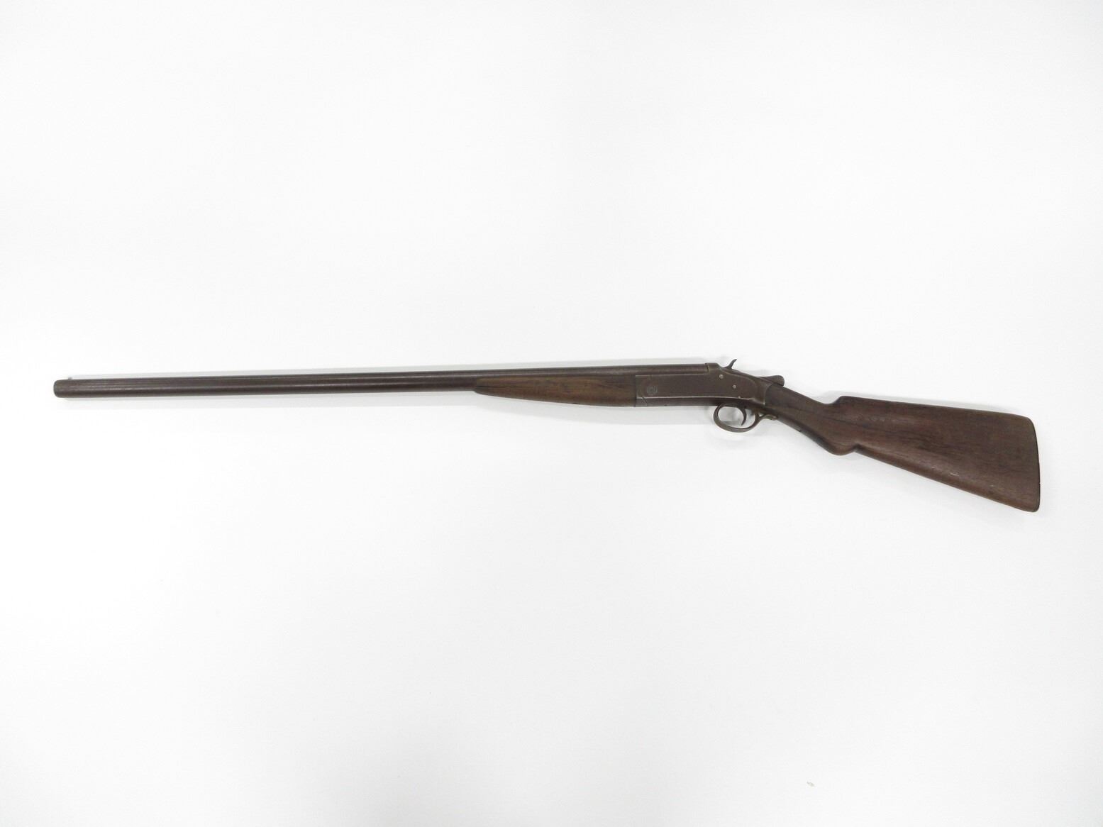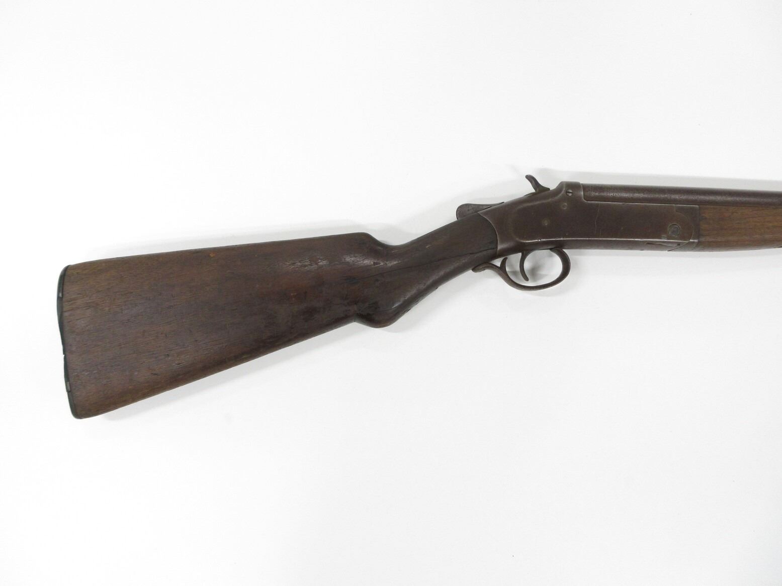 PARTS GUN. IVER JOHNSON. MODEL: CHAMPION. CALIBER: 12 G X 2 5/8". BORE IS POOR, PITTED. FIXED FULL CHOKE. STEEL BEAD, ROUND BARREL LOOSE ON FACE, CHECKERED SPUR HAMMER, EXTRACTOR. TWO PIECE WOOD STOCKS, FOREARM IS CRACKED ON BOTH SIDES, PISTOL GRIP, CRACKED BEHIND RECEIVER AND BOTH TANGS, BLACK POLYMER BUTT PLATE WHICH IS CRACKED AND BROKEN. METAL FINISH TURNING BROWN WITH PITTING, RUST, HANDLING MARKS AND WEAR. STOCKS SHOW MARKS, SCRATCHES AND WEAR. ACTION: HINGED SINGLE SHOT SHOTGUN. BARREL LENGTH: 30". SERIAL # NA. CONDITION: PARTS GUN, THIS ITEM IS SOLD FOR PARTS USE ONLY. SOME PARTS AND COMPONENTS MAY NOT BE PRESENT AND OR FUNCTIONAL. UNDER NO CIRCUMSTANCES ATTEMPT TO USE THIS ITEM AS A FUNCTIONAL FIREARM. CLASS: CANADIAN NON RESTRICTED