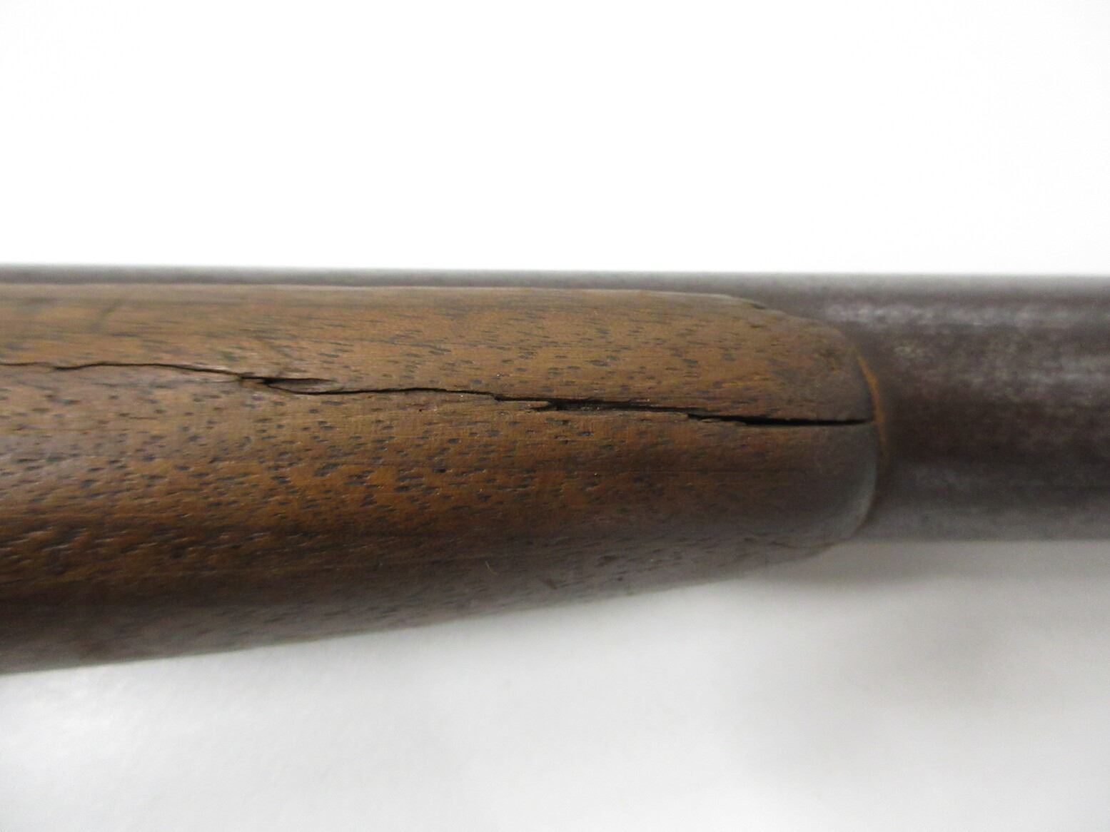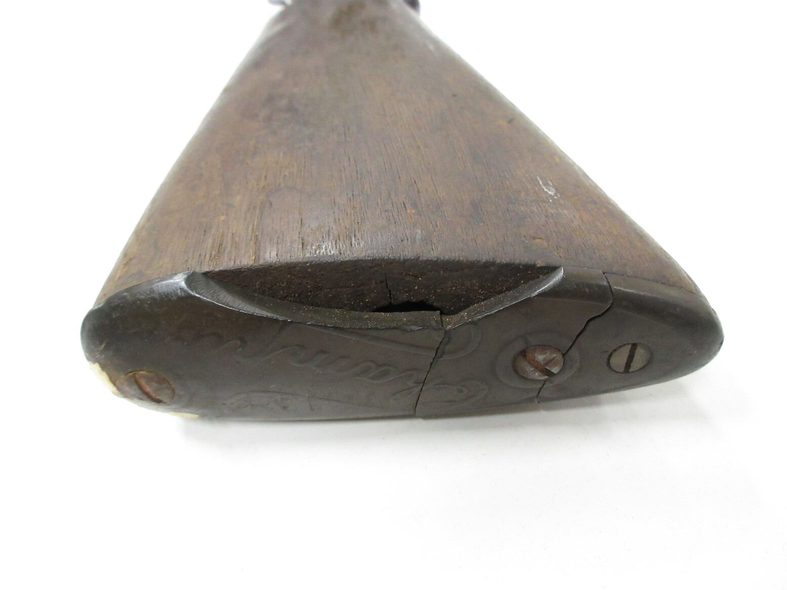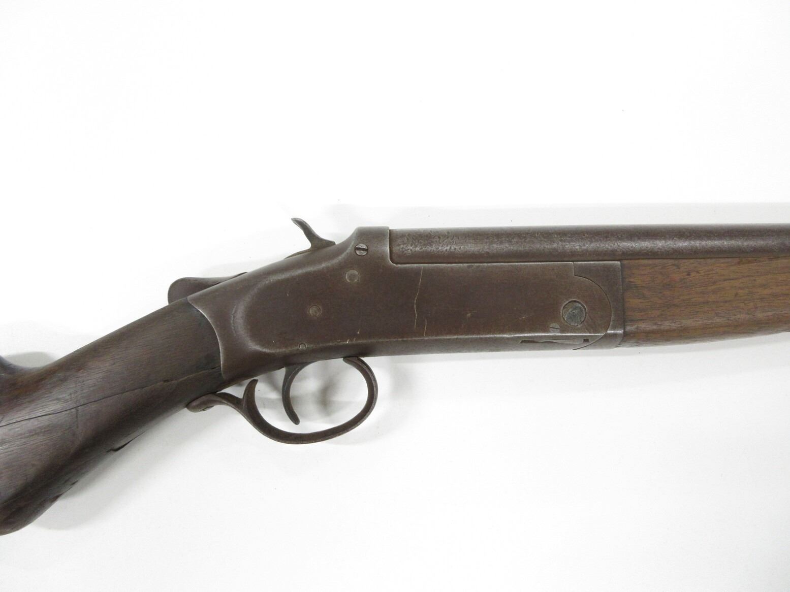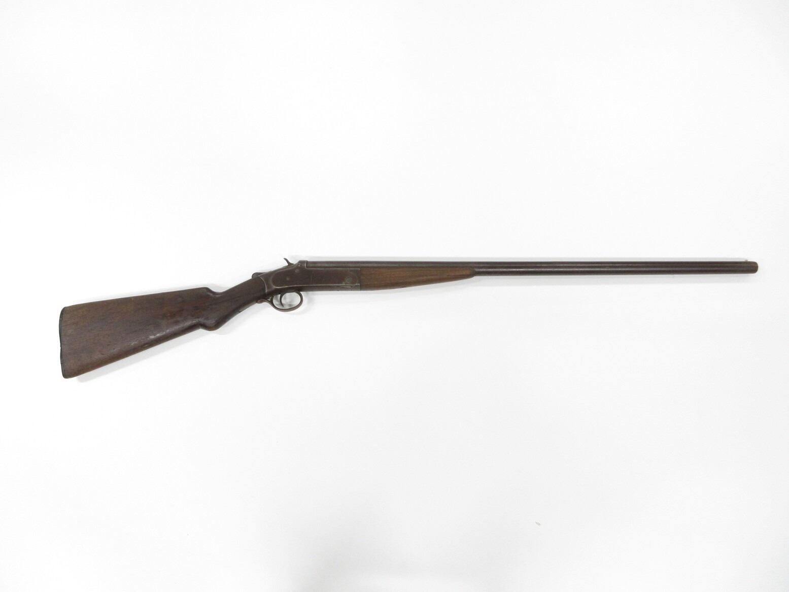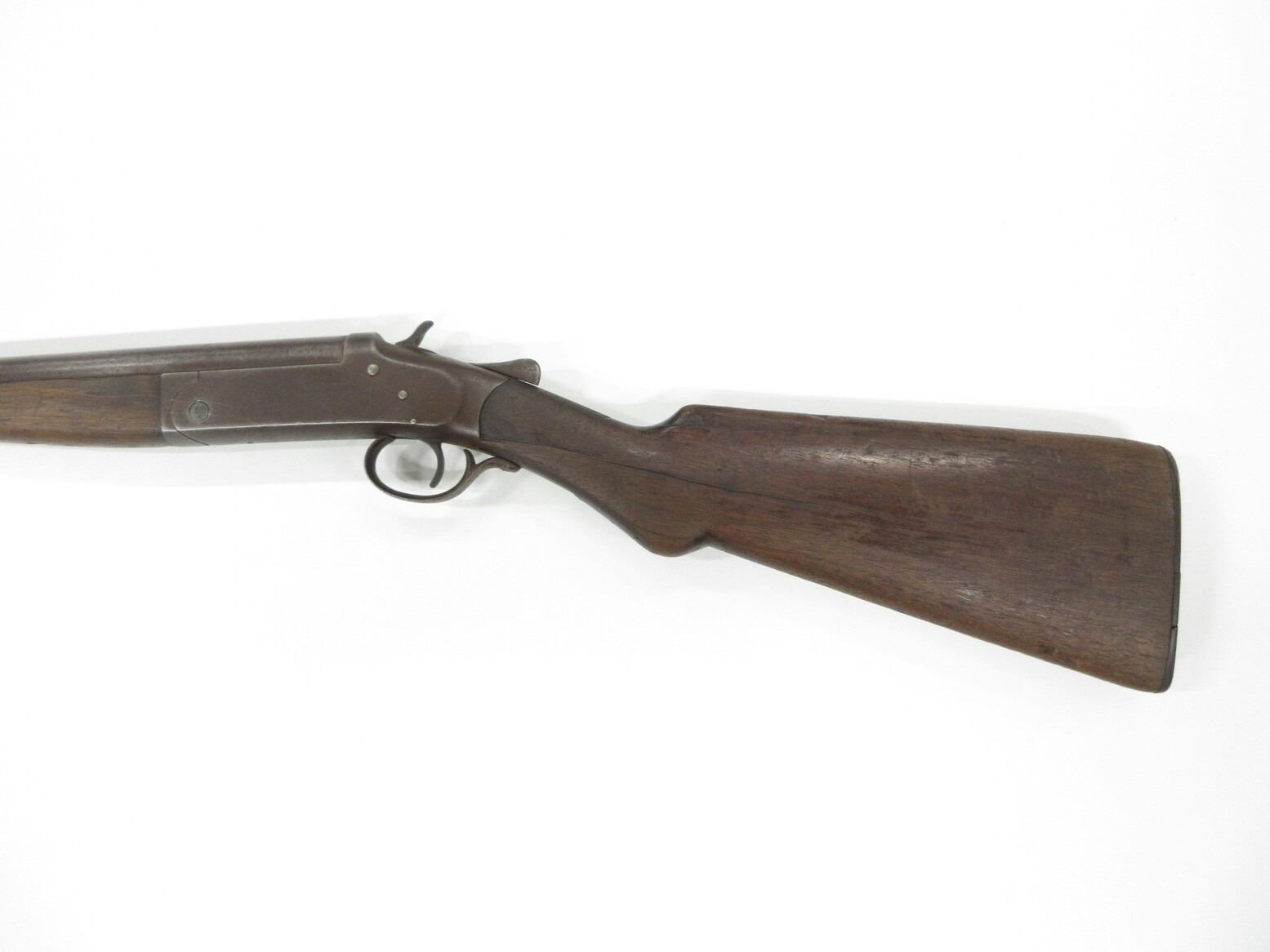 PARTS GUN. IVER JOHNSON. MODEL: CHAMPION. CALIBER: 12 G X 2 5/8". BORE IS POOR, PITTED. FIXED FULL CHOKE. STEEL BEAD, ROUND BARREL LOOSE ON FACE, CHECKERED SPUR HAMMER, EXTRACTOR. TWO PIECE WOOD STOCKS, FOREARM IS CRACKED ON BOTH SIDES, PISTOL GRIP, CRACKED BEHIND RECEIVER AND BOTH TANGS, BLACK POLYMER BUTT PLATE WHICH IS CRACKED AND BROKEN. METAL FINISH TURNING BROWN WITH PITTING, RUST, HANDLING MARKS AND WEAR. STOCKS SHOW MARKS, SCRATCHES AND WEAR. ACTION: HINGED SINGLE SHOT SHOTGUN. BARREL LENGTH: 30". SERIAL # NA. CONDITION: PARTS GUN, THIS ITEM IS SOLD FOR PARTS USE ONLY. SOME PARTS AND COMPONENTS MAY NOT BE PRESENT AND OR FUNCTIONAL. UNDER NO CIRCUMSTANCES ATTEMPT TO USE THIS ITEM AS A FUNCTIONAL FIREARM. CLASS: CANADIAN NON RESTRICTED