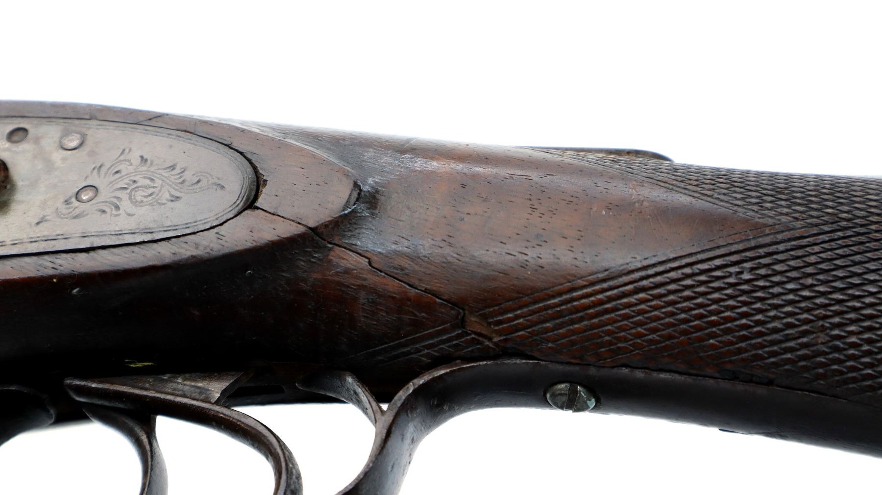 Main Description: Brass bead, fine twist barrels with smooth rib, engraved locks missing hammers, screws and possibly other parts. Nipples damaged. One piece half length wood stock, single forearm wedge, missing forearm tip, checkered straight grip chipped, cracked and broken behind locks and tang, smooth steel butt plate, engraved trigger guard, vanity plate, missing ramrod.