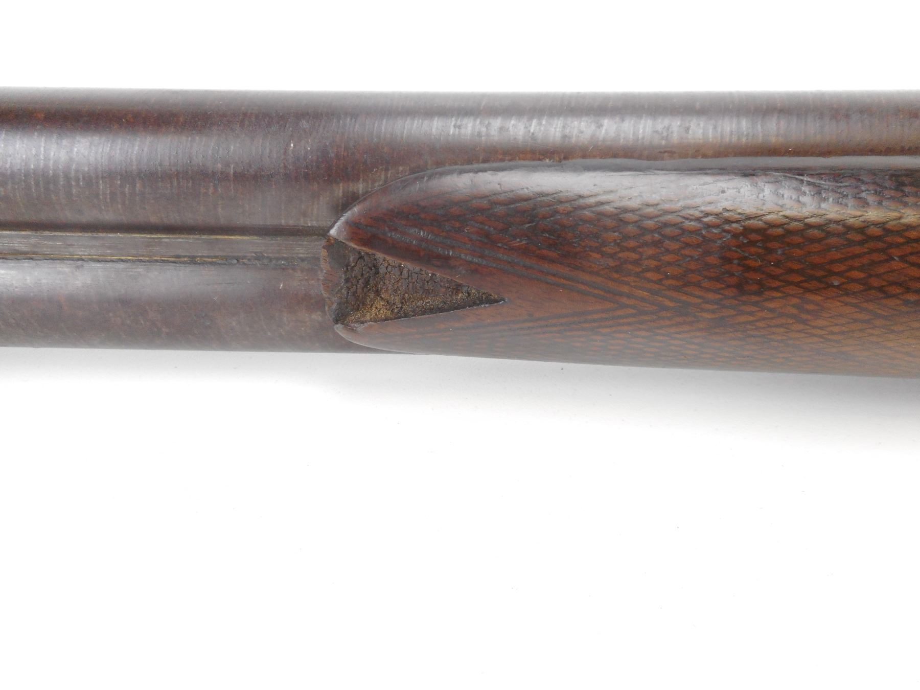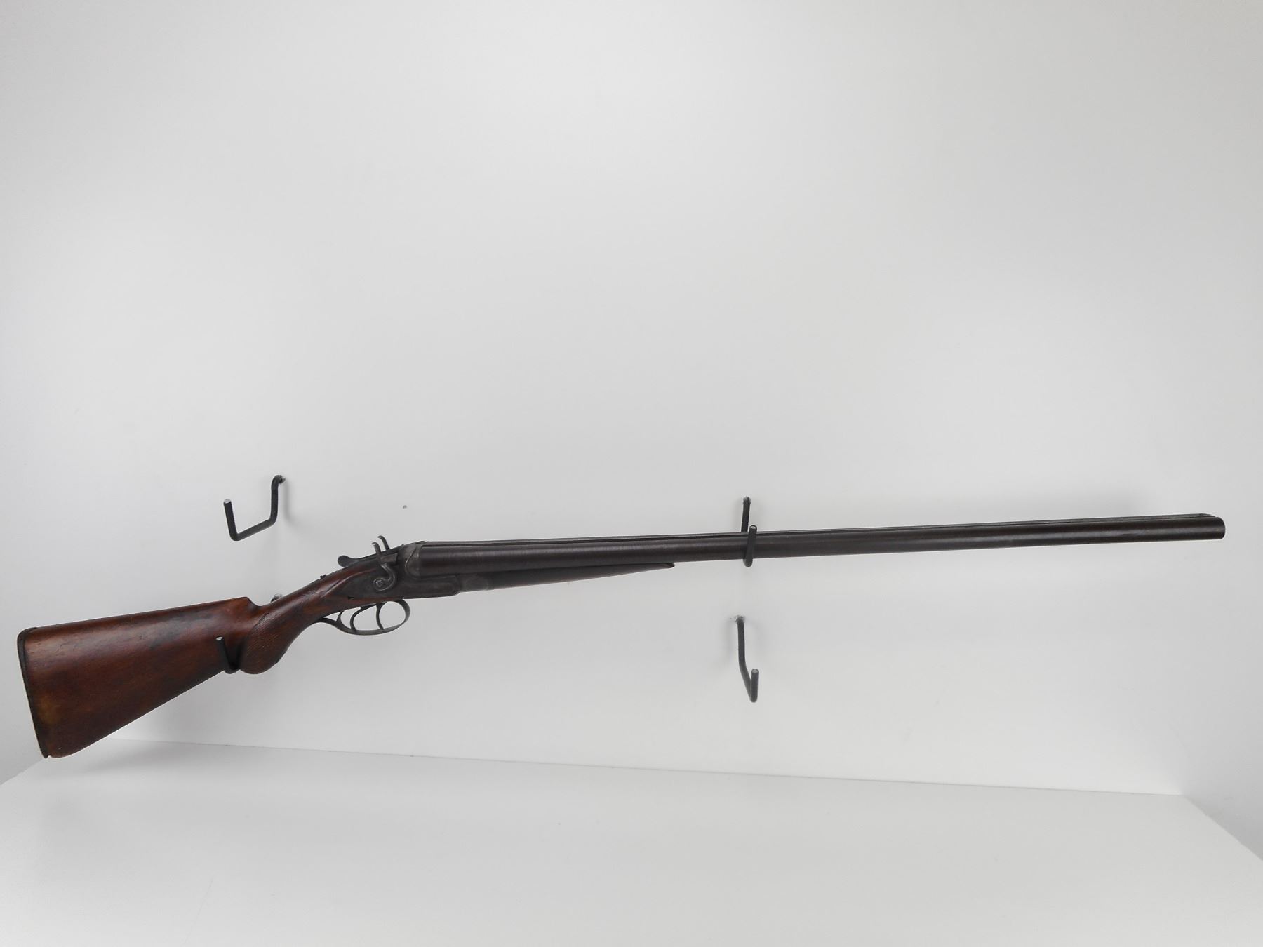 J.J. WESTON , MODEL: SIDE BY SIDE , CALIBER: 12 GA X 2 3/4" , GOOD BORES. MODIFIED CHOKES. BEAD FRONT SIGHT. TWO PIECE CHECKERED HARDWOOD STOCK. CRACKED AND CHIPPED PLASTIC BUTTPLATE. CHIPPED FOREND. LARGE CRACK AND CHIP AT THE WRIST. SHOWS EXTENSIVE HANDLING MARKS. BARREL LENGTH: 30" , CONDITION: 4/10 , STOCK # NR10736, SERIAL # 23757, CLASS: CANADIAN NON RESTRICTED CLASS