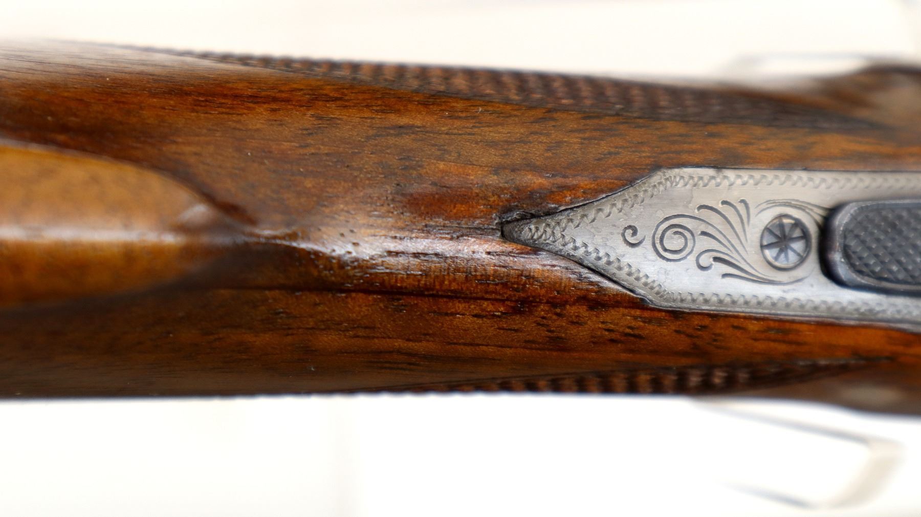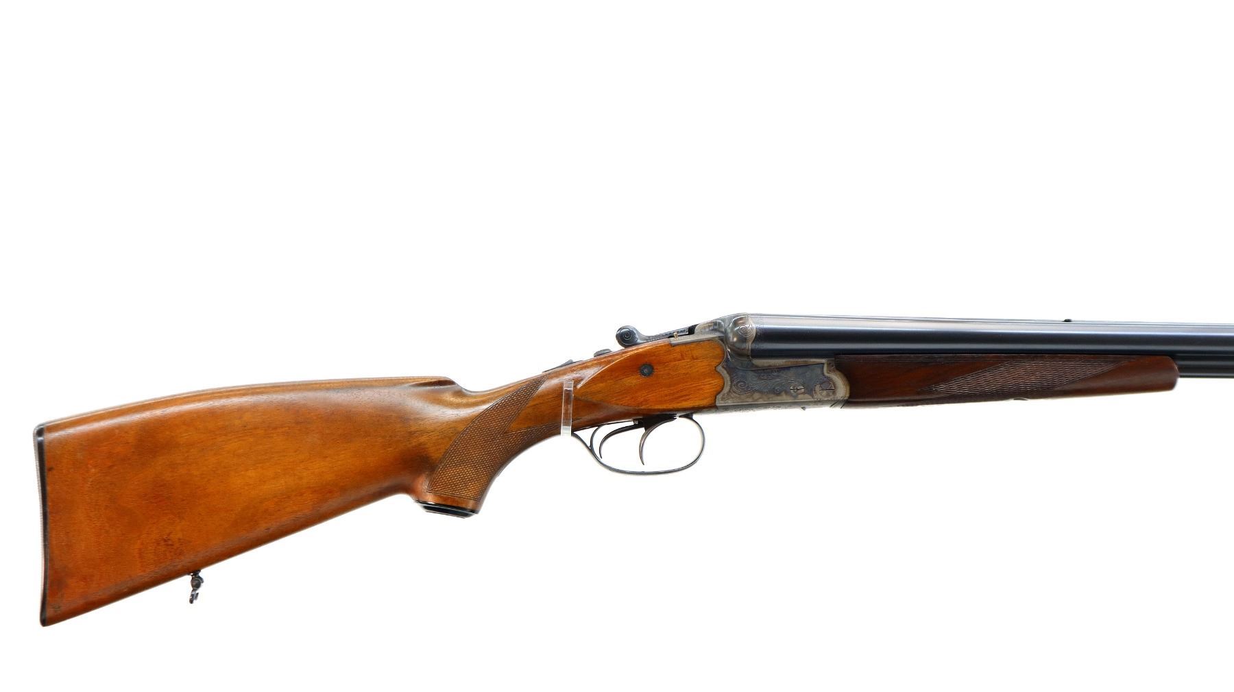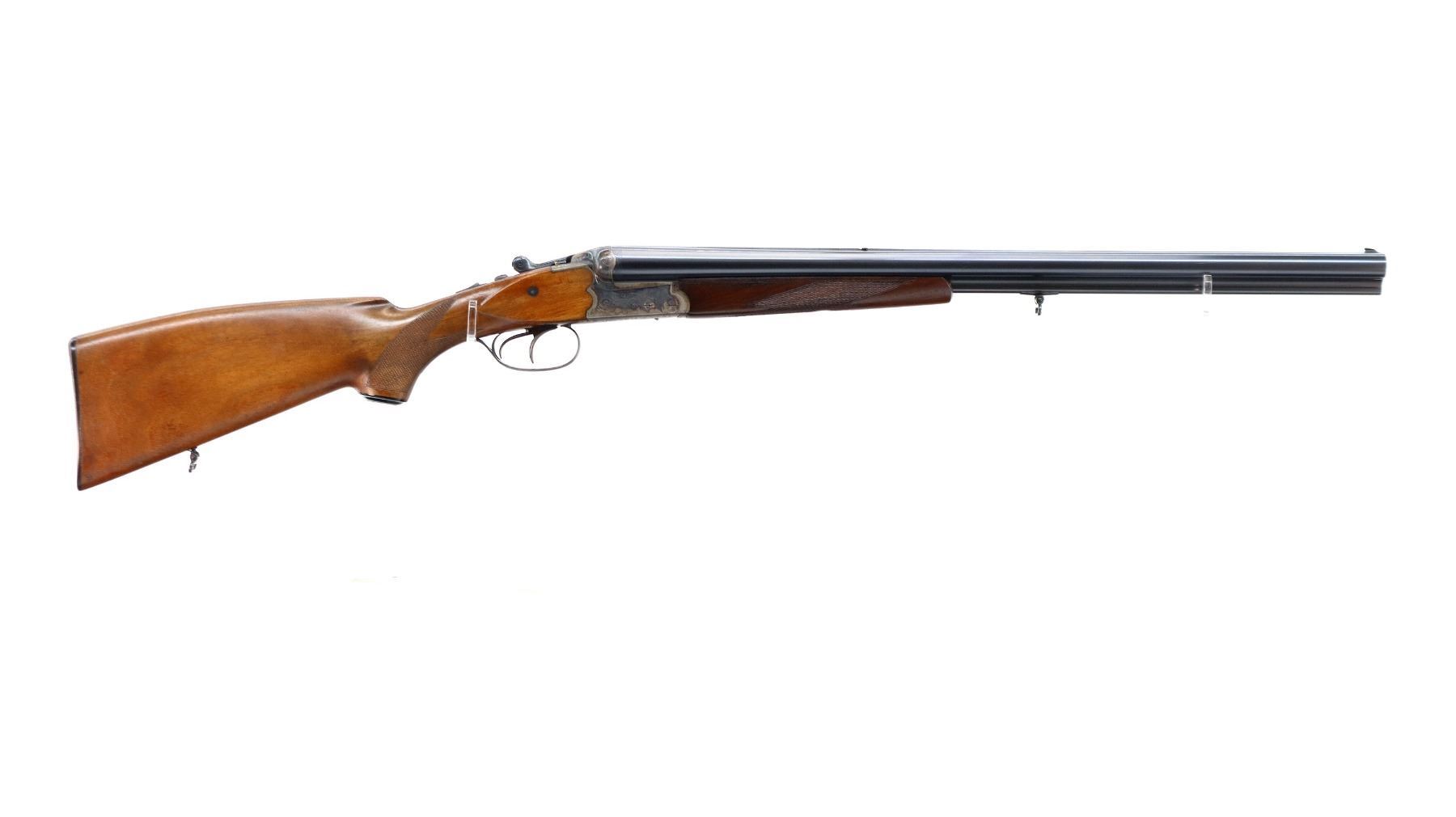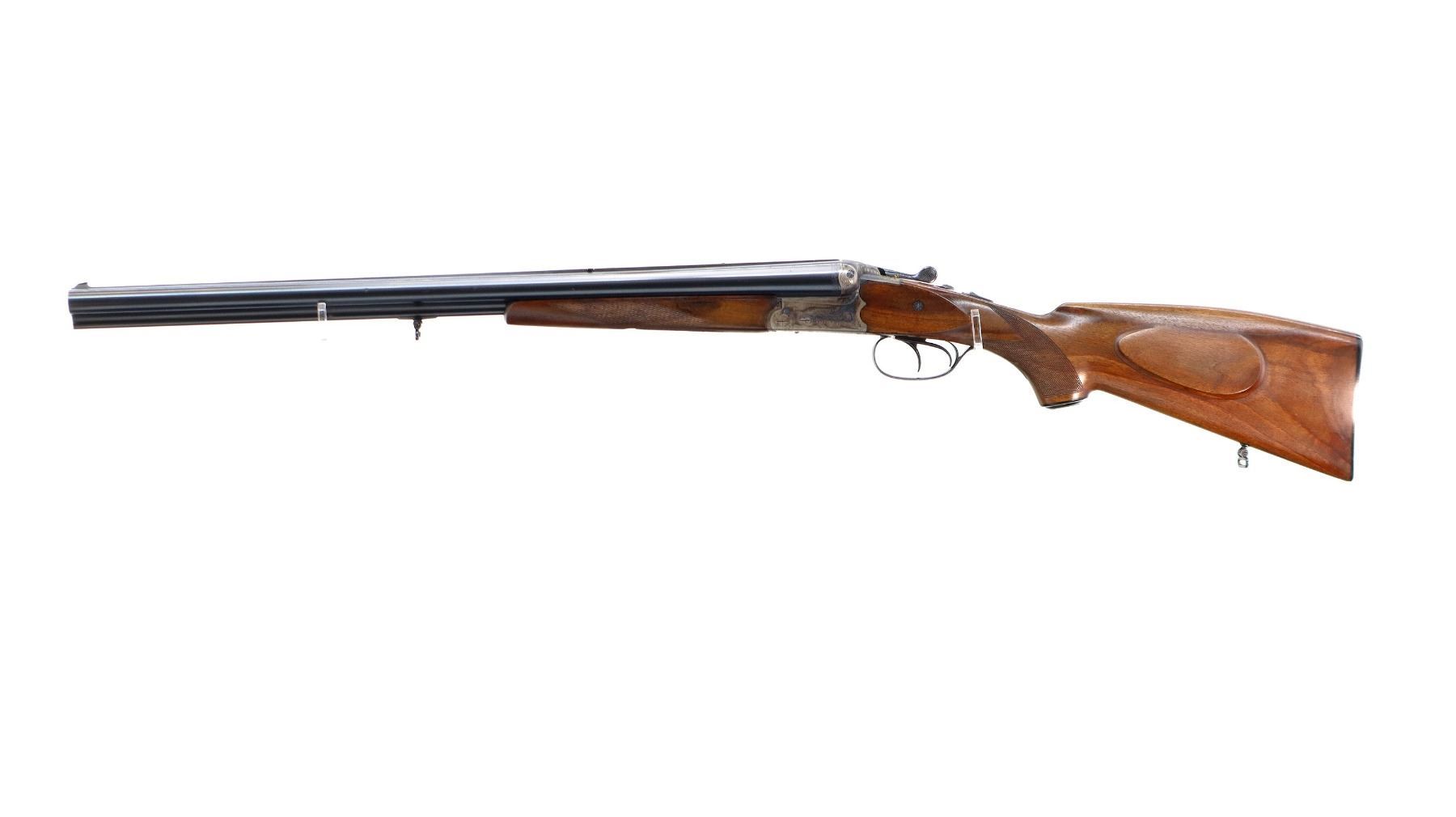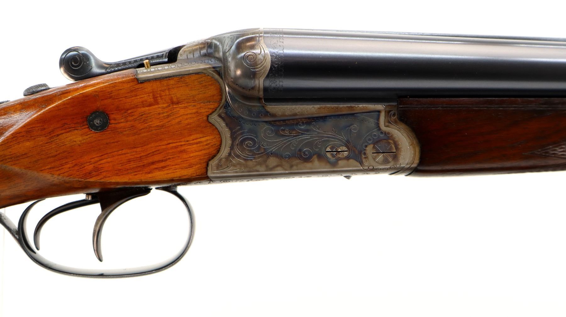 Main Description: Blade front sight, adjustable folding u notched rear sight activated by lever on tang, engraved colour case hardened receiver, automatic safety, extractor, cocking indicators, double triggers. Two piece wood stocks, checkered forearm, pistol grip, black polymer butt plate, European cheek rest, grip cap, left barrel has a small dent and sling swivels.