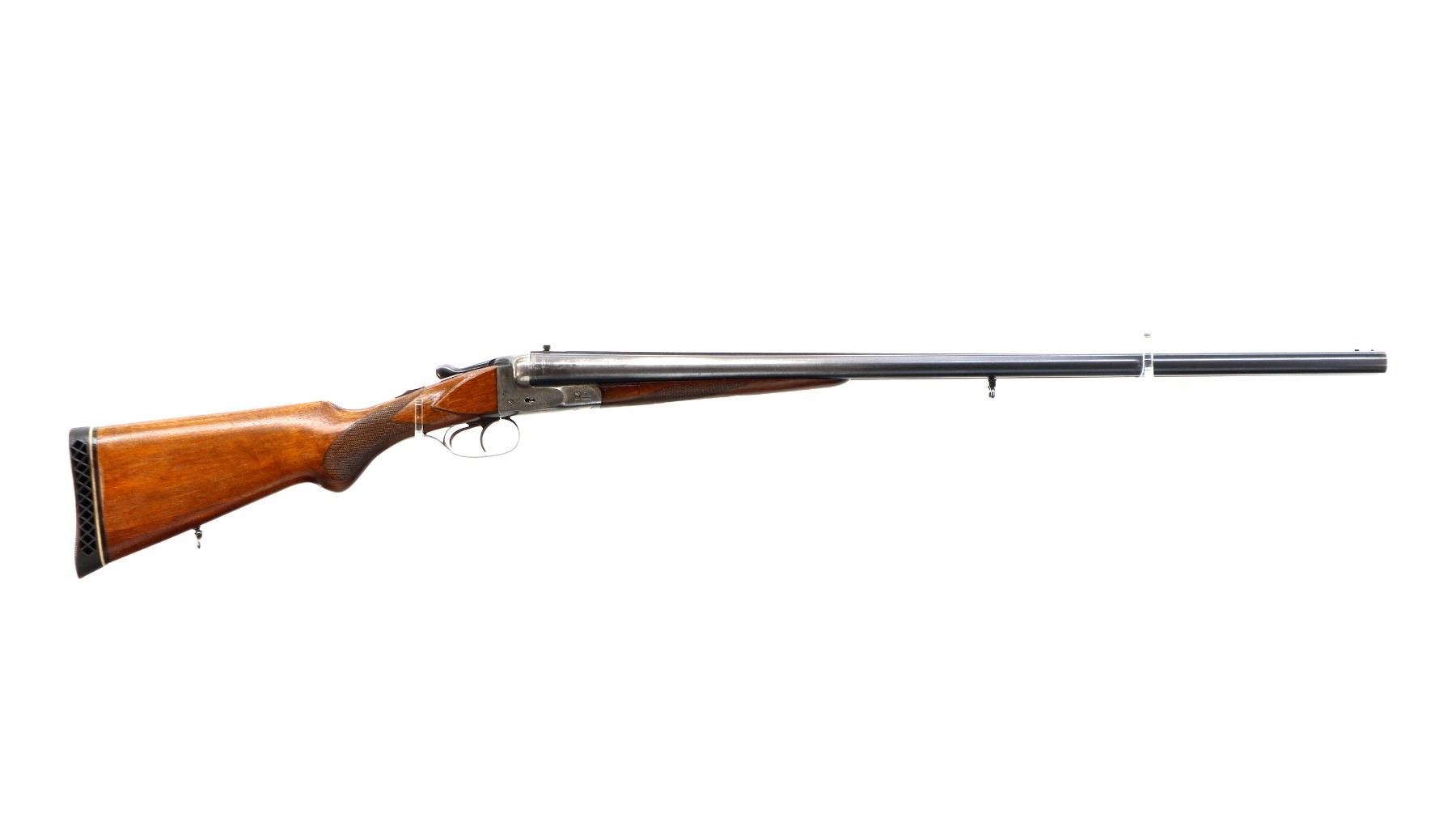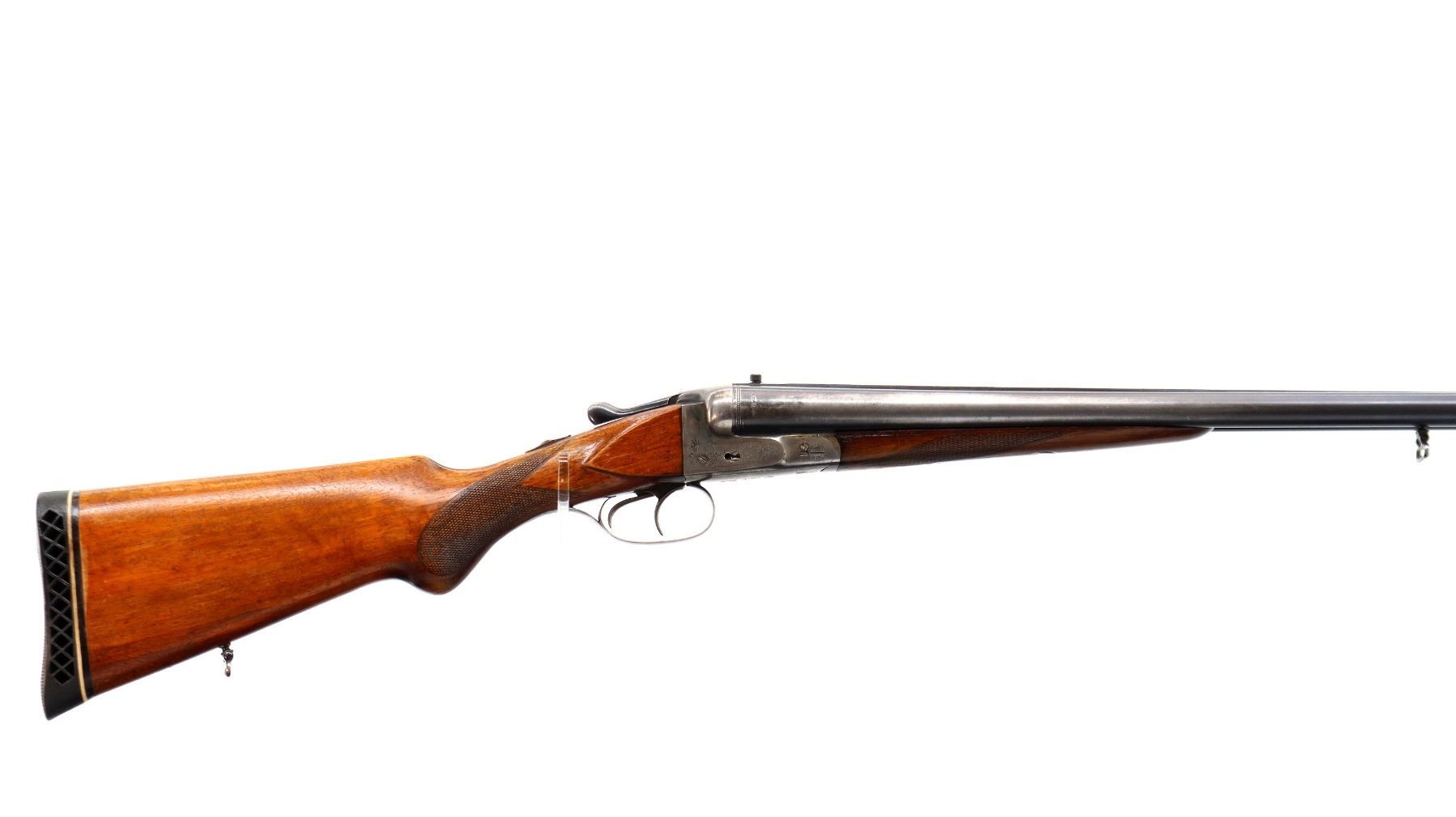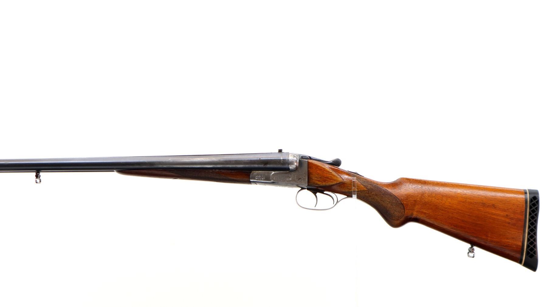 Main Description: Brass bead, blued barrels with raised rib with a screw inserted at front and back of the rib, engraved colour case hardened receiver, automatic safety, extractor, double triggers. Two piece wood stocks, checkered forearm and pistol grip, small crack behind receiver and upper tang, black vented rubber recoil pad, 14.25" LOP, sling swivels.