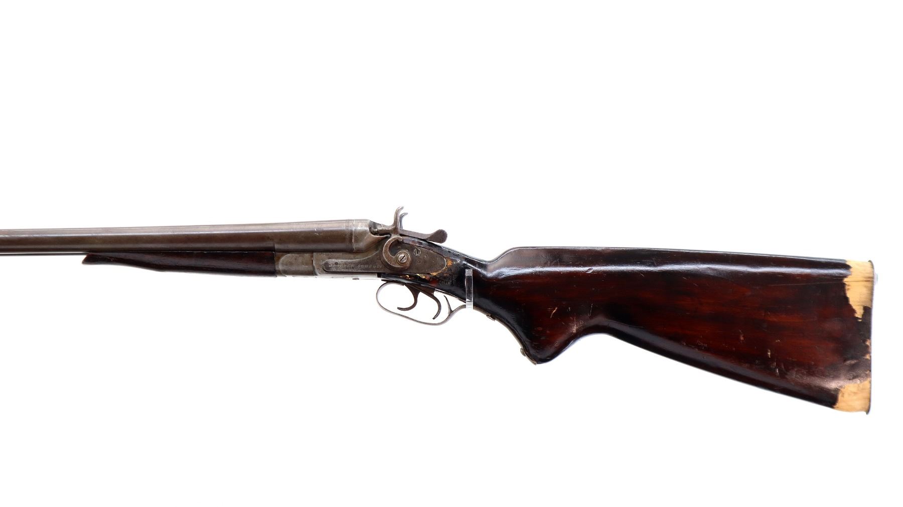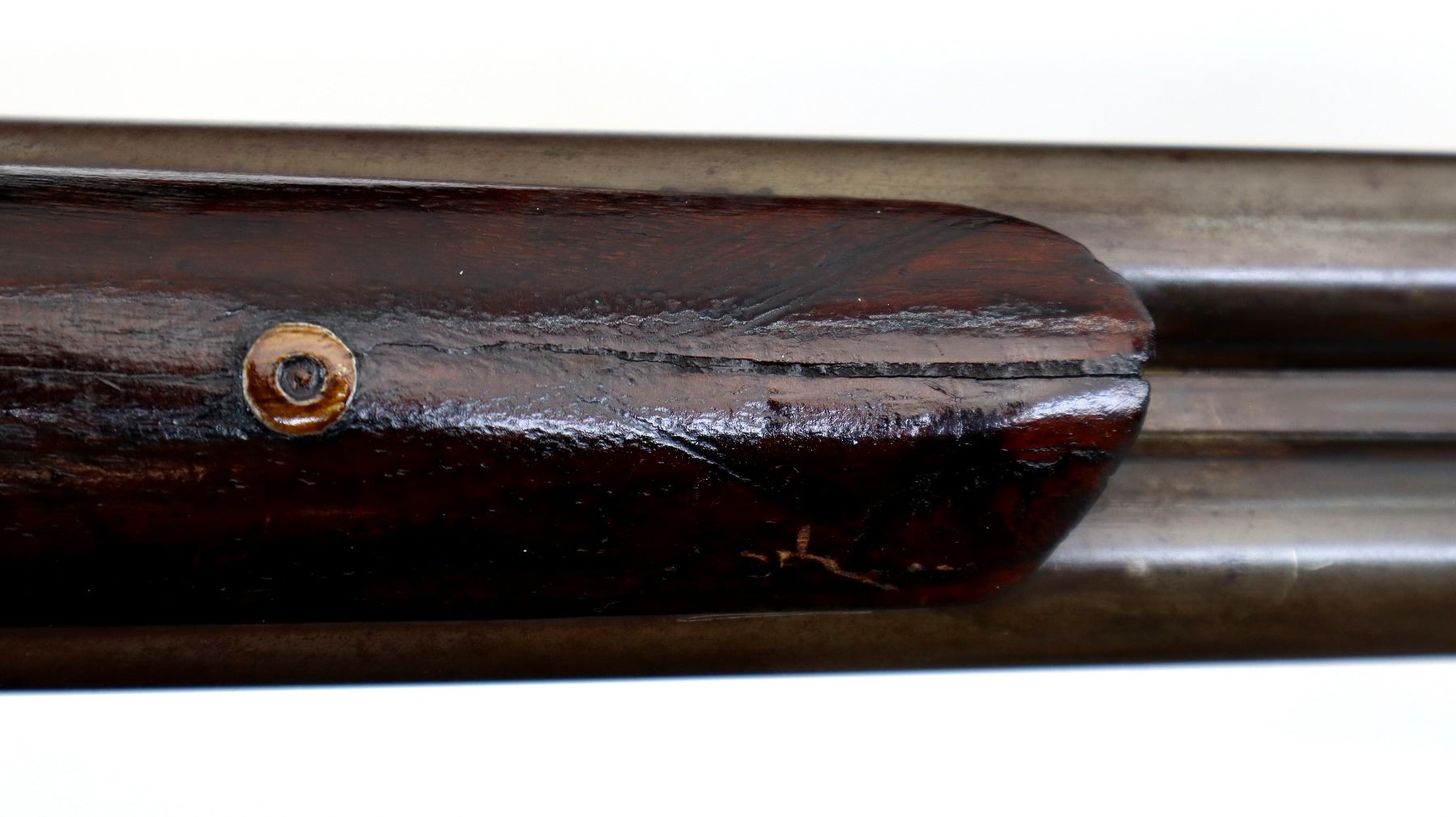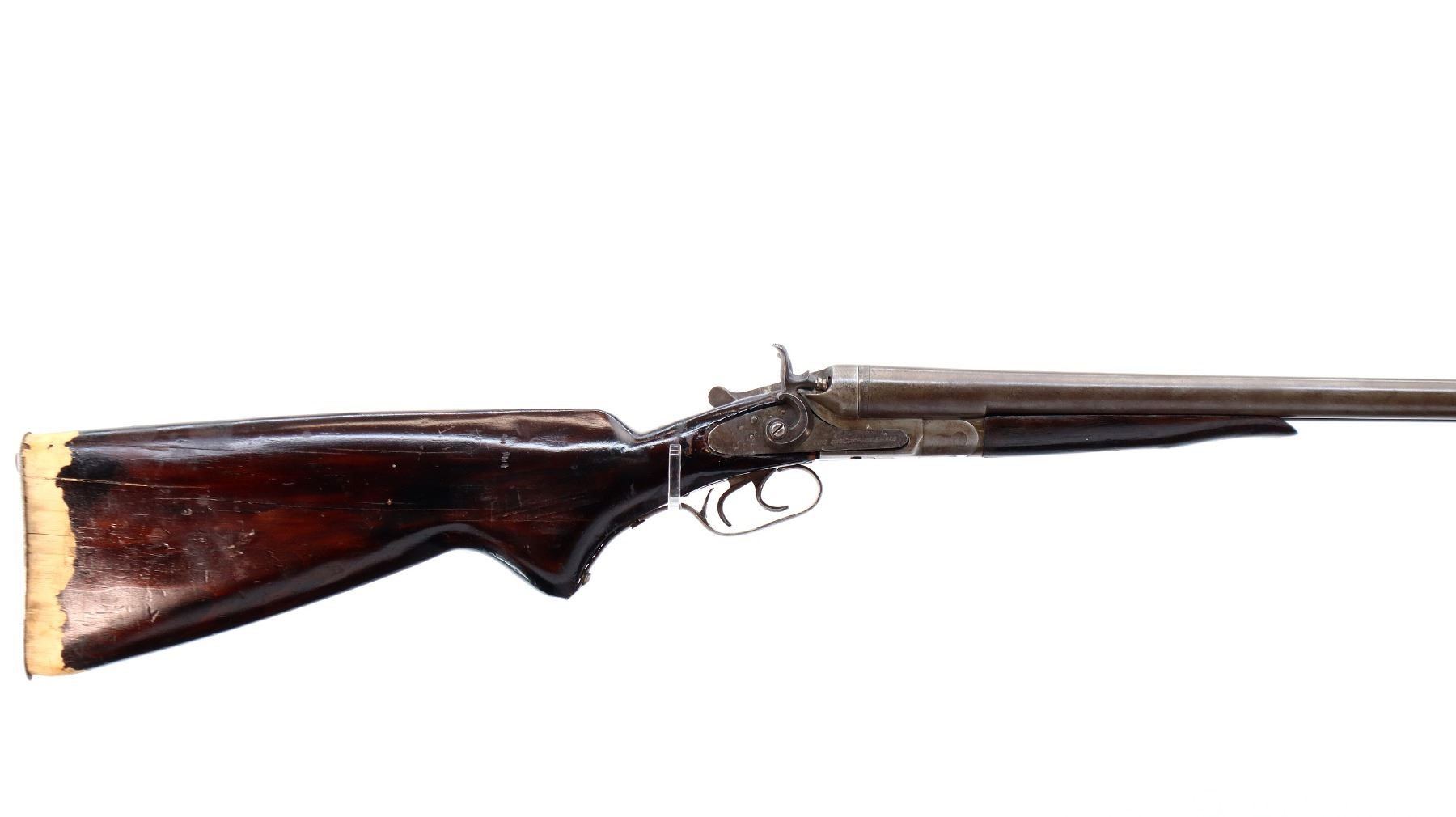 Main Description: Broken bead, Fine Damascus barrels with grooved rib that are loose on face, side locks with grooved spur hammers that don’t function, require parts and repair. Extractor, double triggers. Two piece wood stocks, forearm is cracked, custom wood butt stock with pistol grip, chipped cracked and loose around receiver and locks, grooved steel butt plate, stock shows age cracks, trigger guard is broken.