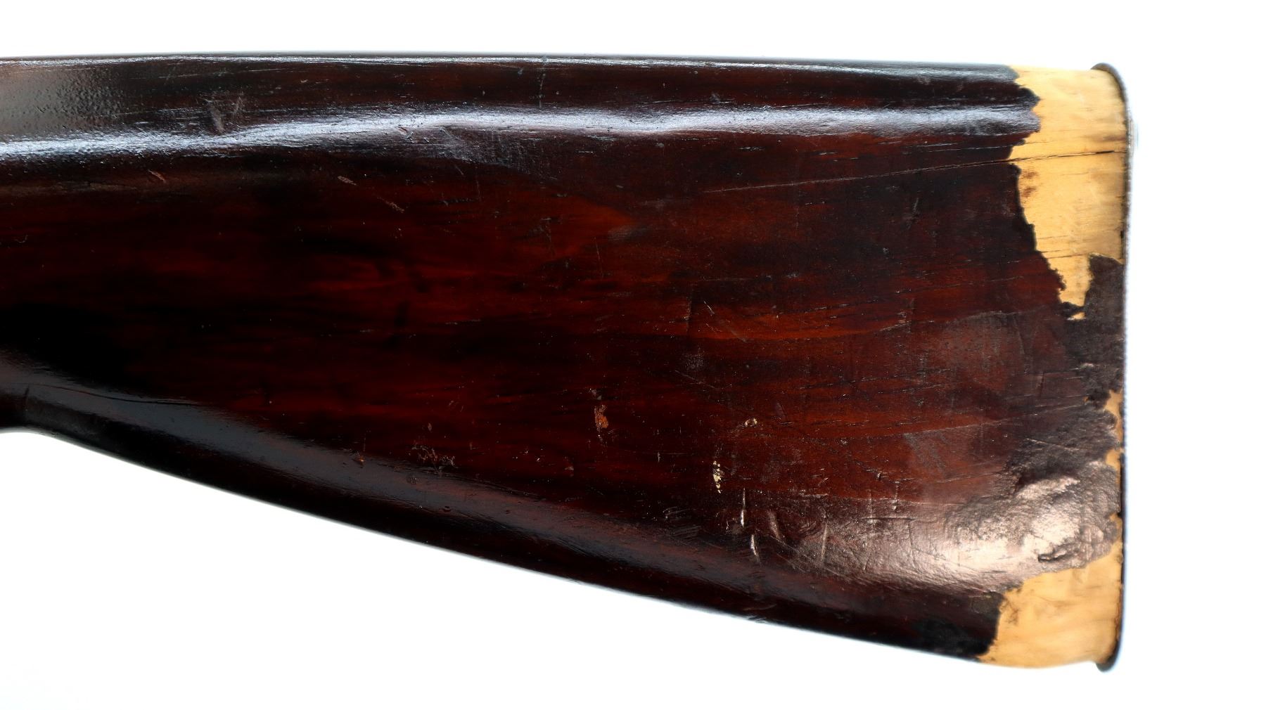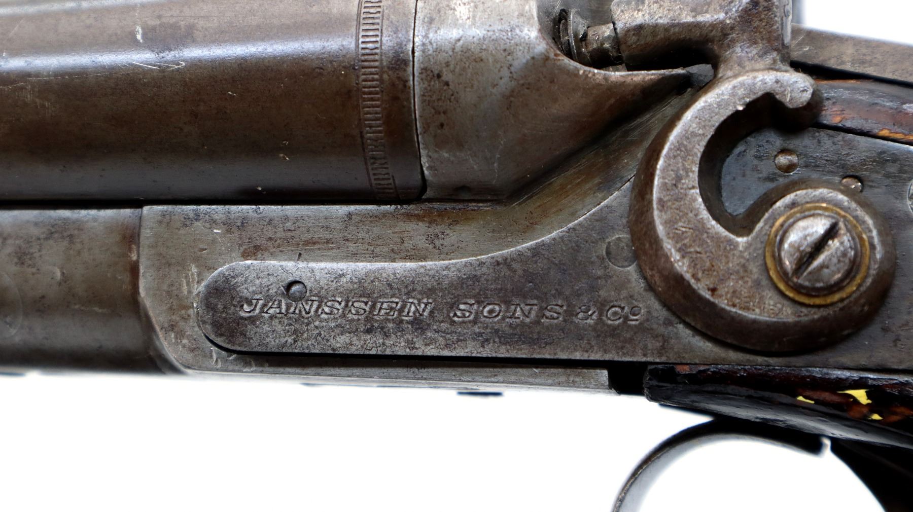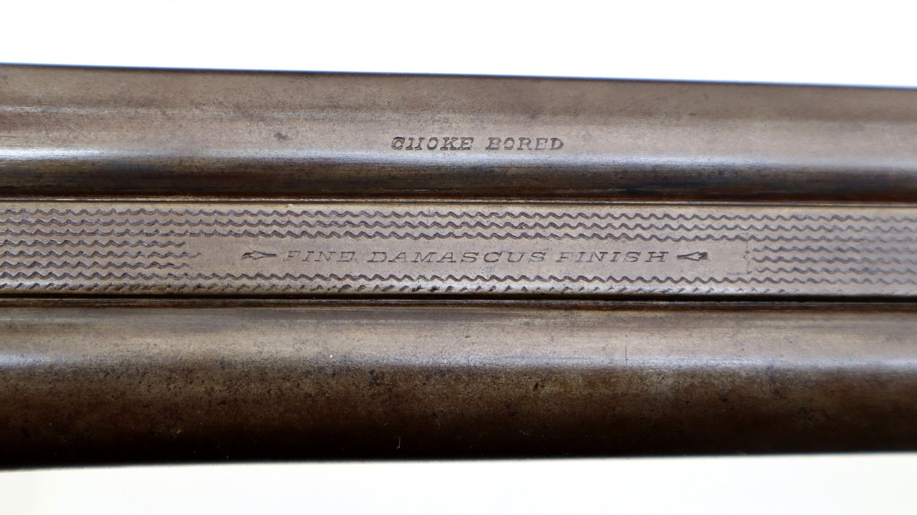 Main Description: Broken bead, Fine Damascus barrels with grooved rib that are loose on face, side locks with grooved spur hammers that don’t function, require parts and repair. Extractor, double triggers. Two piece wood stocks, forearm is cracked, custom wood butt stock with pistol grip, chipped cracked and loose around receiver and locks, grooved steel butt plate, stock shows age cracks, trigger guard is broken.