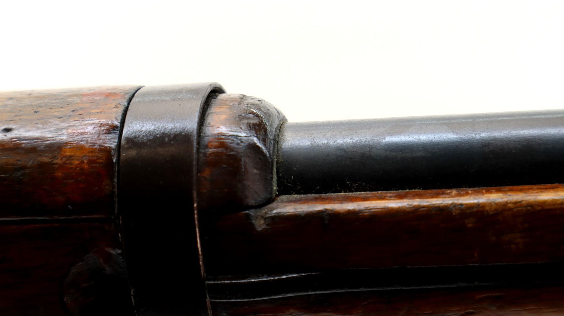 Main Description: Bolt matches. This rifle has an intact Chrysanthemum with small circles stamped around the outside edge. Blade front sight with ears and ramp, adjustable rear ladder peep sight, blued finish, bolt has the dust cover and smooth knob. Two piece full military wood stocks, finger grooved forearm, pistol grip, smooth steel butt plate, two piece stock has a gap at the rear, sling swivels, cleaning rod, bayonet lug.