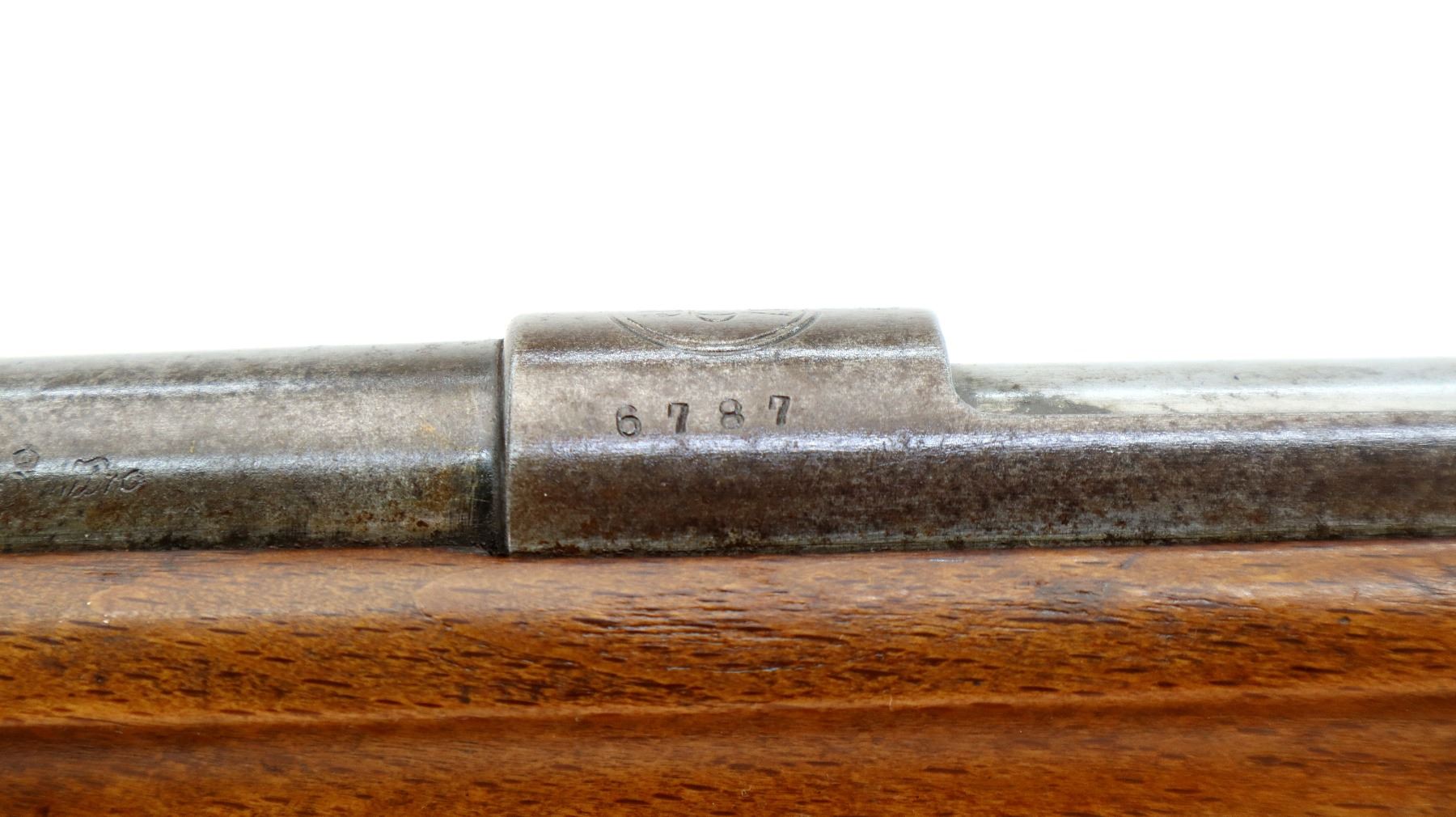 Main Description: Brass bead, round barrel, grooved bolt knob, extractor is present. One piece wood stock, finger grooved forearm, pistol grip, chipped behind receiver, smooth steel butt plate, stock cracked at heel chipped at toe.
