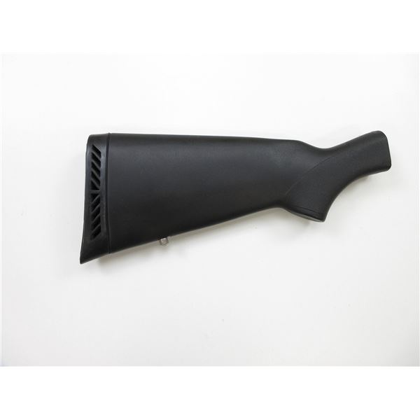 MOSSBERG 590 BUTT STOCK. (1) BLACK, SYNTHETIC, WITH RECOIL PAD & SWIVEL STUD, OAL APPROX. 12.7". SEE PHOTOS, MAY REQUIRE FITTING.