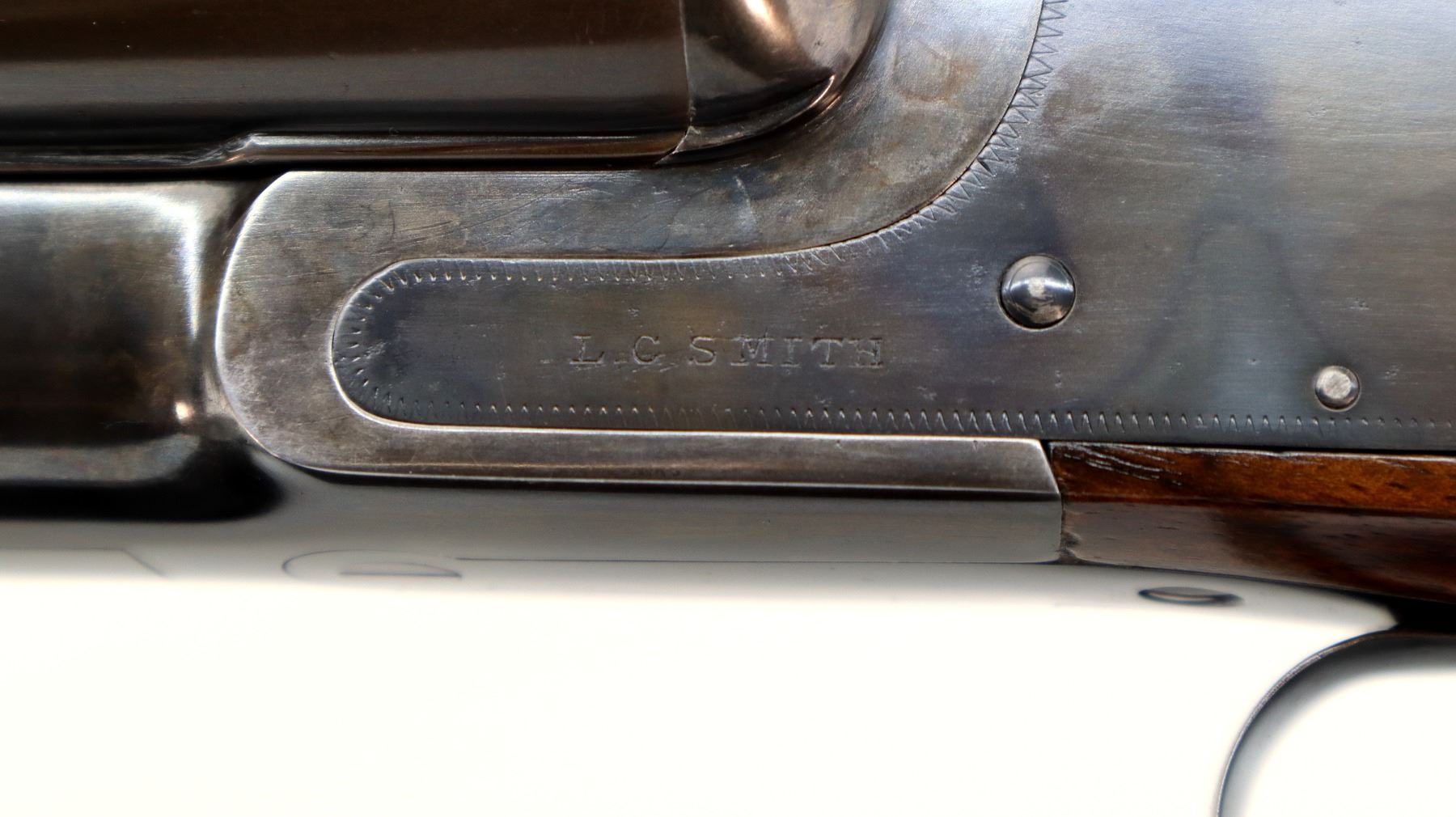 Main Description: Manufactured 1909. Brass bead, blued barrels with raised rib marked Hunter Arms Co Fulton New York that chime and are tight on face. Side locks with border engraving, automatic safety, extractor, double triggers. Two piece wood stocks, skip line checkered forearm and pistol grip, grooved black polymer butt plate, 13.85 LOP, 1.625" DAC 2.625" DAH.