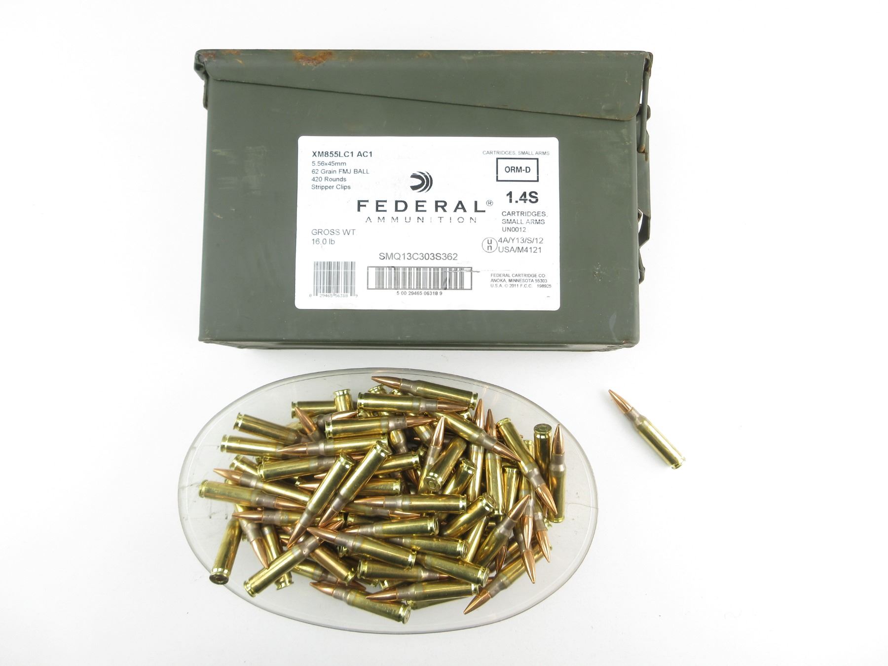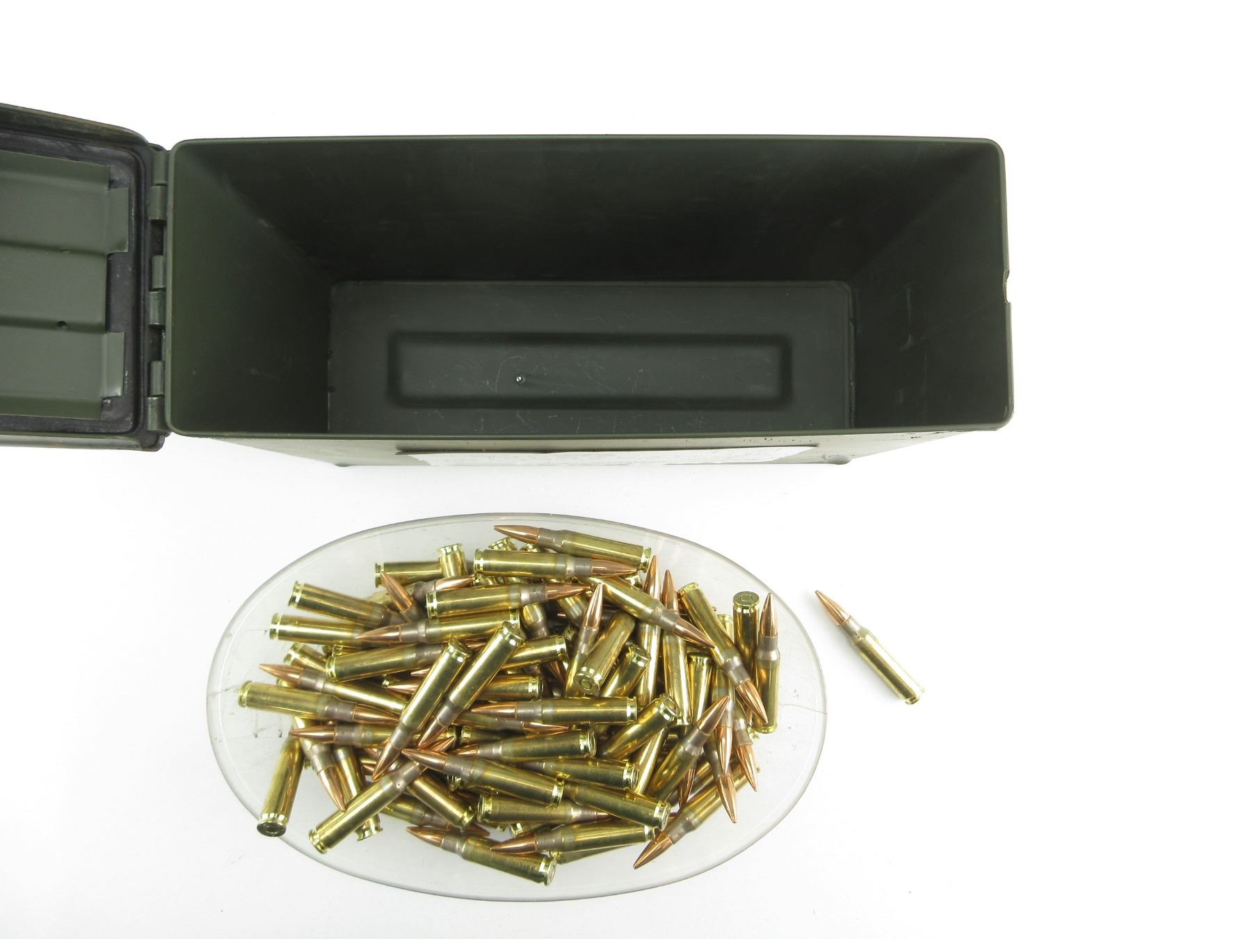 LOT INCLUDES; APPROX. (100) RNDS, FMJ, (1) METAL AMMO TIN, APPROX. OAL 10 3/4"X4"X7".