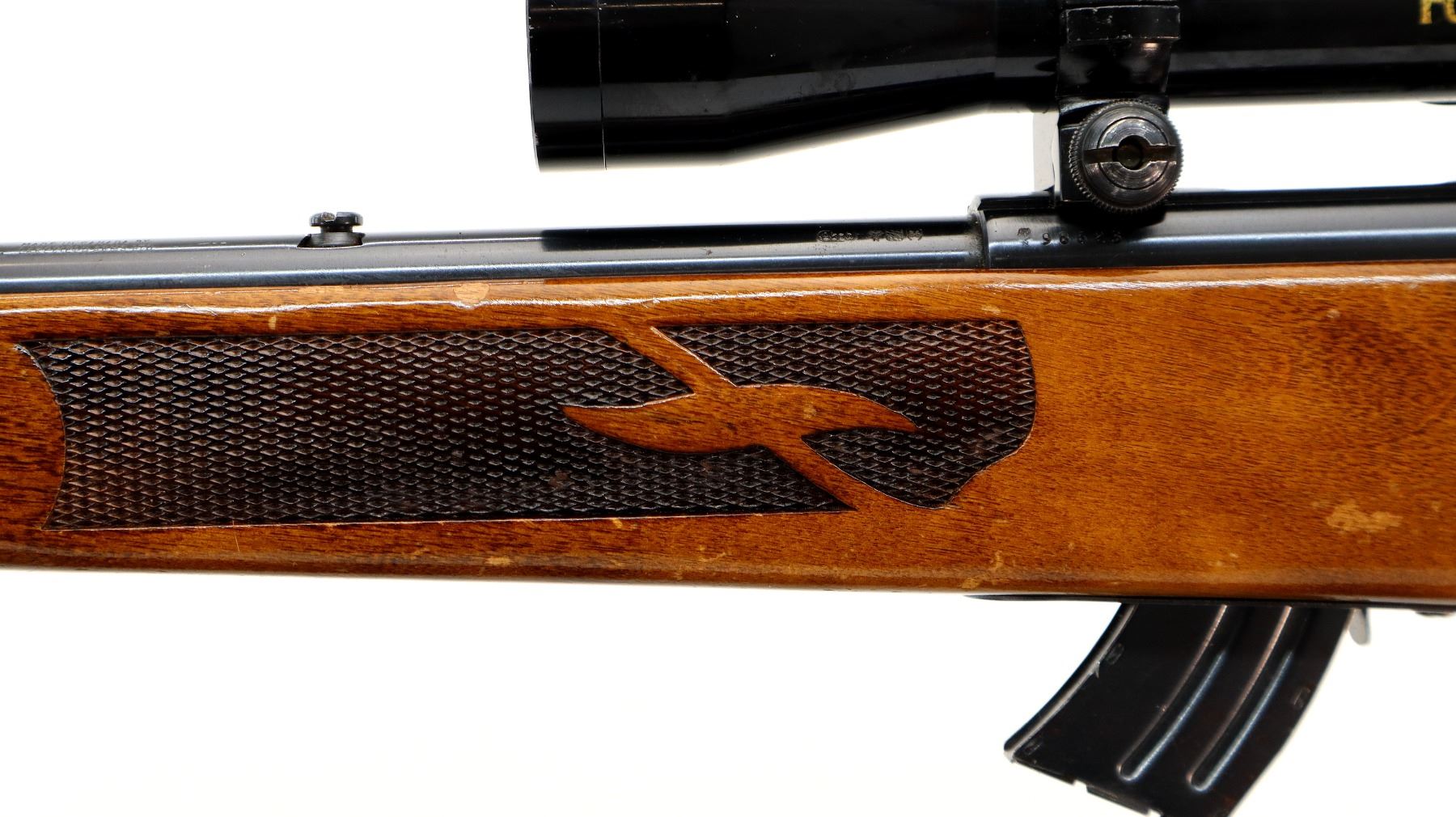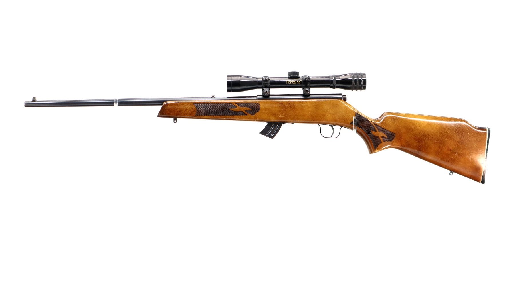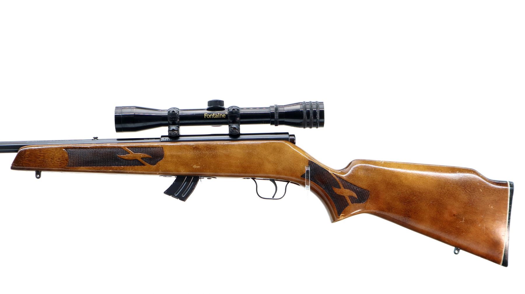 Main Description: Blade front sight, missing rear sight, screw and nut are present, blued finish, grooved receiver with Fontaine 4x32 scope installed, clear optics with duplex crosshair. One piece wood stock, checkered forearm and pistol grip, raised comb, grooved black polymer butt plate, swivel studs.