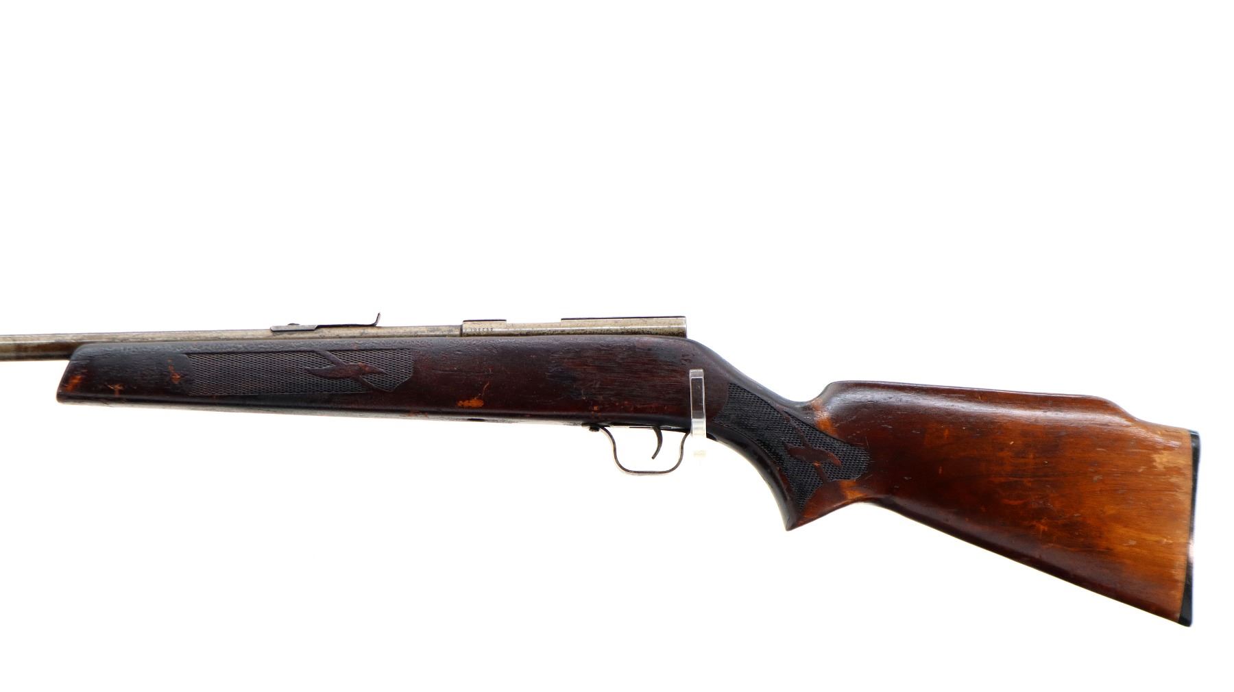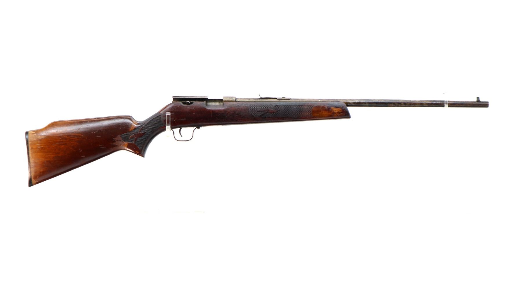 Main Description: Blade front sight, u notched rear sight missing elevator, grooved receiver, missing complete bolt assembly. One piece wood stock, forend tip is cracked, checkered forearm and pistol grip, raised comb, grooved black polymer butt plate.
