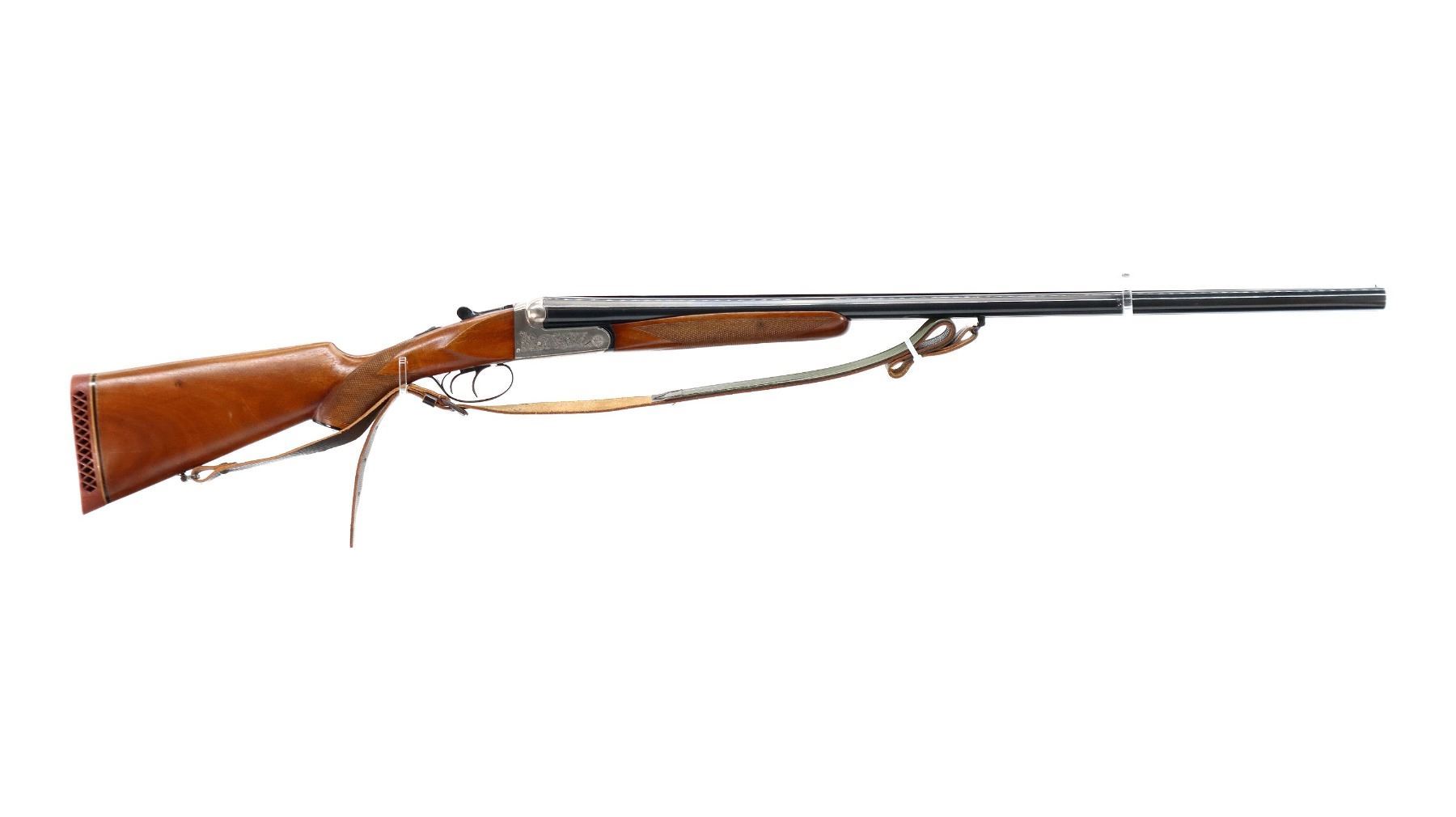 Main Description: Brass bead, blued barrels with raised rib, engraved silver receiver, automatic safety, extractor, double triggers. Two piece wood stocks, checkered Beavertail forearm and pistol grip, red vented rubber recoil pad, grip cap, sling swivels with black leather sling.