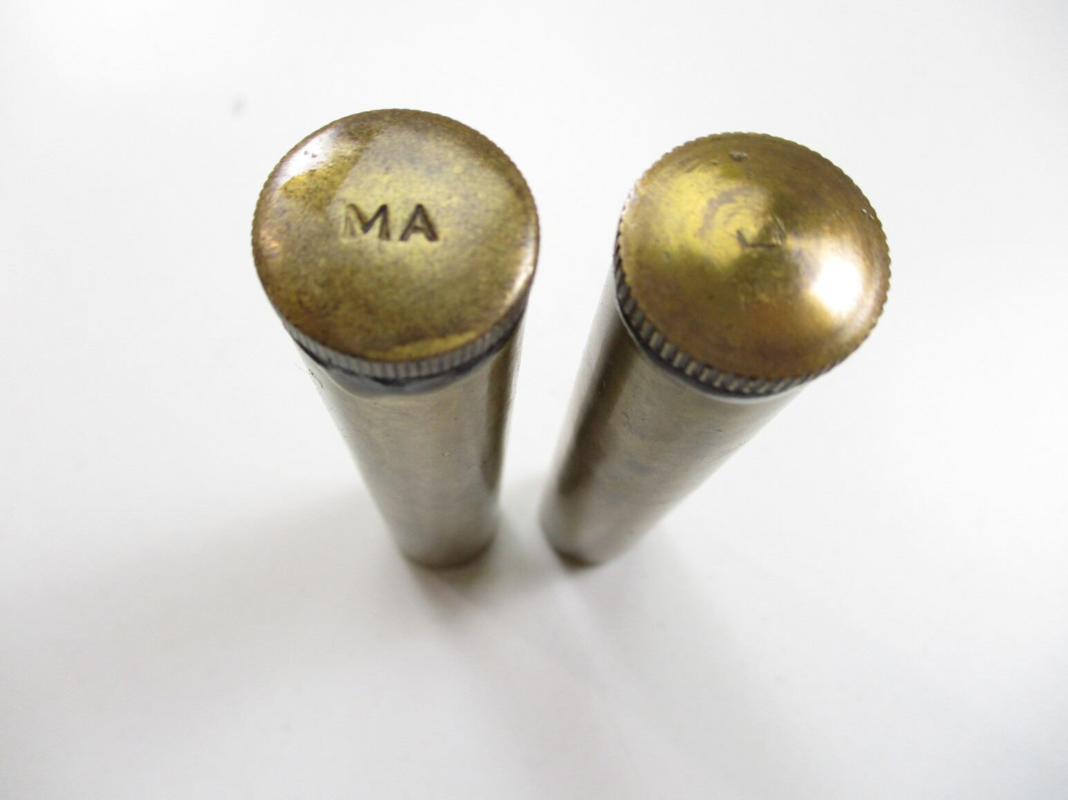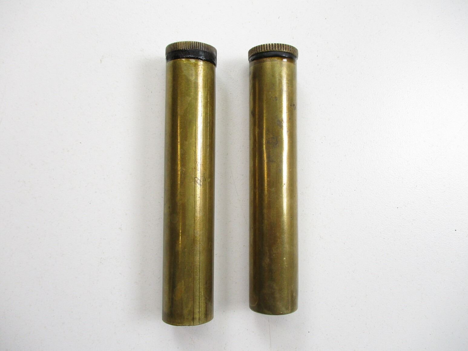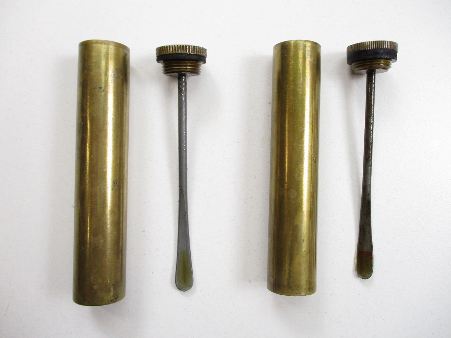 LEE ENFIELD BRASS OILER LOT, (2) BRASS OILERS, ONE LID MARKED: "MA (MANGROVITE AUSTRALIA)", ONE BASE MARKED: CROWN OVER "B" OVER "79" & BROAD ARROW. SEE PHOTOS.