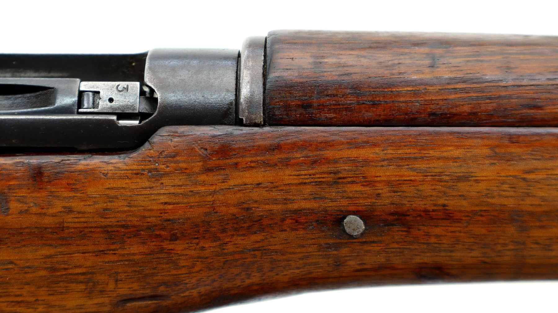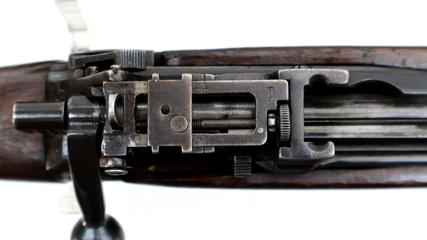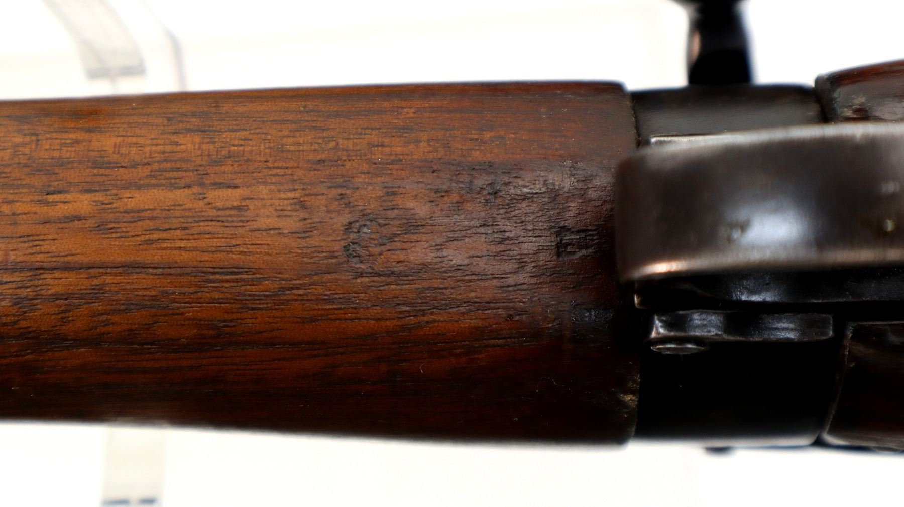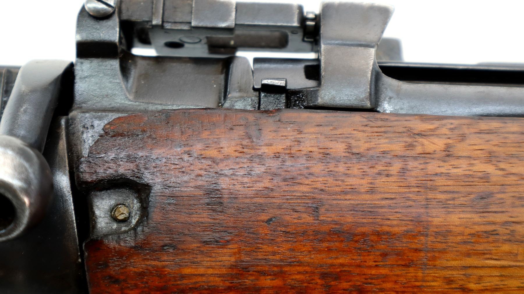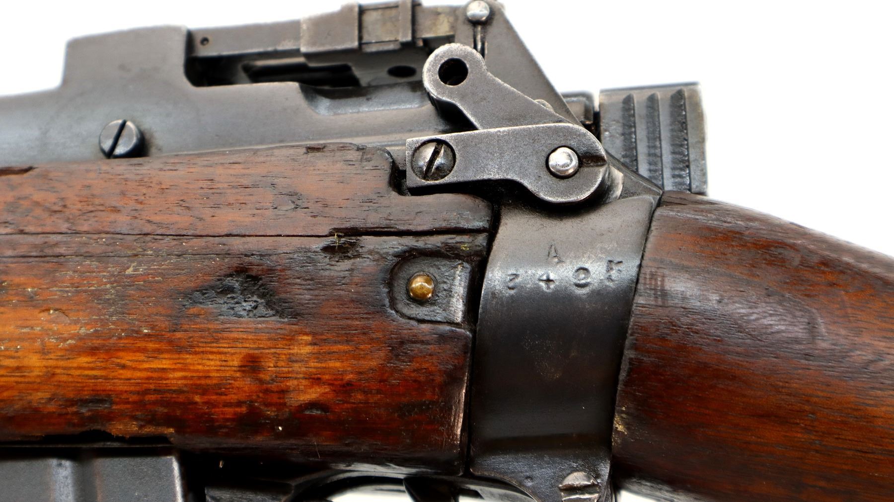 Main Description: No visible Manufacture, bolt numbered to match. Blade front sight with ears and ramp, adjustable milled 800yrd rear peep sight, blued finish. Three piece full Military wood stocks, forend tip has arsenal repair, forearm has Ishapore screw, cracked on left side, chipped on right side, pistol grip, black rubber recoil pad, sling swivels, flashider with integral bayonet lug.