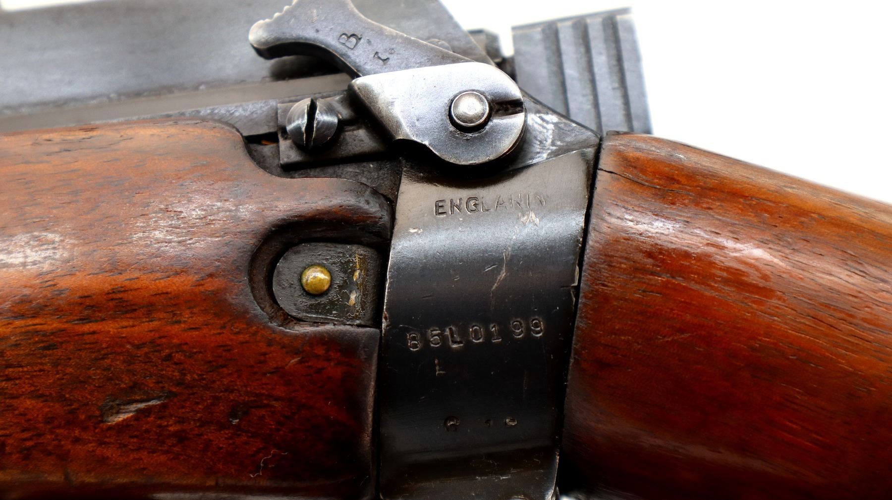 Main Description: Manufactured by Long branch 1945, bolt matches, magazine does not. Blade front sight with ramp, adjustable L-flip rear peep sight, blued metal finish. Two piece sporterized wood stocks, pistol grip cracked behind receiver, smooth grey alloy butt plate with trap, stock chipped at heel, sling swivels with brown leather sling.