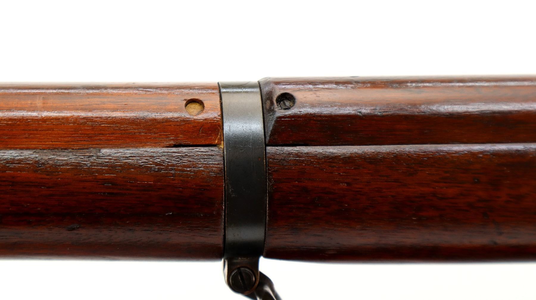 Main Description: This rifle built with a 1944 Long Branch .22" receiver with no serial numbers from Military stores, various parts have C-Broad Arrows, LB and CA Markings. Bolt is unnumbered. Blade front sight with ears and tamp, adjustable MKII stamped rear peep sight, blued finish. Four piece full military wood stocks, pistol grip, smooth steel butt plate with trap with pull thru and black polymer oiler, three sling swivels and bayonet lugs.