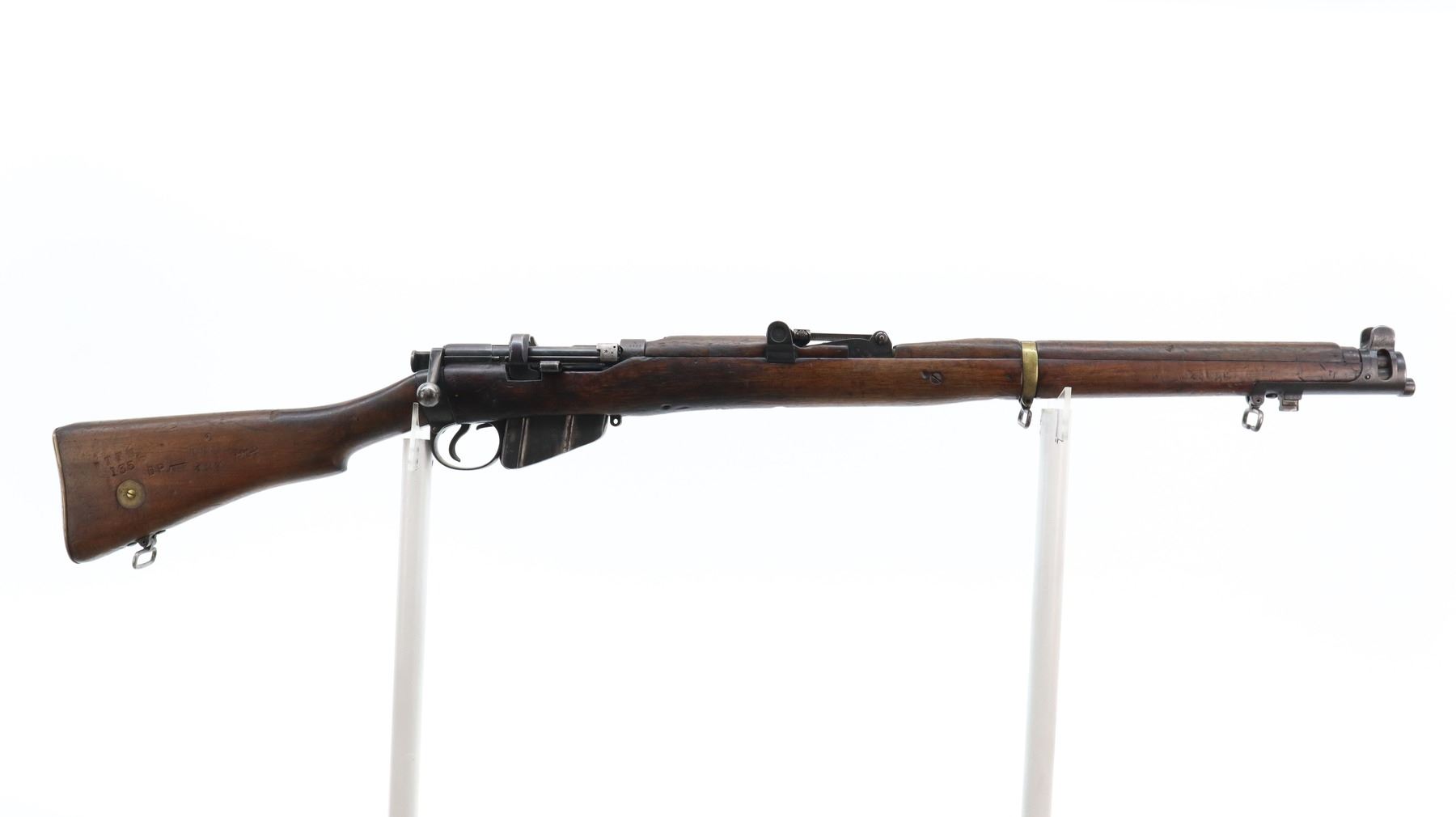 6+/10 , LEE ENFIELD , MODEL: NO 1 MKIII , CALIBER: 303 BR , COMES WITH, MAGAZINE , BORE IS FAIR, WORN, LIGHT PITTING. MANUFACTURED BY BSA 1915, NOSE CAP AND REAR SIGH MATCH, FOREND UN-NUMBERED, BOLT MISMATCHED. BLADE FRONT SIGHT WITH EARS, ADJUSTABLE U NOTCHED REAR SIGHT WITH EARS, MAGAZINE CUT OFF, RECEIVER RING MARKED EY CROSSED OUT AND THEN STAMPED DP, FOREND RETAINS FRONT AND REAR VOLLEY SIGHTS. FOUR PIECE WOOD FULL MILITARY STOCKS, FRONT HAND GUARDS EARS CUT OFF, PISTOL GRIP, BRASS BUTT PLATE WITH TRAP, RIGHT SIDE OF STOCK HAS BRASS DISK WITH C- BROADARROW, MARKED TTN 135DP WITH C-BROADARROW AND OTHER MARKINGS CROSSED OUT, SLING SWIVELS, BRASS MIDDLE BAND, STACKING SWIVEL AND BAYONET LUG. METAL FINISH SHOWS SCRATCHES, HANDLING MARKS AND WEAR. STOCK SHOWS DINGS, SCRATCHES, SMALL GOUGES AND WEAR , ACTION: BOLT ACTION RIFLE , BARREL LENGTH: 25.25" , CONDITION: 6+/10 , SERIAL # X8902 , CLASS: CANADIAN NON RESTRICTED