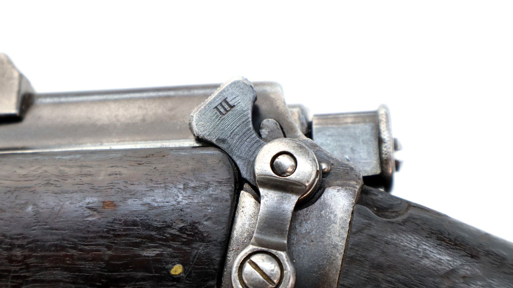 Main Description: Manufactured by Enfield 1917, serial numbers mismatched. Blade front sight with ears and ramp, adjustable u notched rear sight with ears. Four piece full military wood stocks, front and rear handguards are chipped and cracked, pistol grip, smooth brass butt plate with trap, stock cracked at heel, brass stock disk, sling and stacking swivels and bayonet lug.