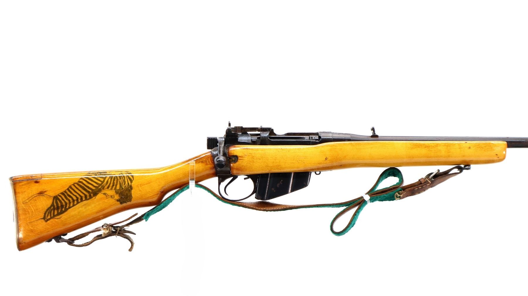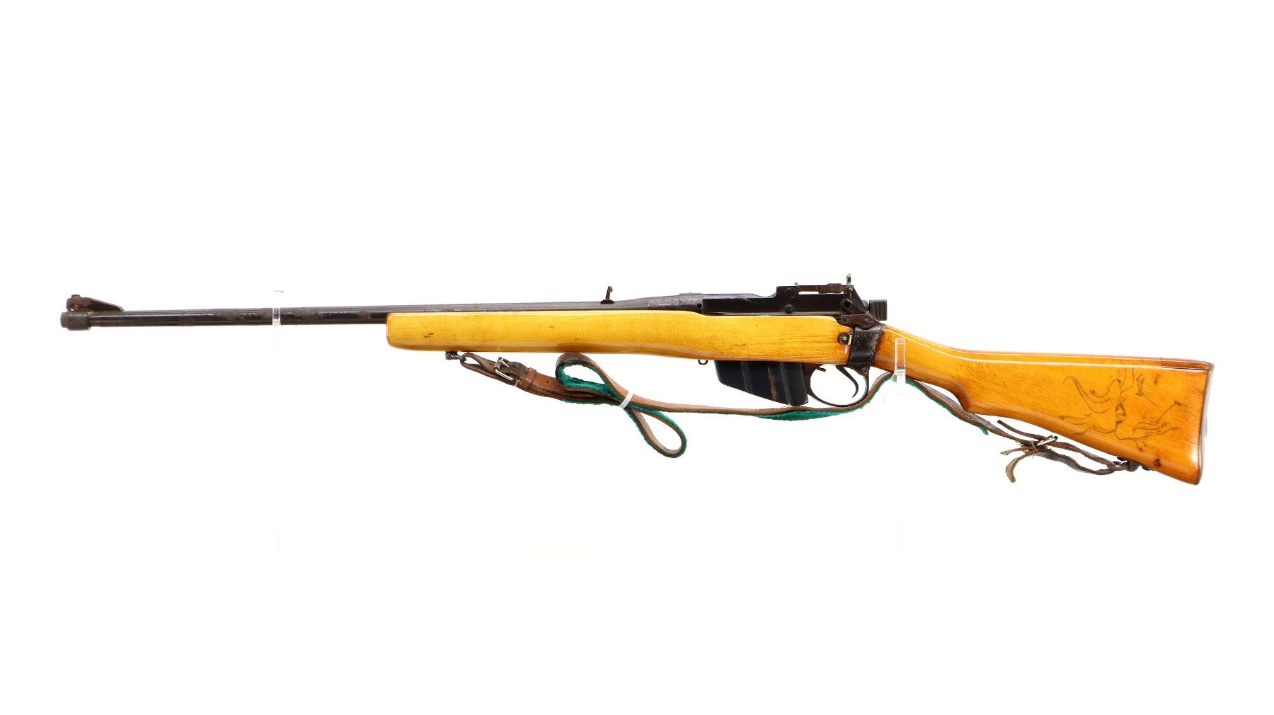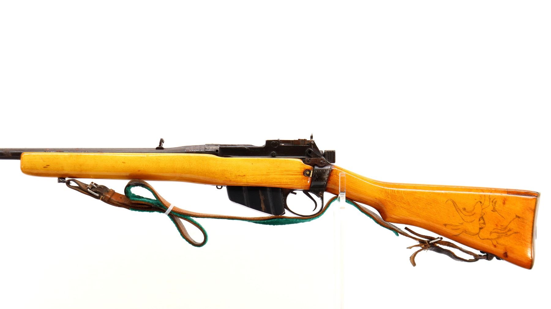Main Description: Manufactured by ROF, bolt matches. Blade front sight with ramp, adjustable milled rear peep sight, broken folding u notched rear sight on barrel. Two piece sporterized wood stocks, pistol grip, smooth brass butt plate with trap, arsenal repair at heel, sling swivels with brown/green leather sling. This firearm has custom artwork on both sides of the wooden stock which may be provocative and has therefore been slightly edited in the photo. The right side features a reclining figure wearing a striped outfit, drawn in more detail. The left side features a simple line drawing of two abstract human figures in a stylized pose.