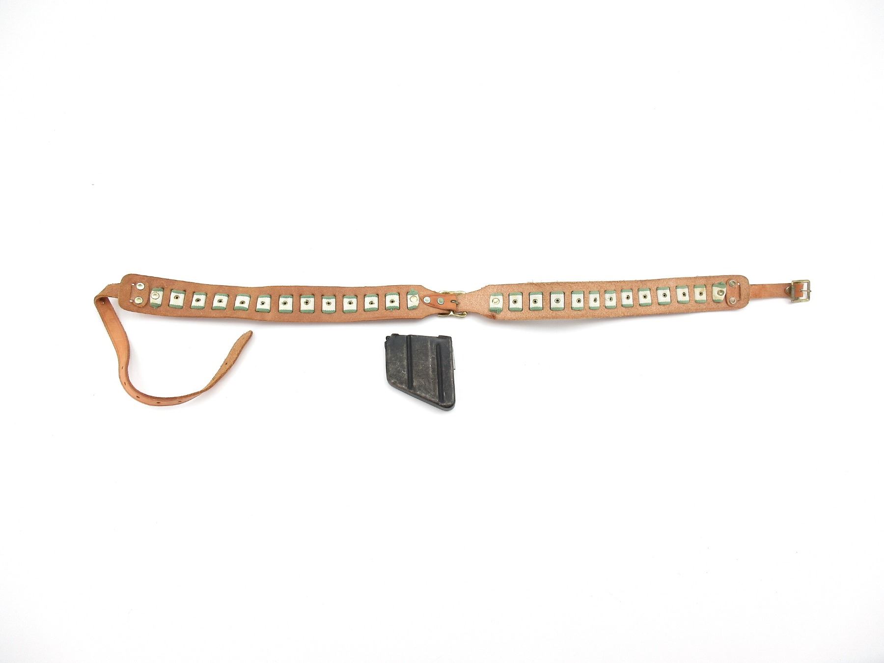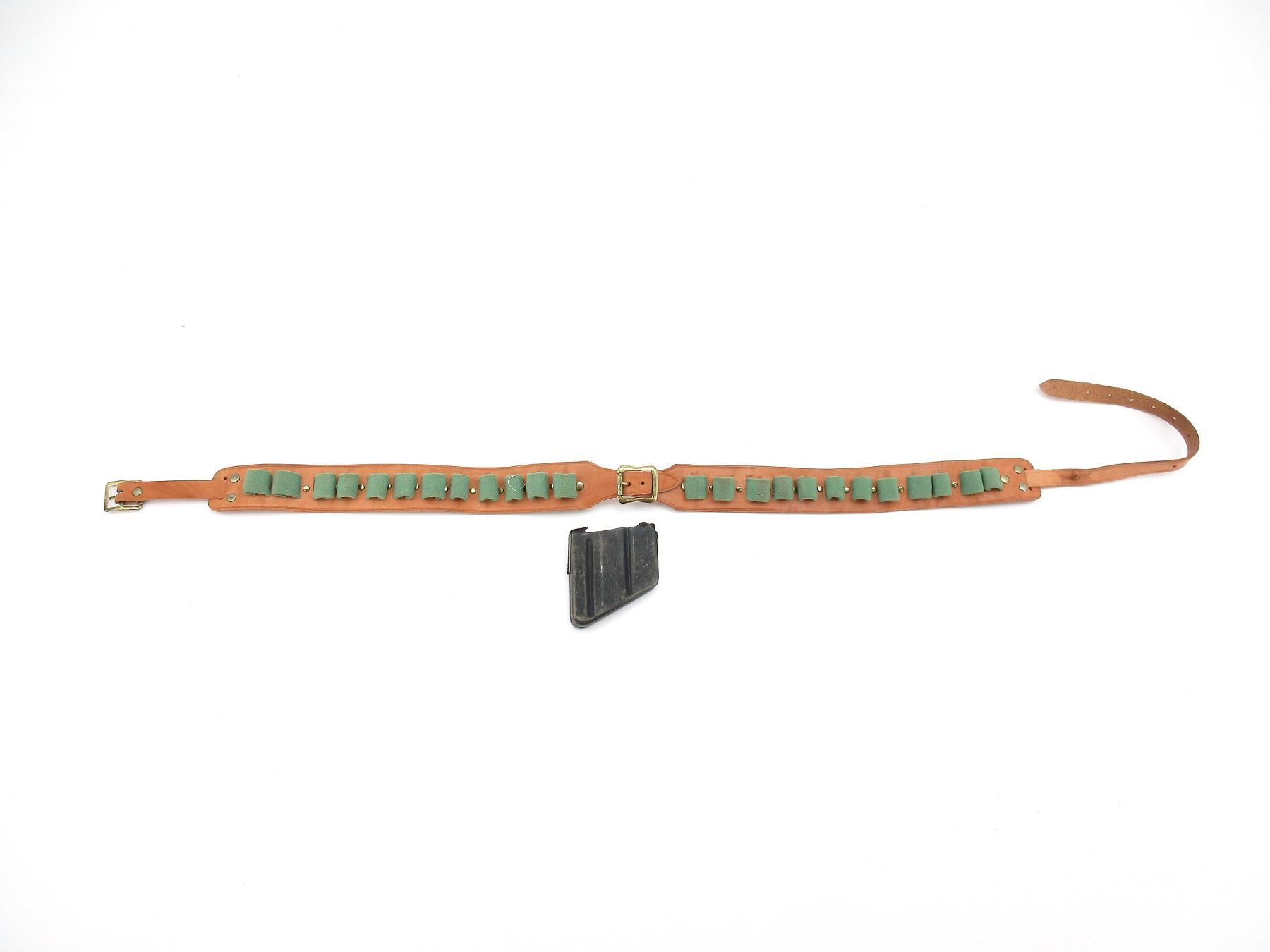 LOT INCLUDES; (1) RIFLE MAGAZINE, .303 BR, 10 ROUND MAG, BLUED STEEL CONSTRUCTION, UNCLEAR MARKING, (1) 12 GAUGE SHOTGUN BANDOLIER, BROWN LEATHER CONSTRUCTION, 24 NYLON LOOPS, HOLDS 12 GAUGE SHOTGUN SHELLS, ADJUSTABLE, OAL APPROX. 46". SEE PHOTOS. PAL REQUIRED.