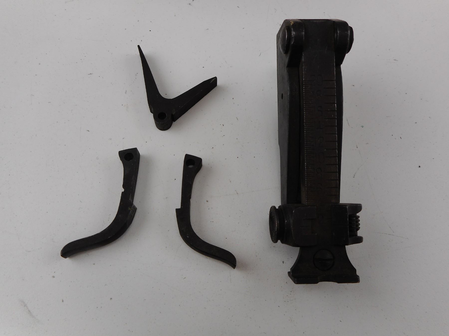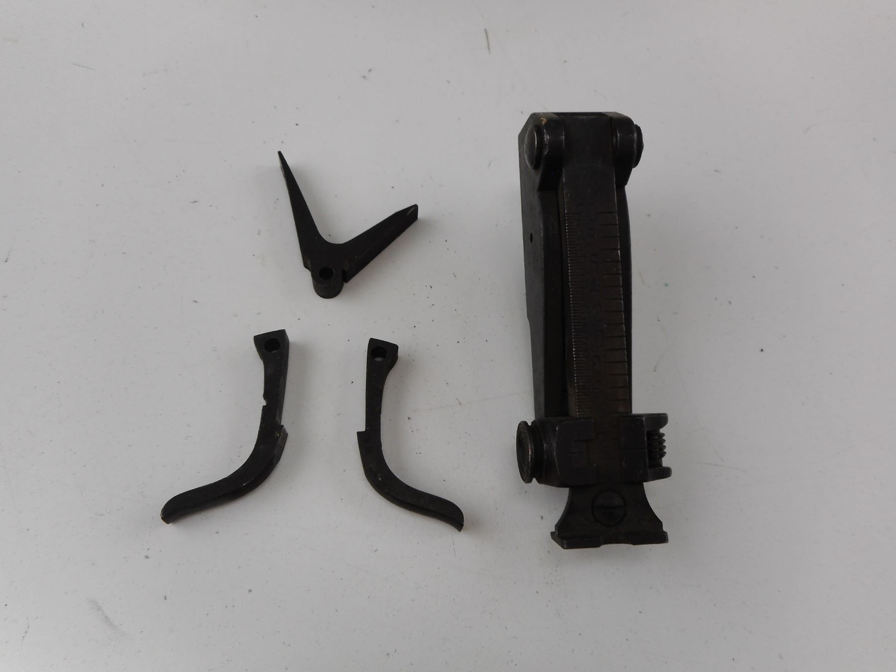 (1) REAR SIGHT WITH BASE, INCLUDES SPRING. (2) MAGAZINE CATCHES (1) SEAR. MAY REQUIRE FITTING. LOT OF 4