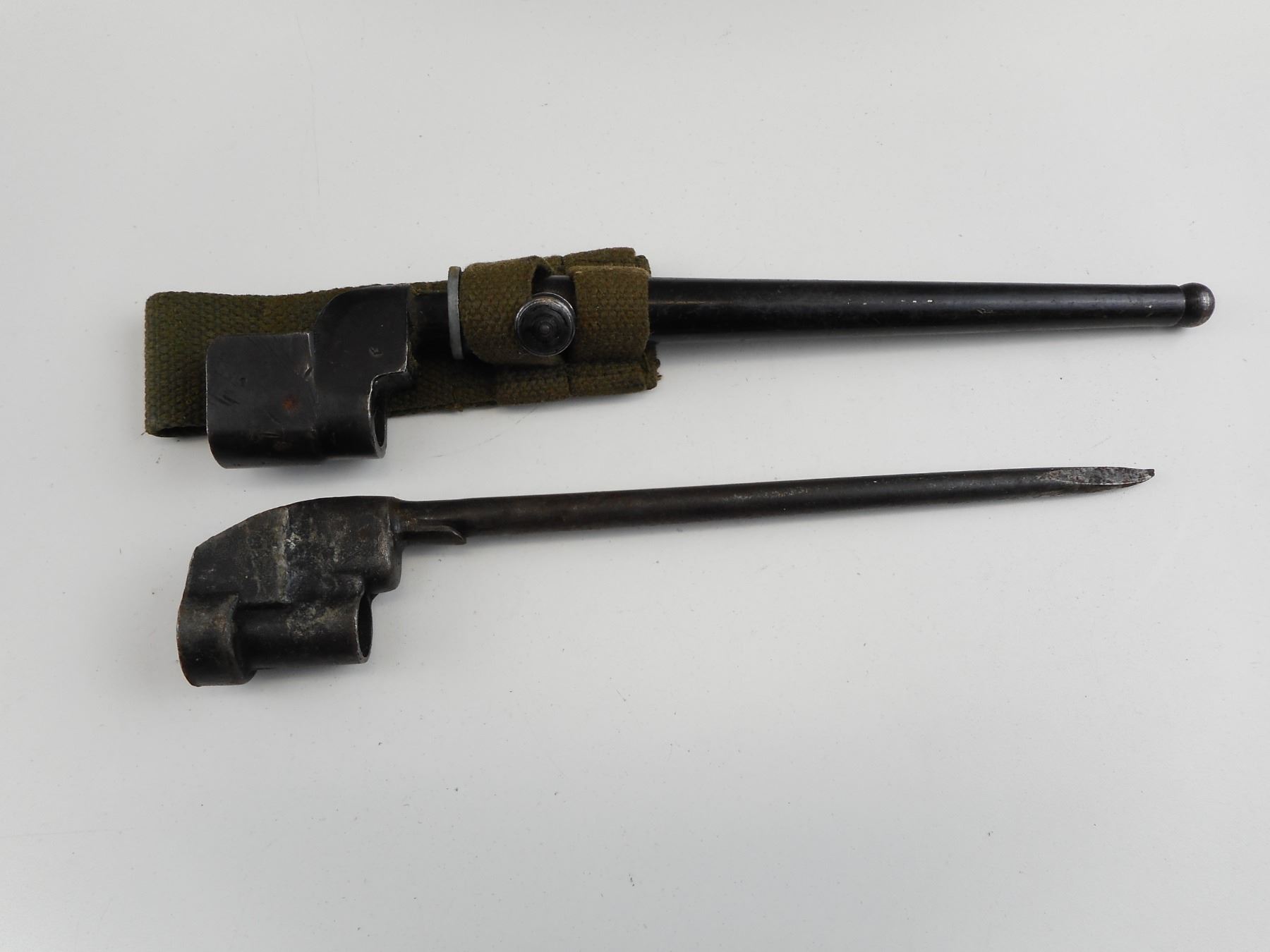 LEE ENFIELD NO4 SPIKE BAYONETS , (1) NO4 MKII WITH SCABBARD AND FROG, MARKED WITH A BROAD ARROW. (1) MKIII WITH NO SCABBARD MARKED WITH 58 BROAD ARROW. LOT 2