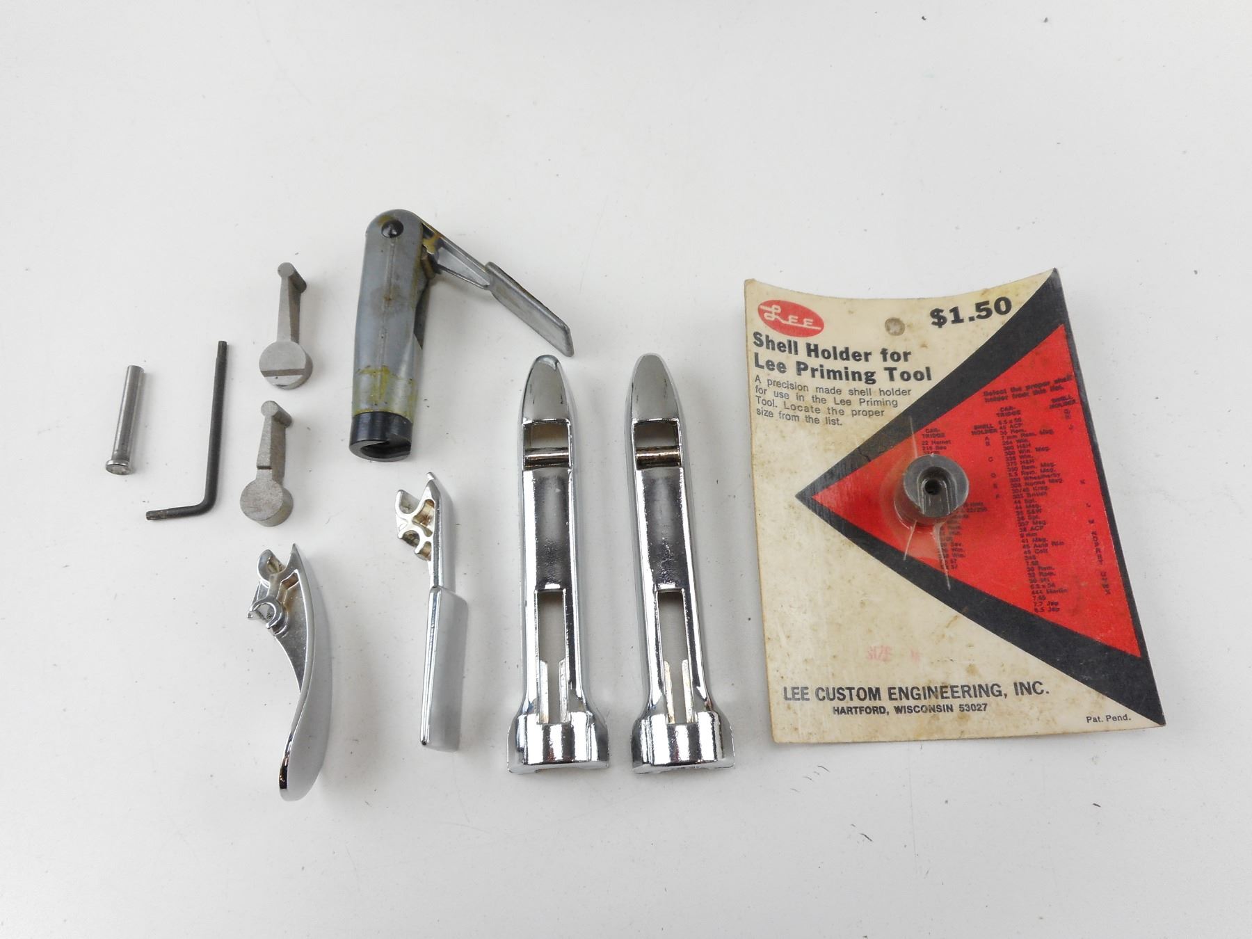 LEE HAND AUTO PRIME LOT , (1) OLDER PRIMING TOOL W/2 HOLDERS SIZE "M", "F", (2) BODYS, 2 LEVERS, 2 CONNECTING ARMS, 1 PIN (LG)