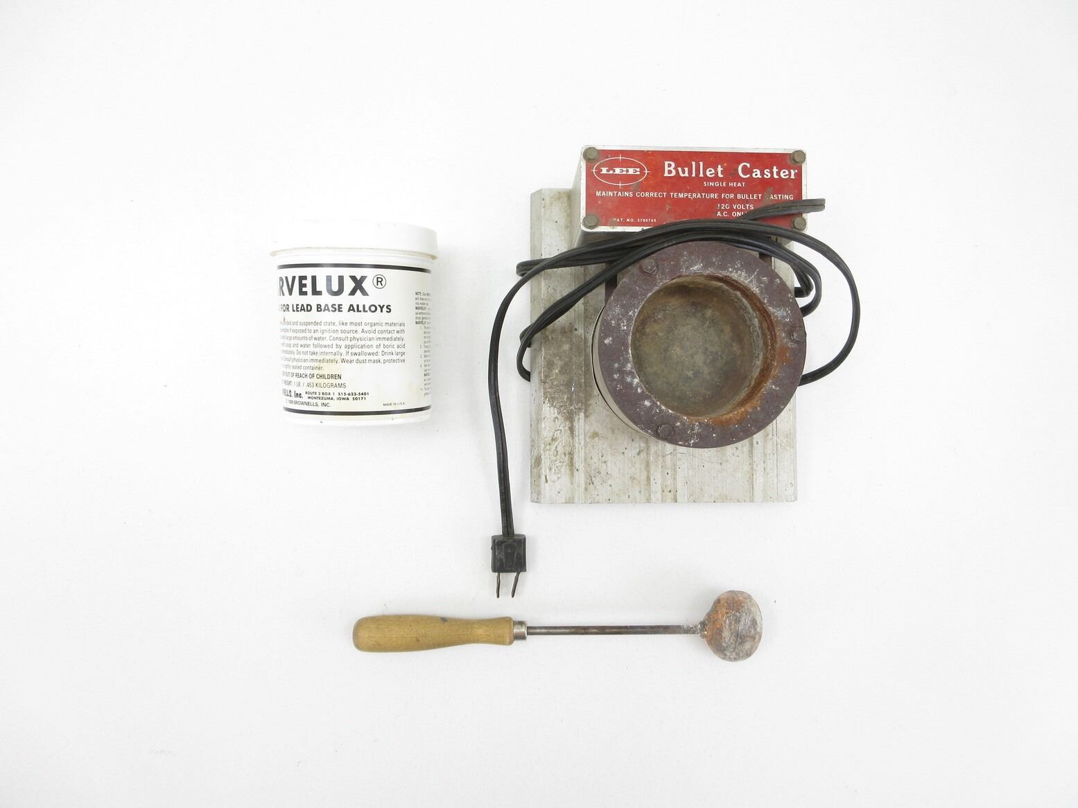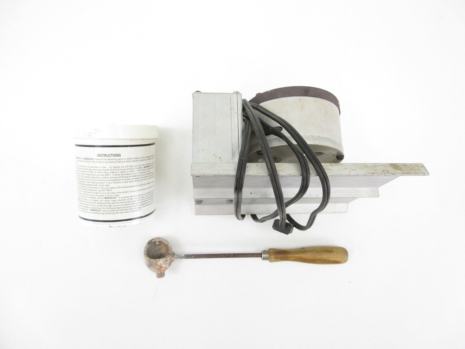 LEE LEAD MELTING POT LOT. LOT INCLUDES; (1) LEE BULLET CASTER, (1) BROWNELLS MARVELUX FLUX & (1) SCOOP WITH HANDLE ATTACHED, MAY REQUIRE ADJUSTMENTS AND/OR MAY NOT BE COMPLETE. SEE PHOTOS.