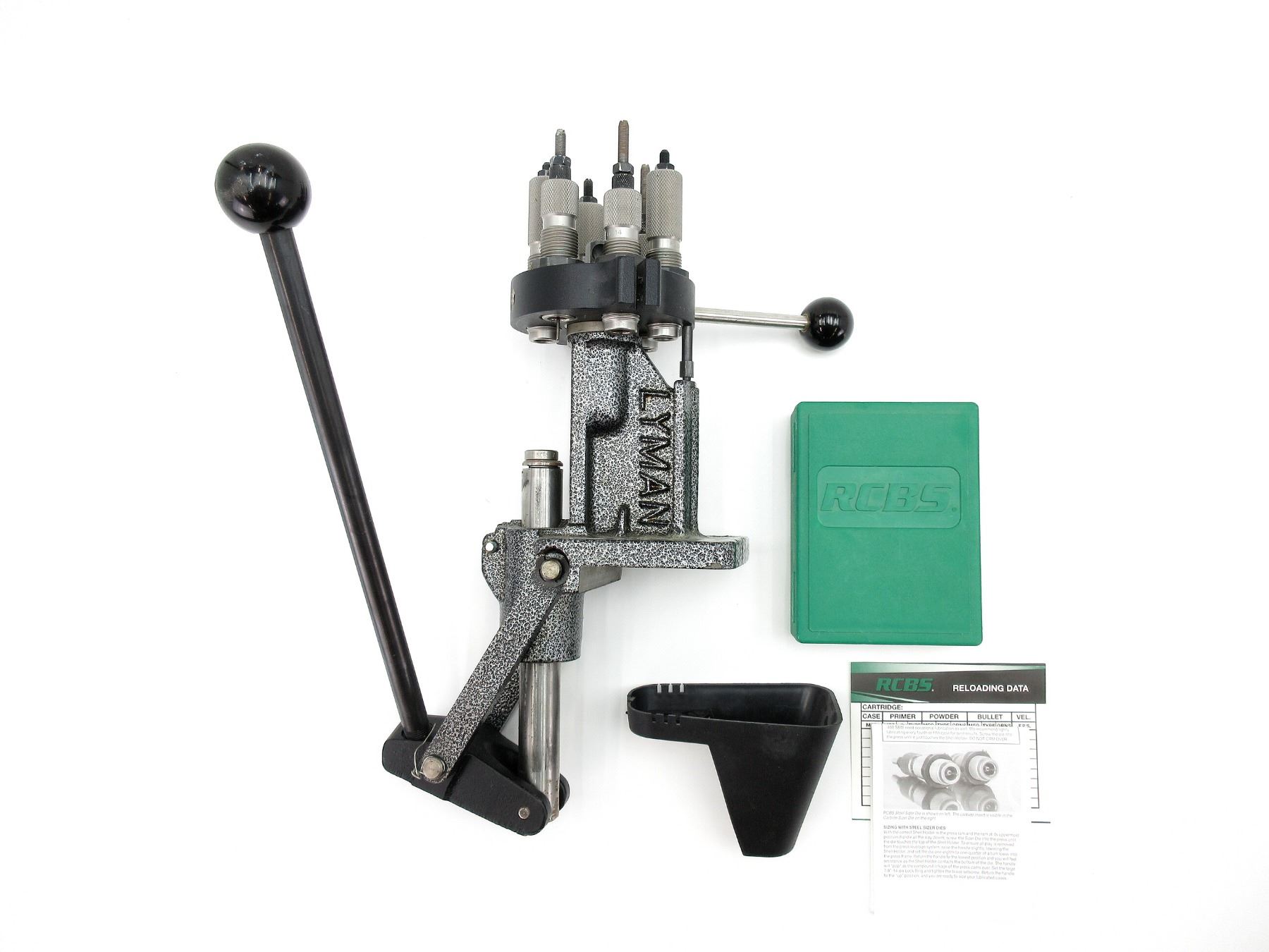 LOT INCLUDES; (1) RELOADING PRESS WITH (1) RCBS .270 WIN. 2-PIECE RELOADING DIES, (1) RCBS .30-06 2-PIECE RELOADING DIES, CONTAINER INCLUDED, (1) RCBS .303 BRITISH 2-PIECE RELOADING DIES, (1) RCBS #7 SHELL HOLDER & (1) PRIMER CATCH TRAY, MAY REQUIRE ADJUSTMENTS AND/OR MAY NOT BE COMPLETE. SEE PHOTOS.