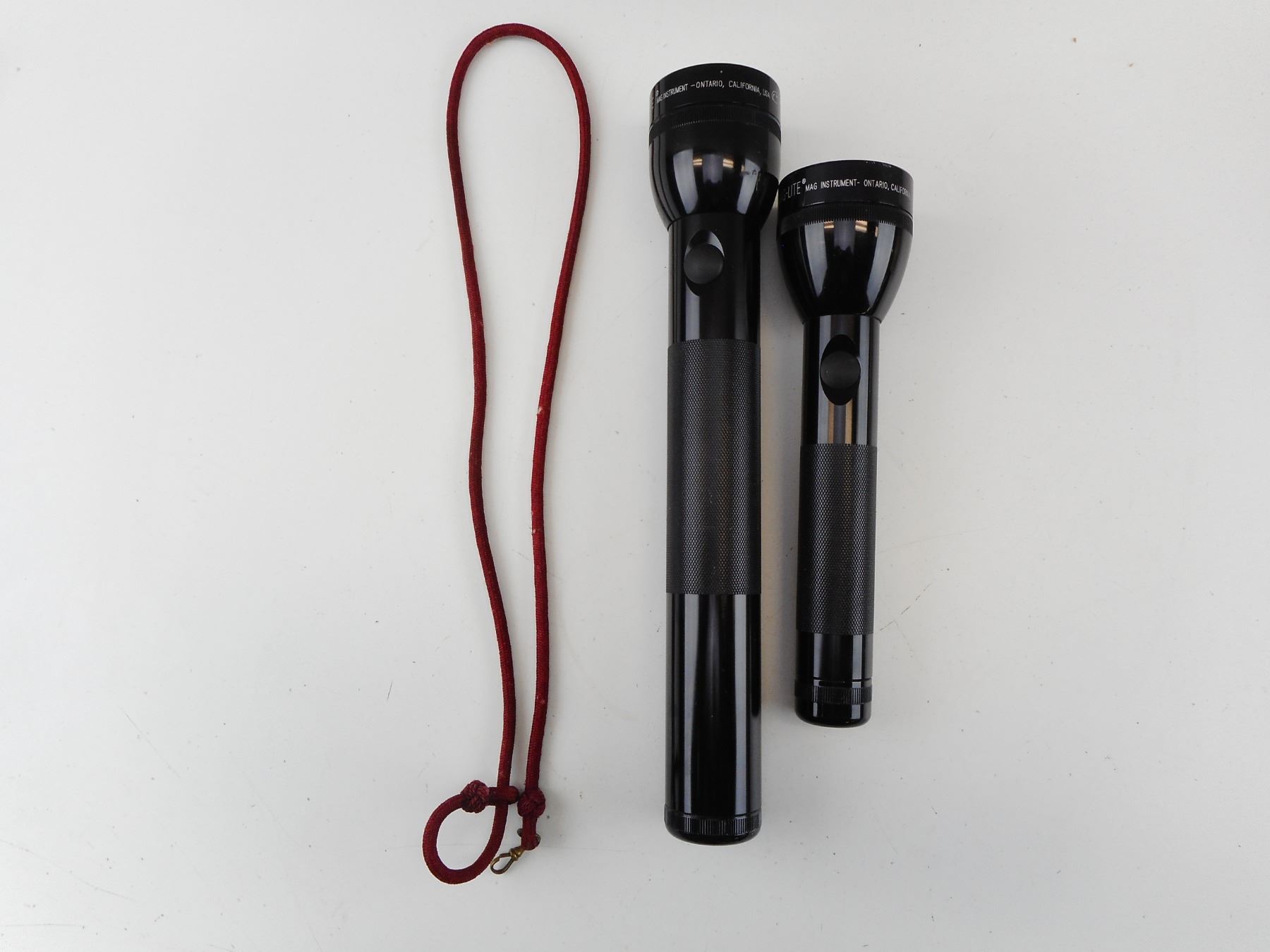 MAG-LITE FLASHLIGHTS , (1) APPROX. LENGTH 9" (1) APPROX. LENGTH 12.25". APPEAR TO BE IN WORKING CONDITION. (1) LANYARD. LOT OF 3