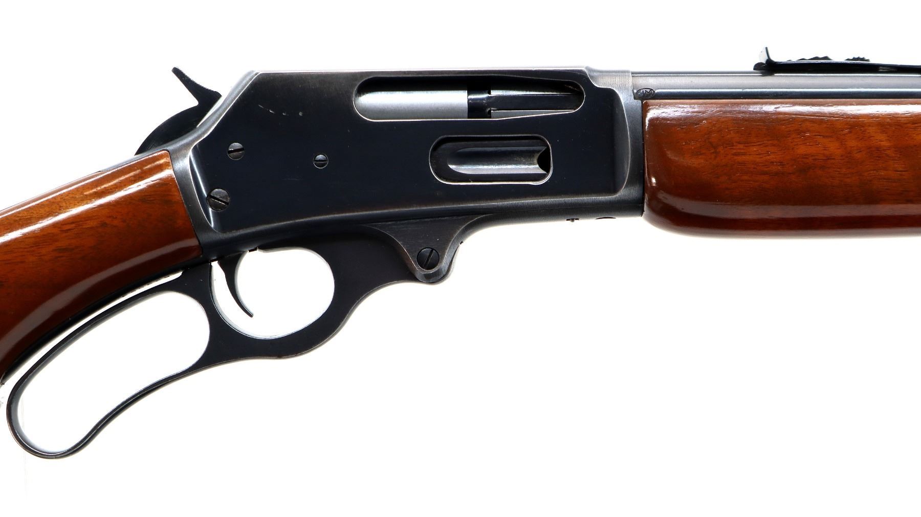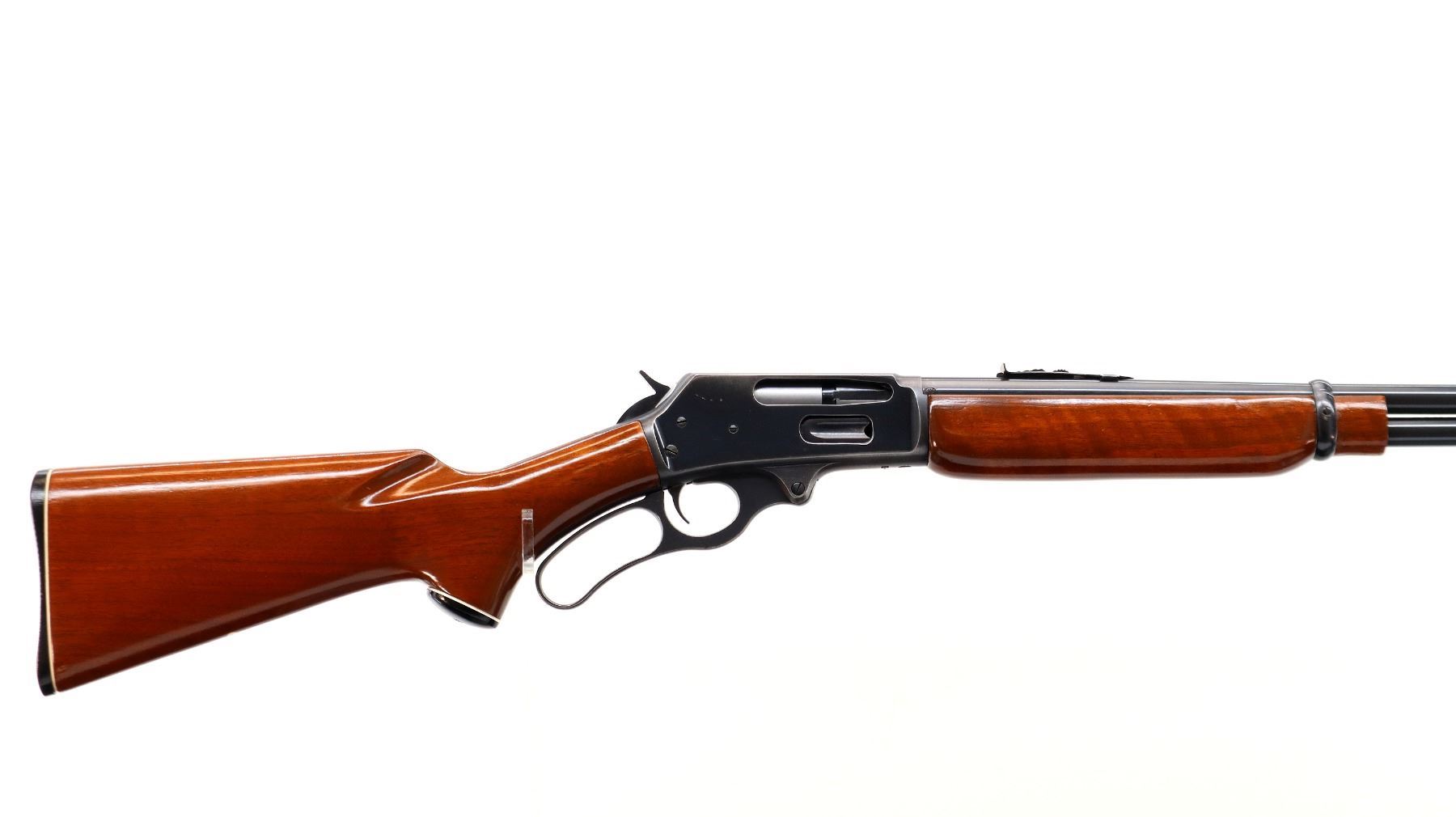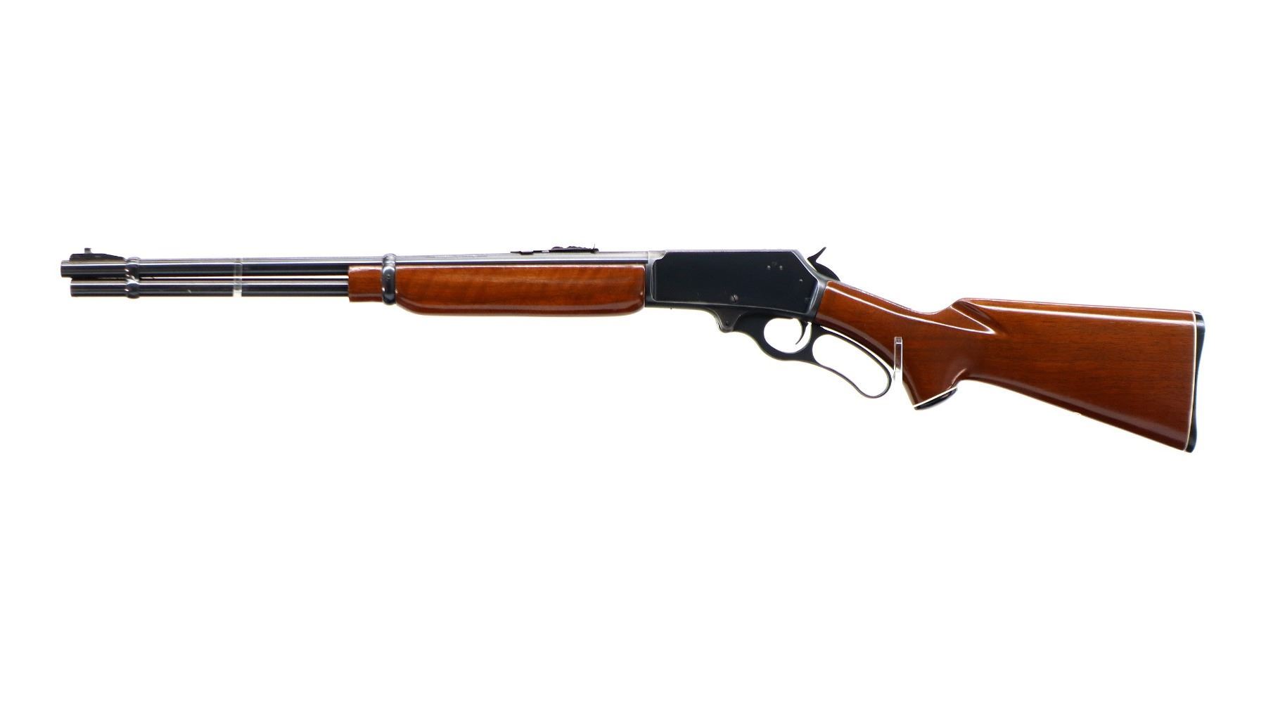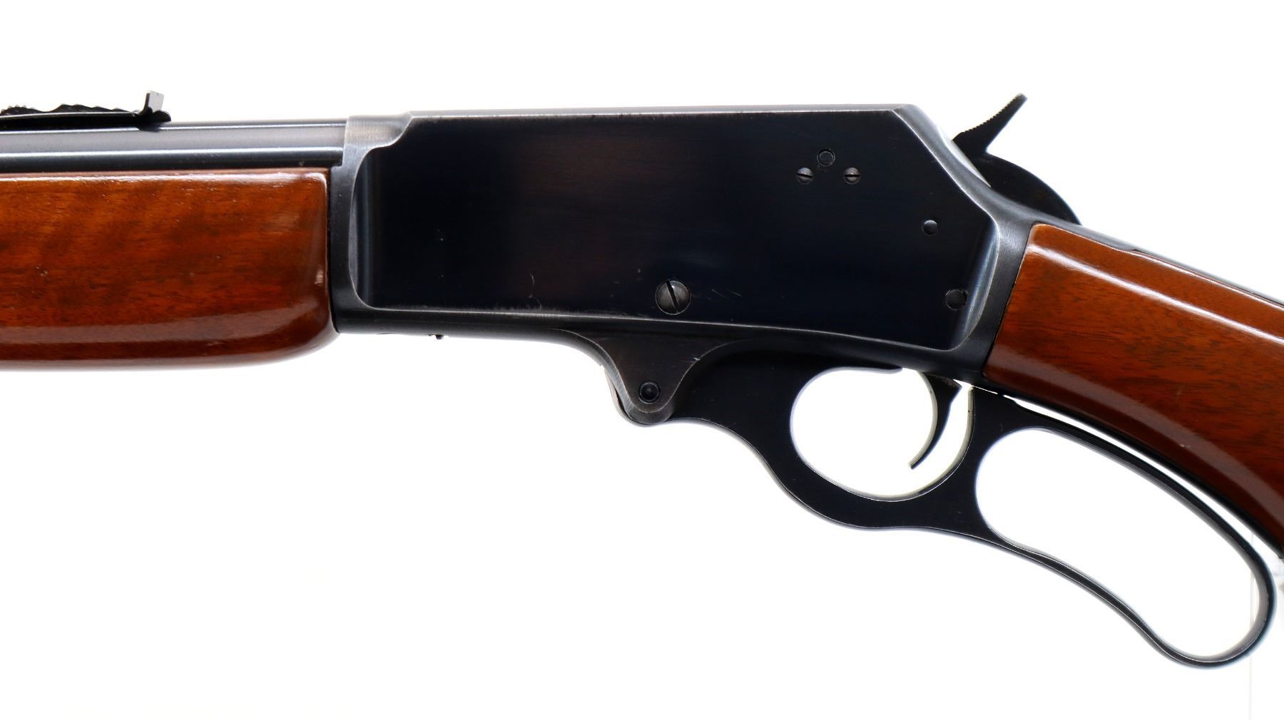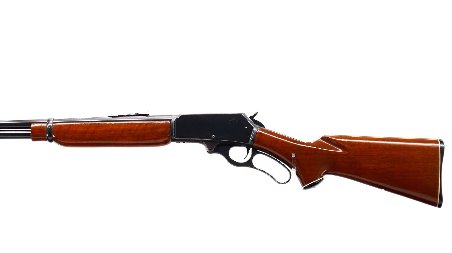 Main Description: Blade front sight with ramp, adjustable u notched rear sight, receiver drilled and tapped with plug screws installed, grooved spur hammer. Two piece wood stocks, pistol grip, checkered black polymer butt plate, Marlin Bullseye, grip cap, full length magtube.