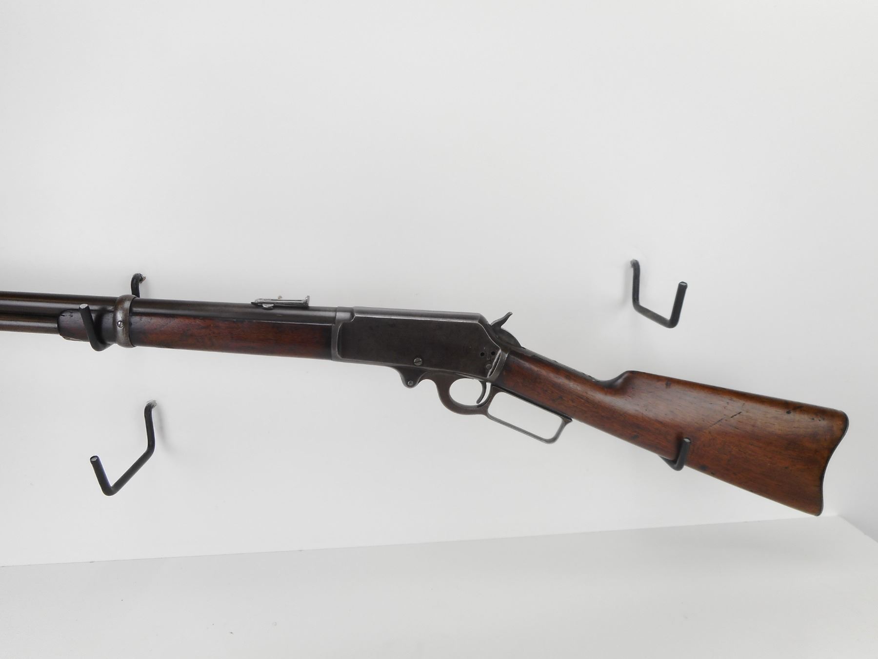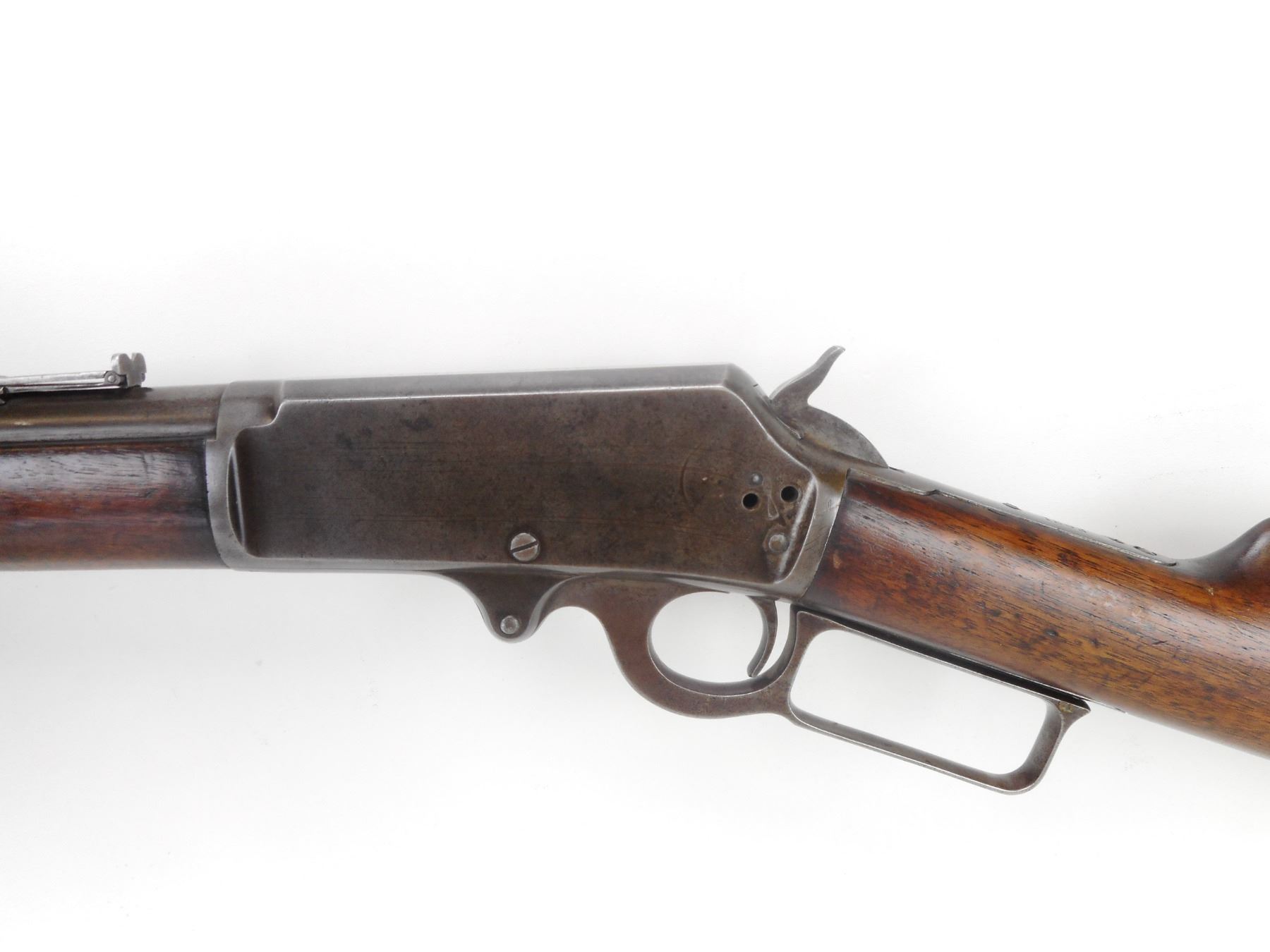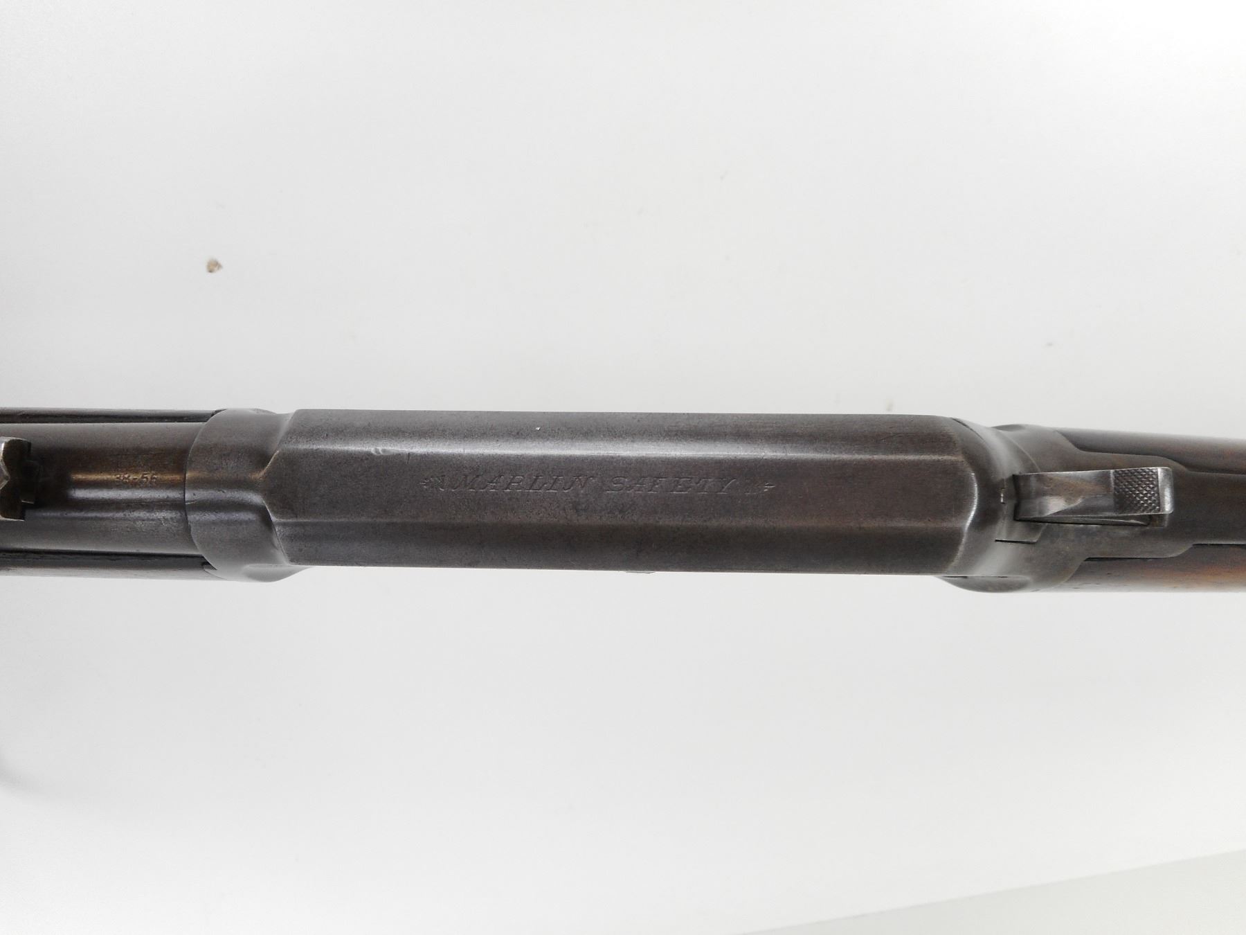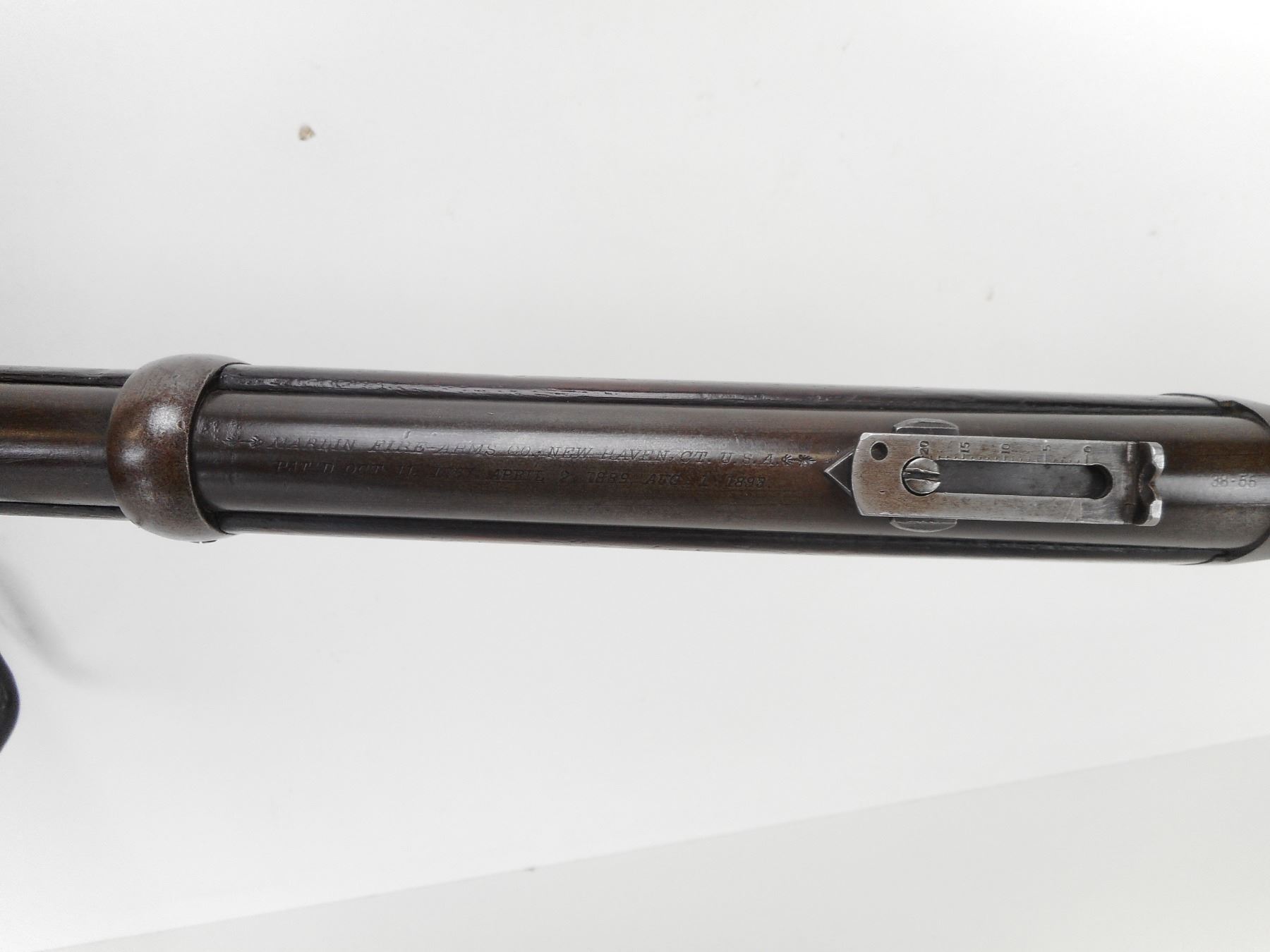 MARLIN , MODEL: 1893 , CALIBER: 38-55 , MANUFACTURED 1898. (USA ANTIQUE) VERY GOOD BORE. BLADE FRONT AND ADJUSTABLE REAR SIGHT.BARREL MARKED BLACK POWDER. TWO PIECE HARDWOOD STOCK. STEEL BUTTPLATE. MISSING STUDDS AND THE SADDLE RING. LARGE CRACK AND REPAIR IN FOREND. VERY LITTLE FINISH REMAINING ON ALL METAL PARTS. SHOWS SOME HANDLING MARKS. BARREL LENGTH: 20", CONDITION: 6/10 , STOCK # NR10535, SERIAL # 166287, CLASS: CANADIAN NON RESTRICTED CLASS