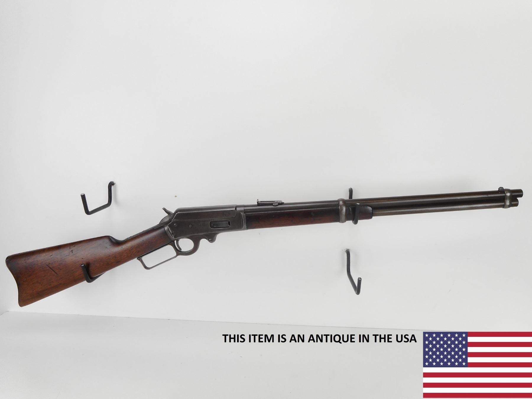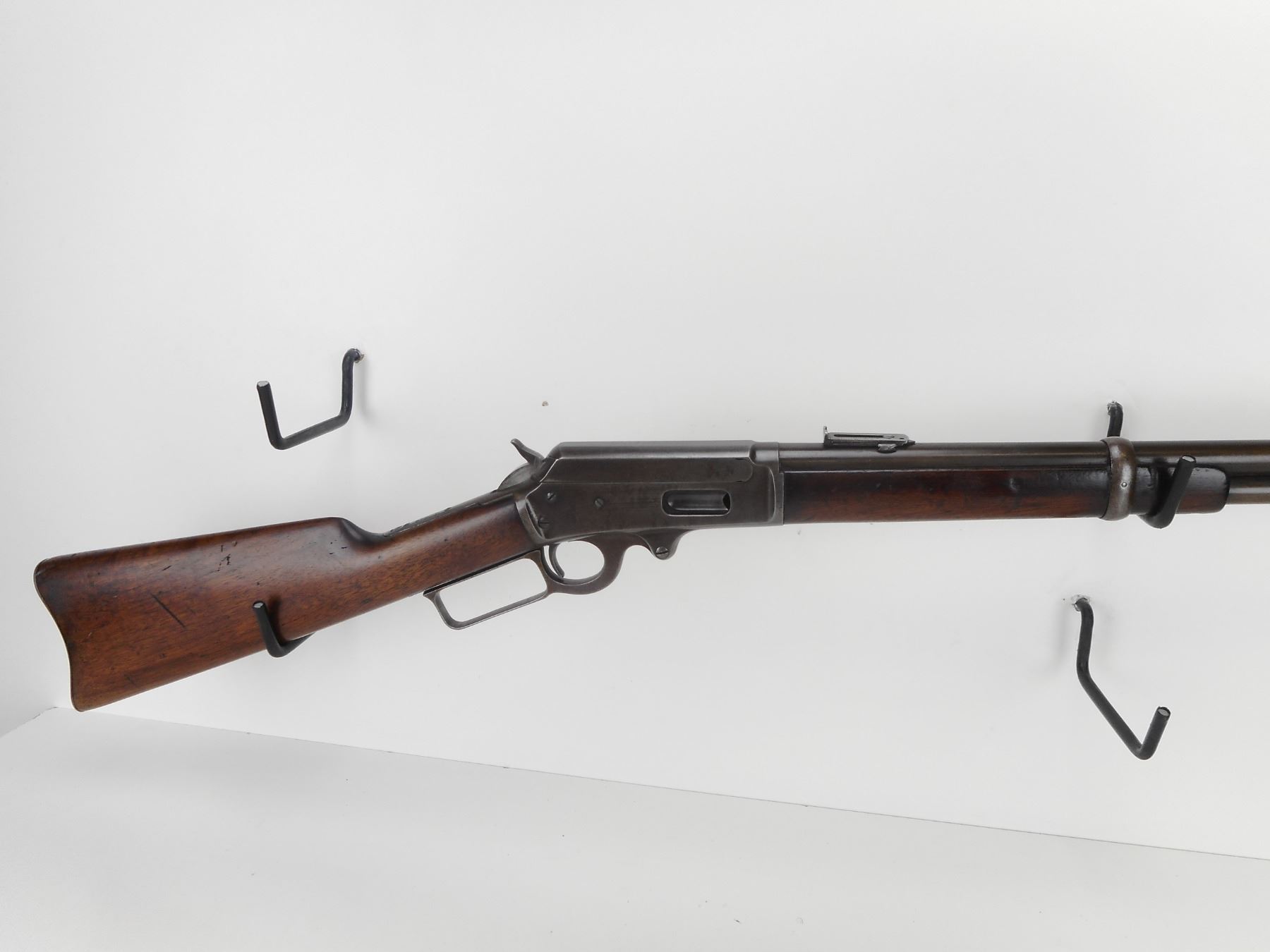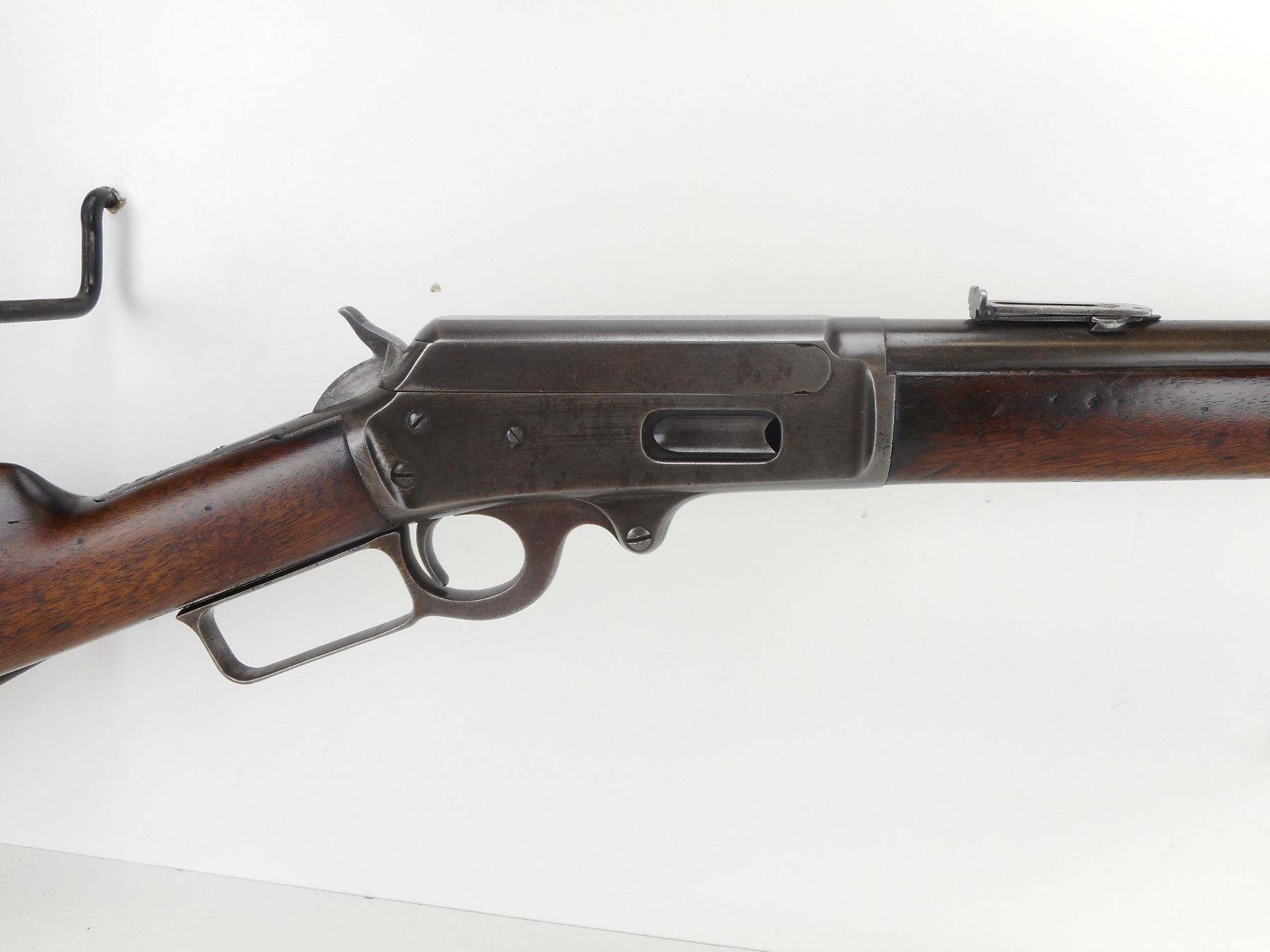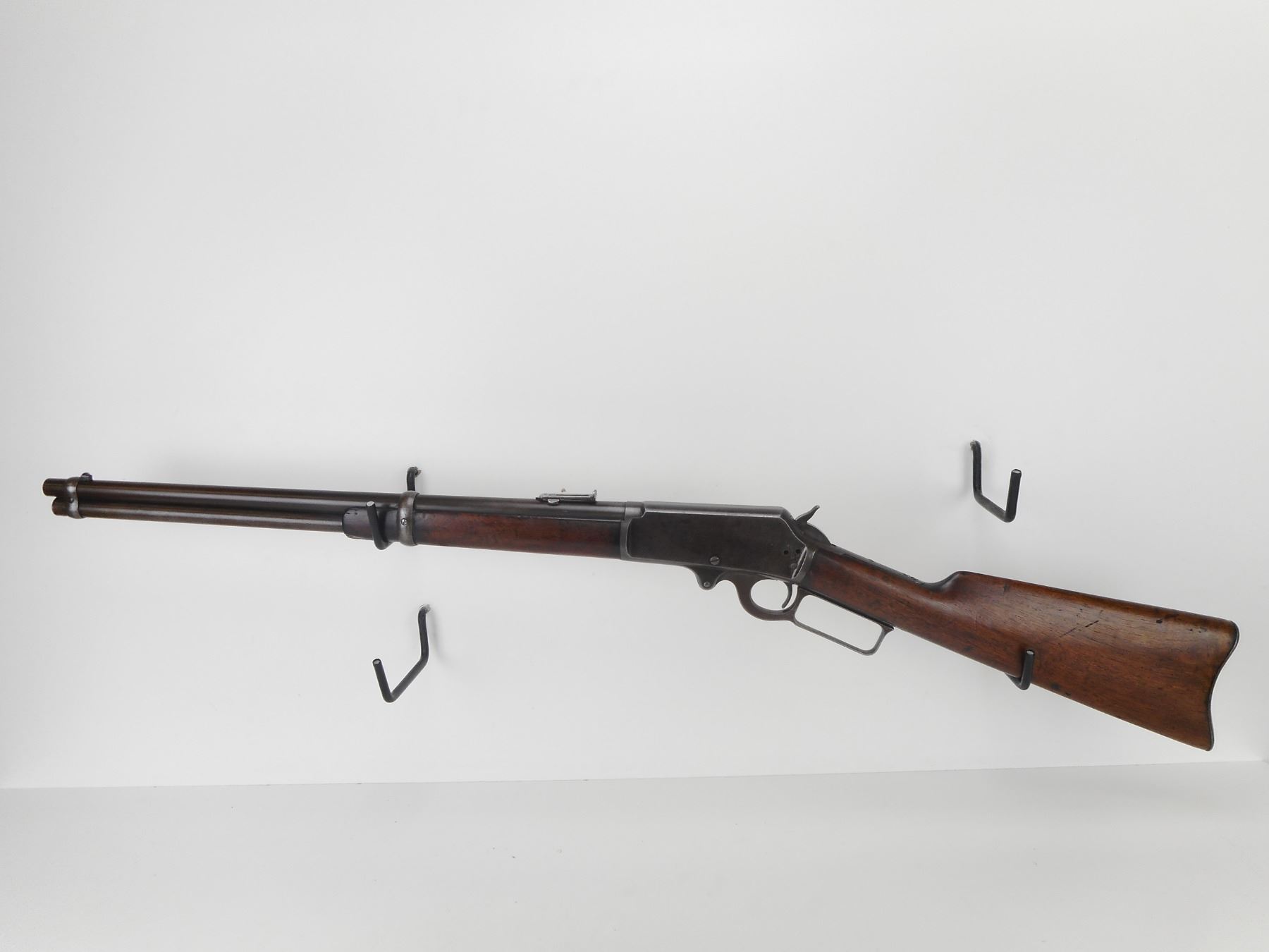 MARLIN , MODEL: 1893 , CALIBER: 38-55 , MANUFACTURED 1898. (USA ANTIQUE) VERY GOOD BORE. BLADE FRONT AND ADJUSTABLE REAR SIGHT.BARREL MARKED BLACK POWDER. TWO PIECE HARDWOOD STOCK. STEEL BUTTPLATE. MISSING STUDDS AND THE SADDLE RING. LARGE CRACK AND REPAIR IN FOREND. VERY LITTLE FINISH REMAINING ON ALL METAL PARTS. SHOWS SOME HANDLING MARKS. BARREL LENGTH: 20", CONDITION: 6/10 , STOCK # NR10535, SERIAL # 166287, CLASS: CANADIAN NON RESTRICTED CLASS