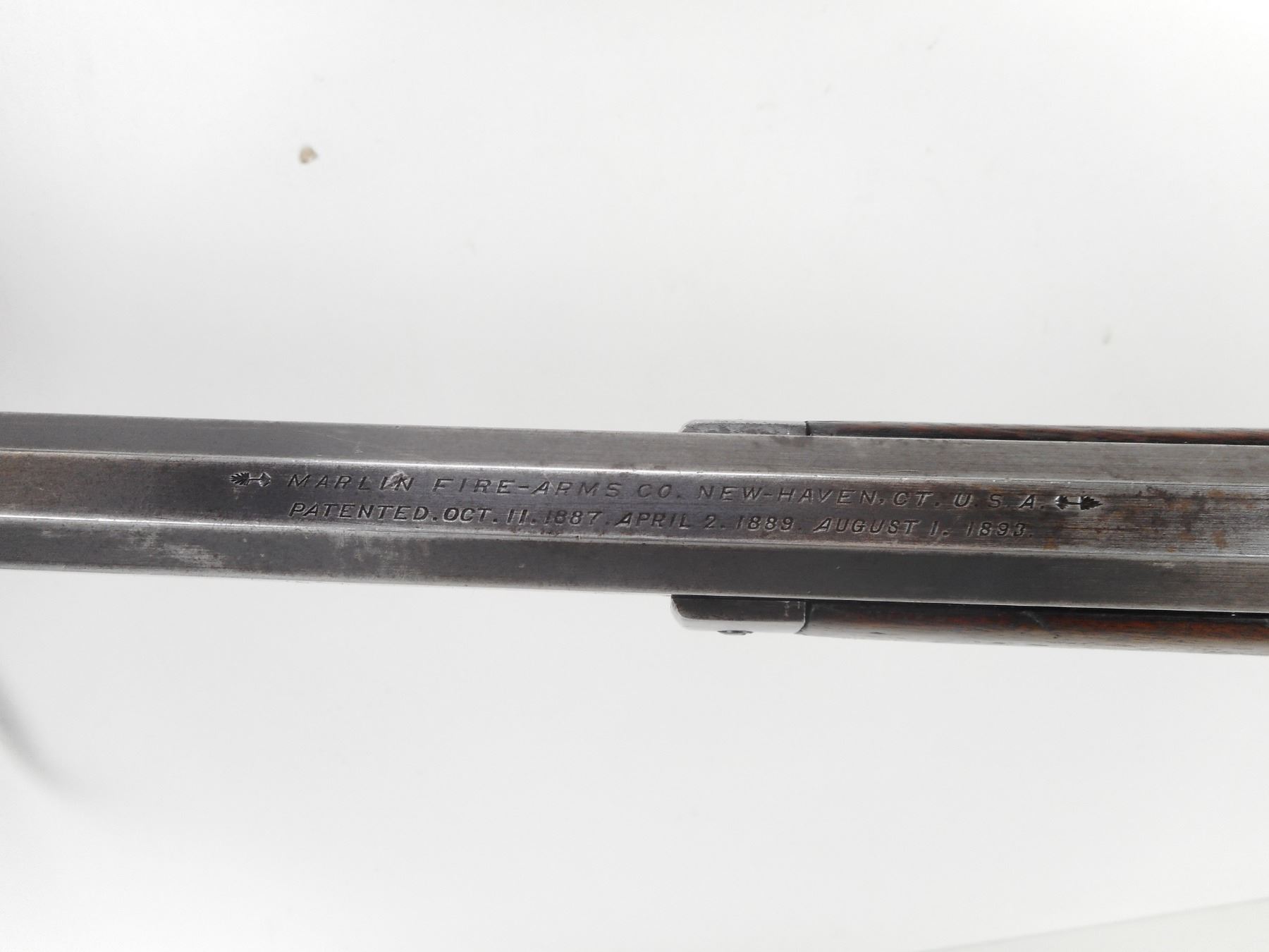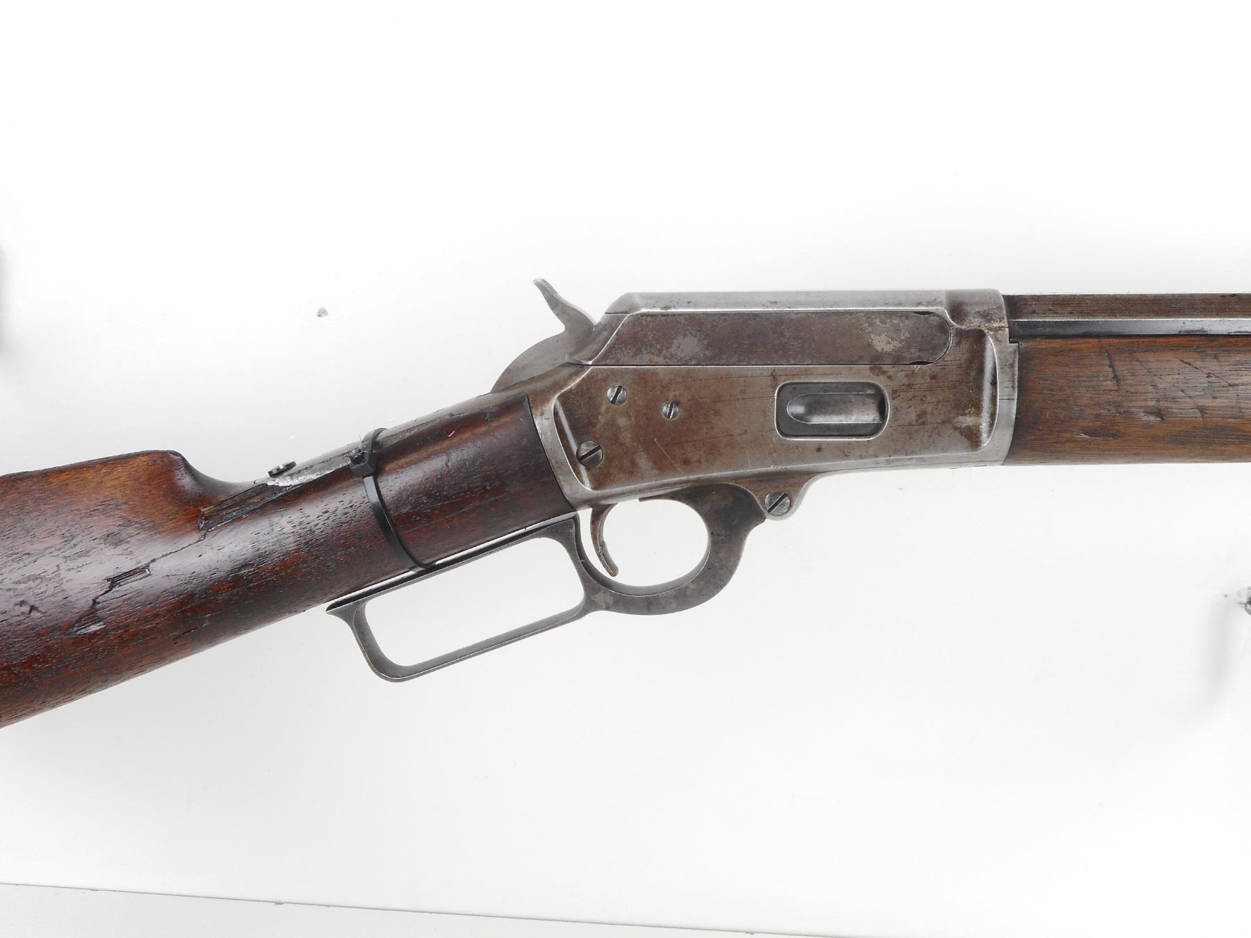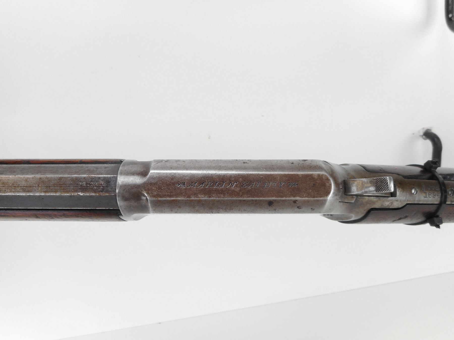 MARLIN , MODEL: 1894 , CALIBER: 25-20 , MANUFACTURED IN 1897. (USA ANTIQUE) VERY GOOD BORE. BLADE FRONT AND ADJUSTABLE REAR SIGHTS. OCTAGONAL BARREL. TWO PIECE HARDWOOD STOCK. CRESCENT STEEL BUTTPLATE. CHIPPED AND CRACKED BUTTSTOCK. VERY LITTLE FINISH REMAINING ON ALL METAL PARTS. SHOWS EXTENSIVE HANDLING MARKS. BARREL LENGTH: 24" , CONDITION: 5/10 , STOCK # NR10543, SERIAL # 147954, CLASS: CANADIAN NON RESTRICTED CLASS