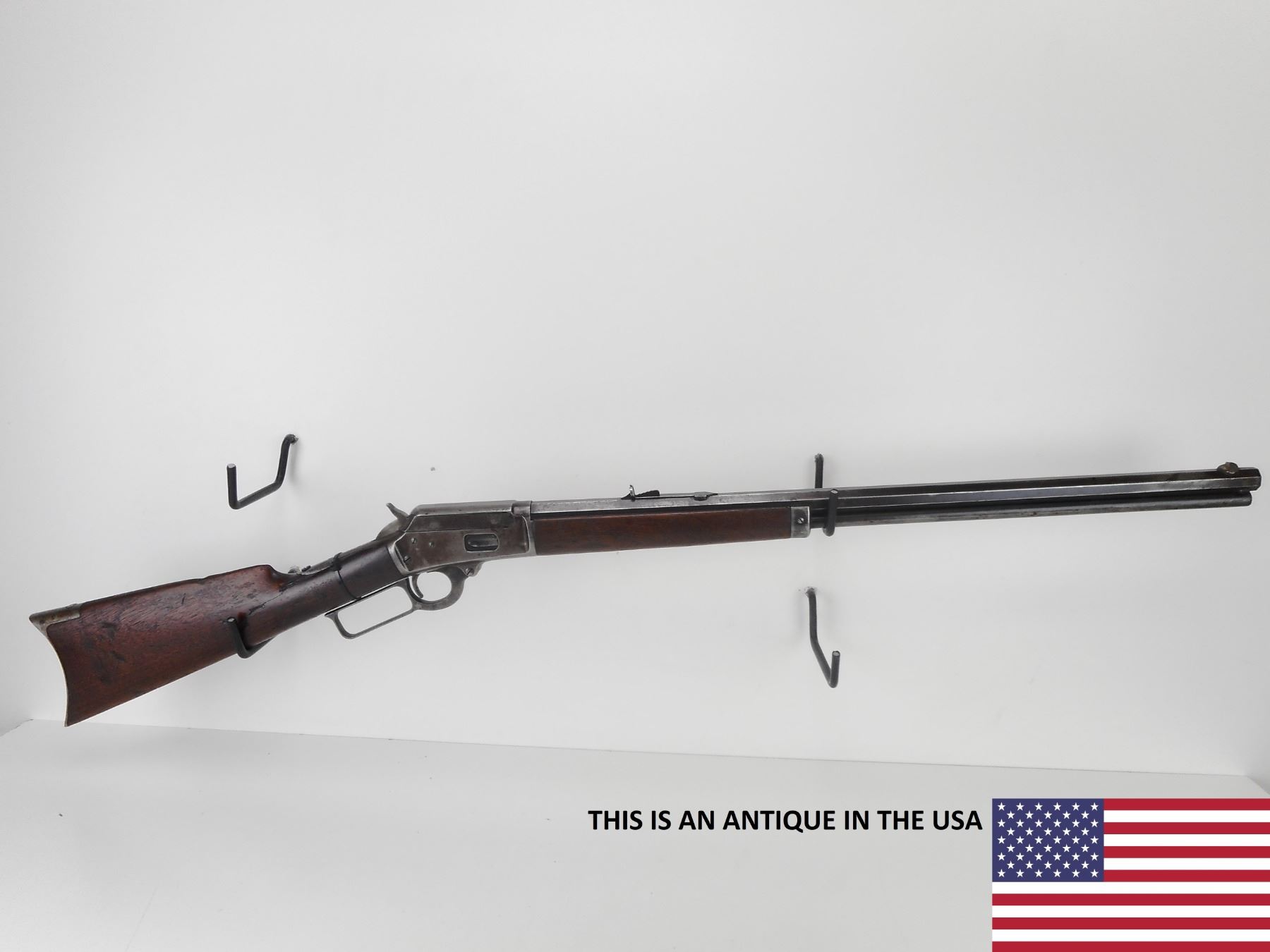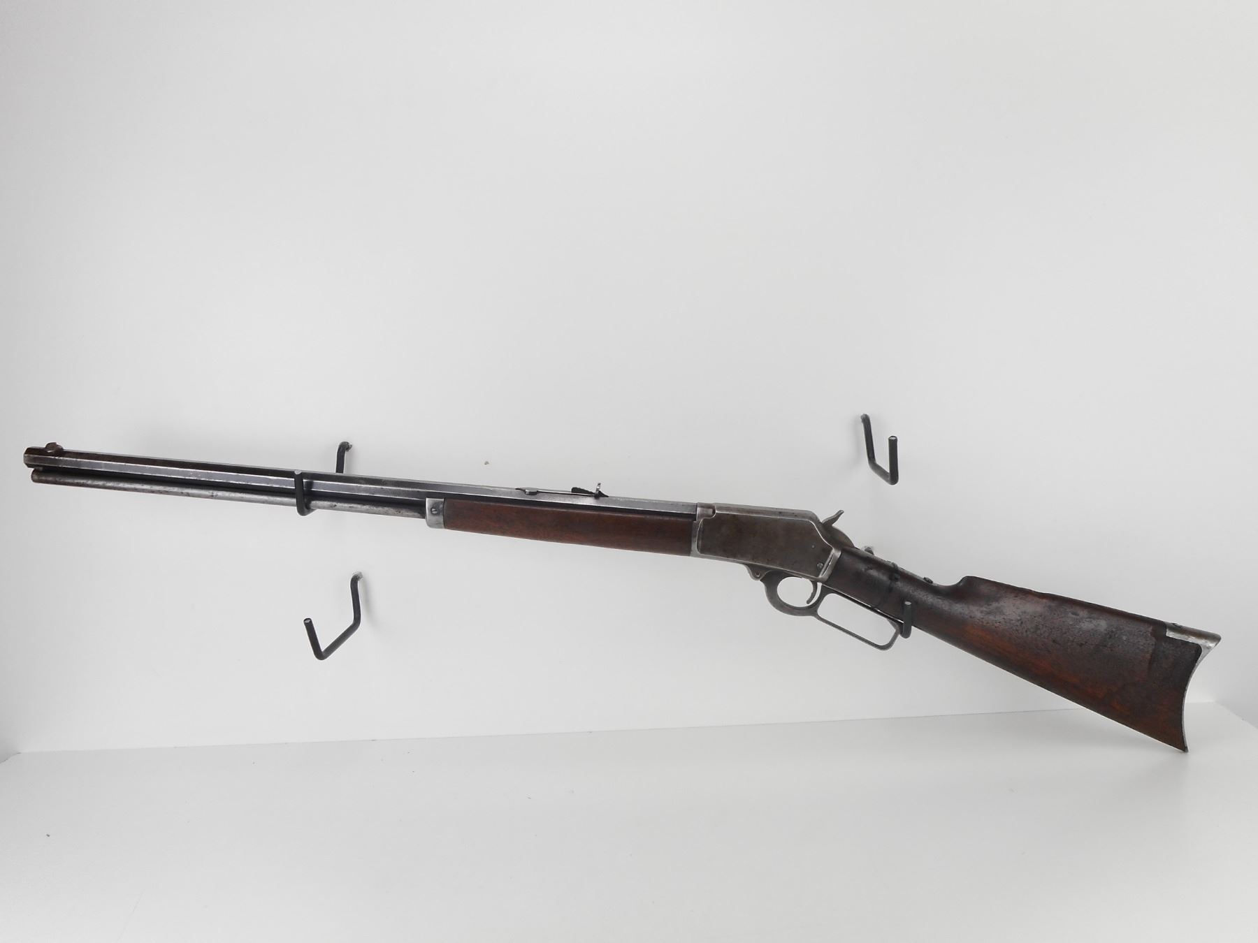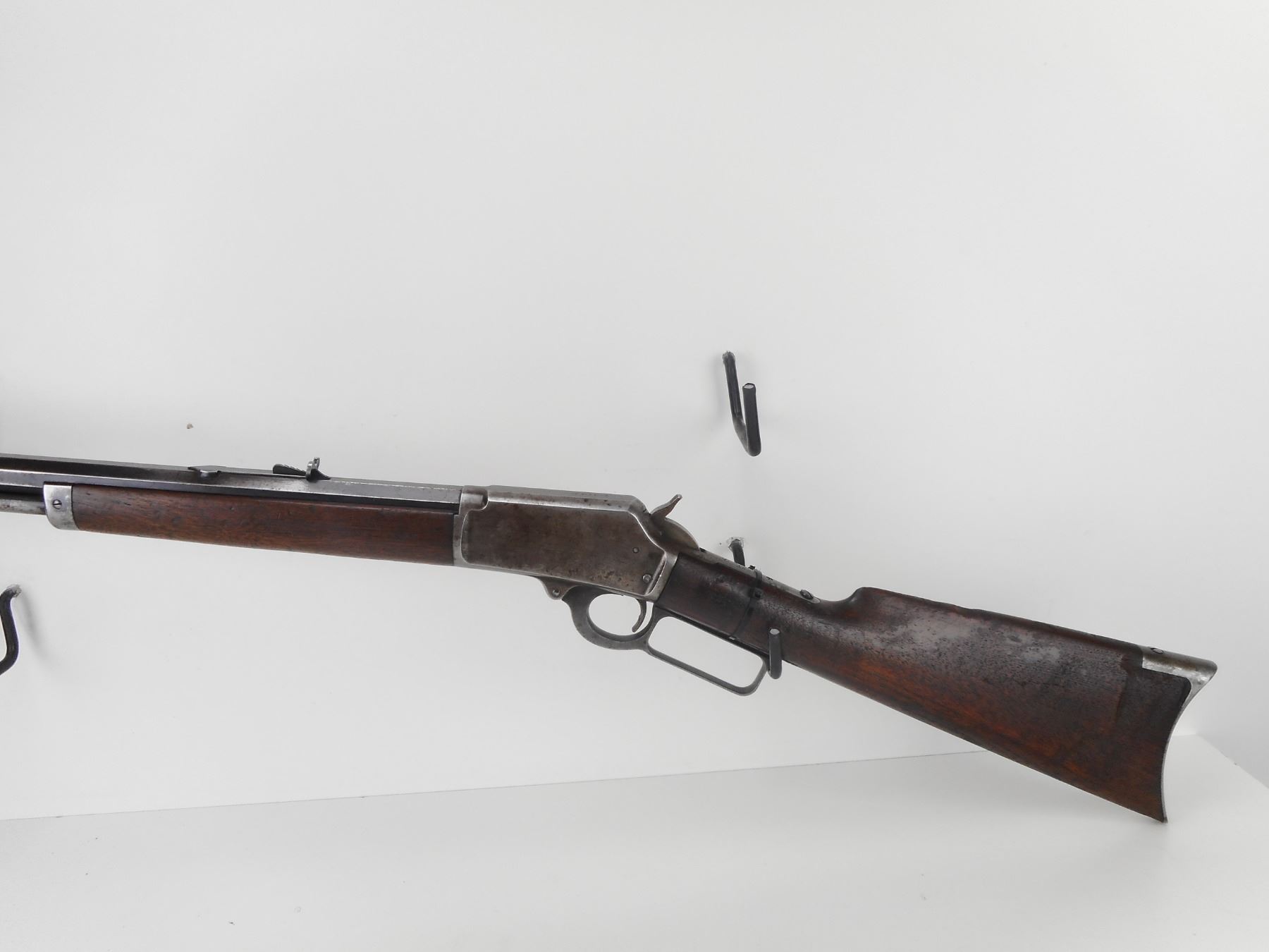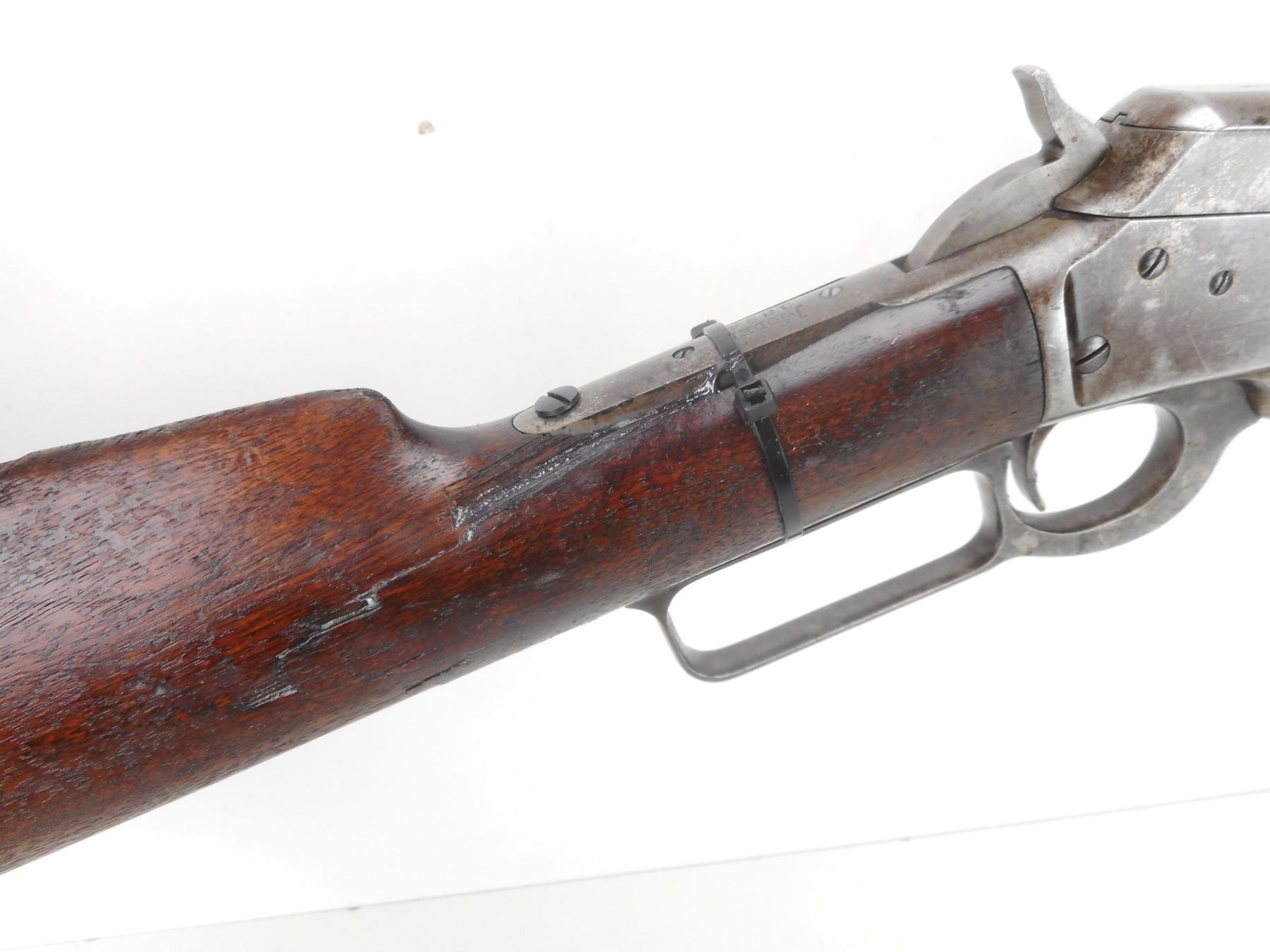 MARLIN , MODEL: 1894 , CALIBER: 25-20 , MANUFACTURED IN 1897. (USA ANTIQUE) VERY GOOD BORE. BLADE FRONT AND ADJUSTABLE REAR SIGHTS. OCTAGONAL BARREL. TWO PIECE HARDWOOD STOCK. CRESCENT STEEL BUTTPLATE. CHIPPED AND CRACKED BUTTSTOCK. VERY LITTLE FINISH REMAINING ON ALL METAL PARTS. SHOWS EXTENSIVE HANDLING MARKS. BARREL LENGTH: 24" , CONDITION: 5/10 , STOCK # NR10543, SERIAL # 147954, CLASS: CANADIAN NON RESTRICTED CLASS