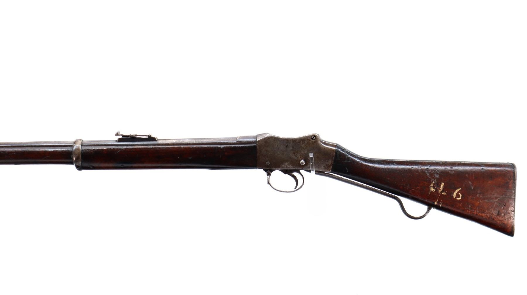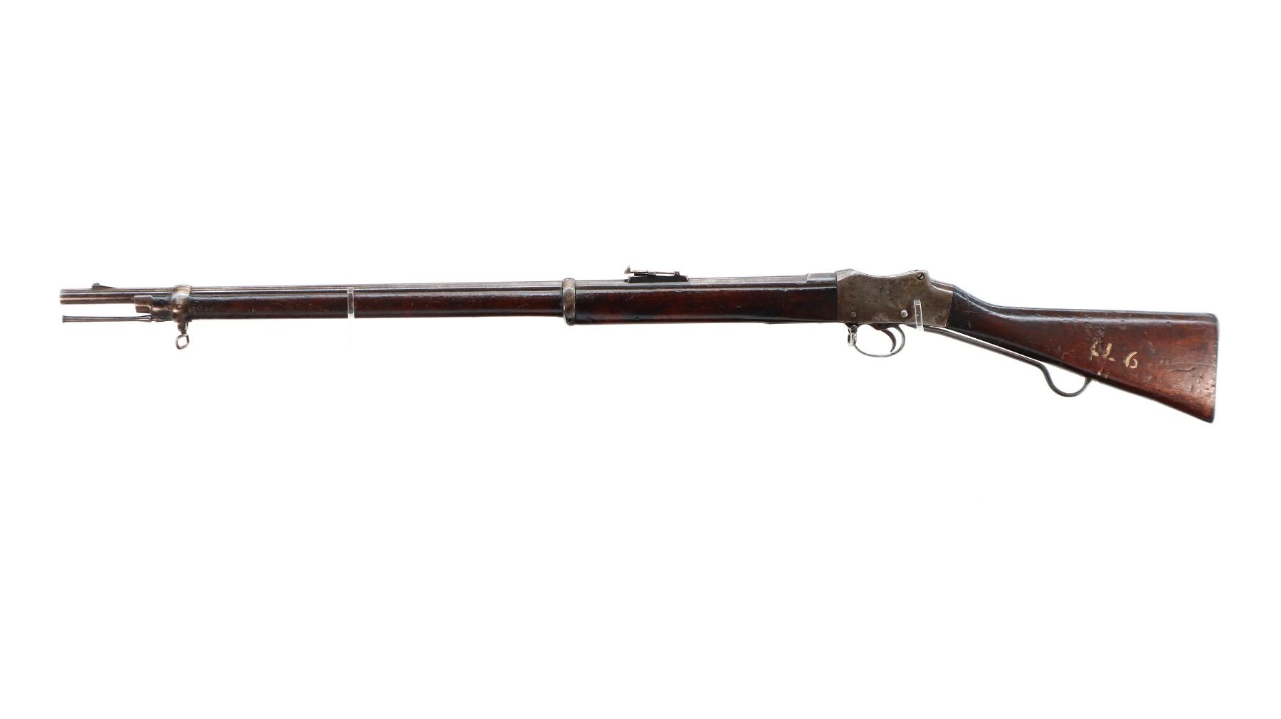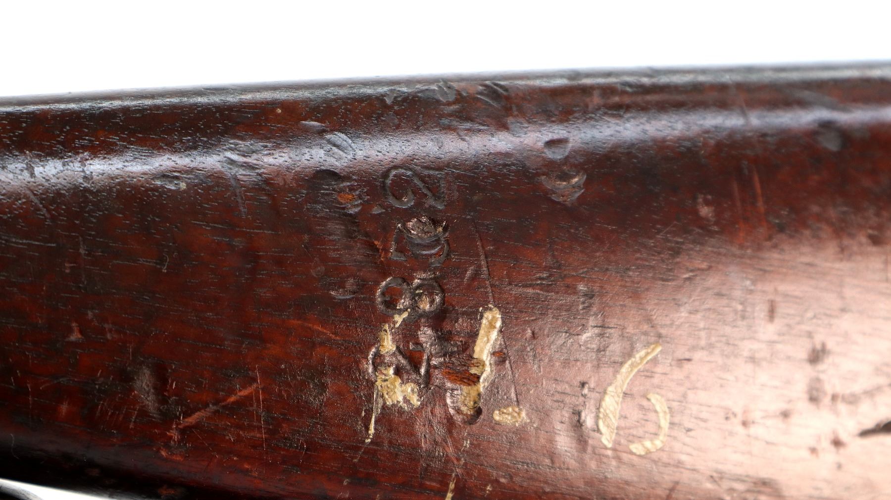 Main Description: Manufactured by Enfield 1877. Blade front sight with ramp, adjustable u notched ladder rear sight, small cocking indicator, long lever. Two piece full military wood stocks, forearm is chipped and cracked with arsenal repair, straight grip, chipped and cracked behind receiver, smooth steel butt plate, stock cracked at heel and toe with various partial markings on both sides. Sling swivels, bayonet lug, ramrod.