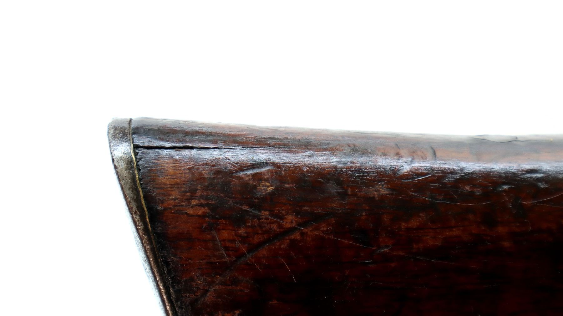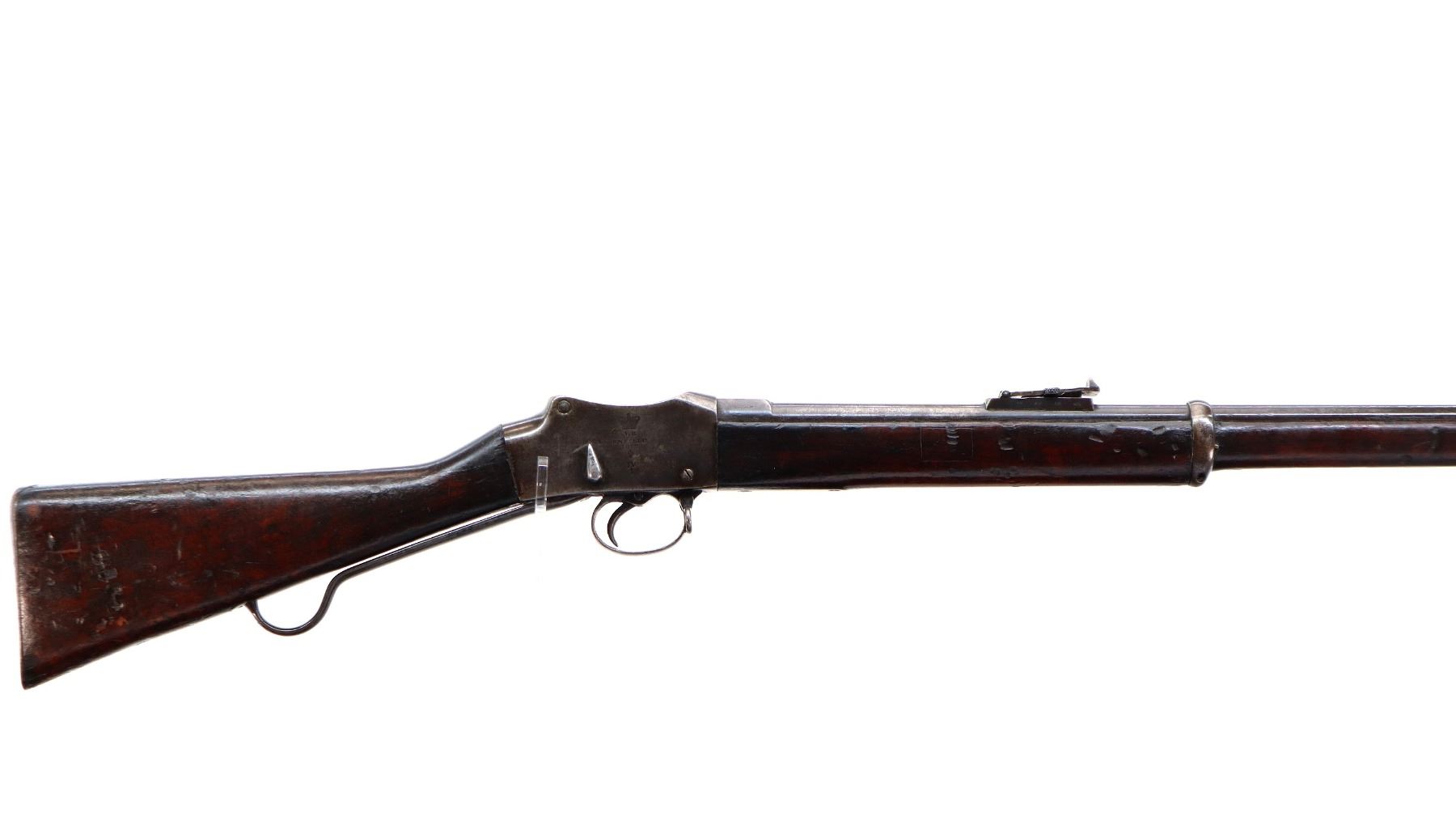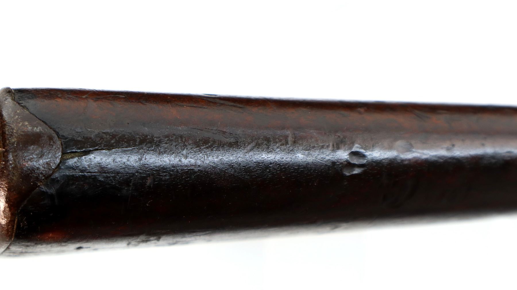 Main Description: Manufactured by Enfield 1877. Blade front sight with ramp, adjustable u notched ladder rear sight, small cocking indicator, long lever. Two piece full military wood stocks, forearm is chipped and cracked with arsenal repair, straight grip, chipped and cracked behind receiver, smooth steel butt plate, stock cracked at heel and toe with various partial markings on both sides. Sling swivels, bayonet lug, ramrod.