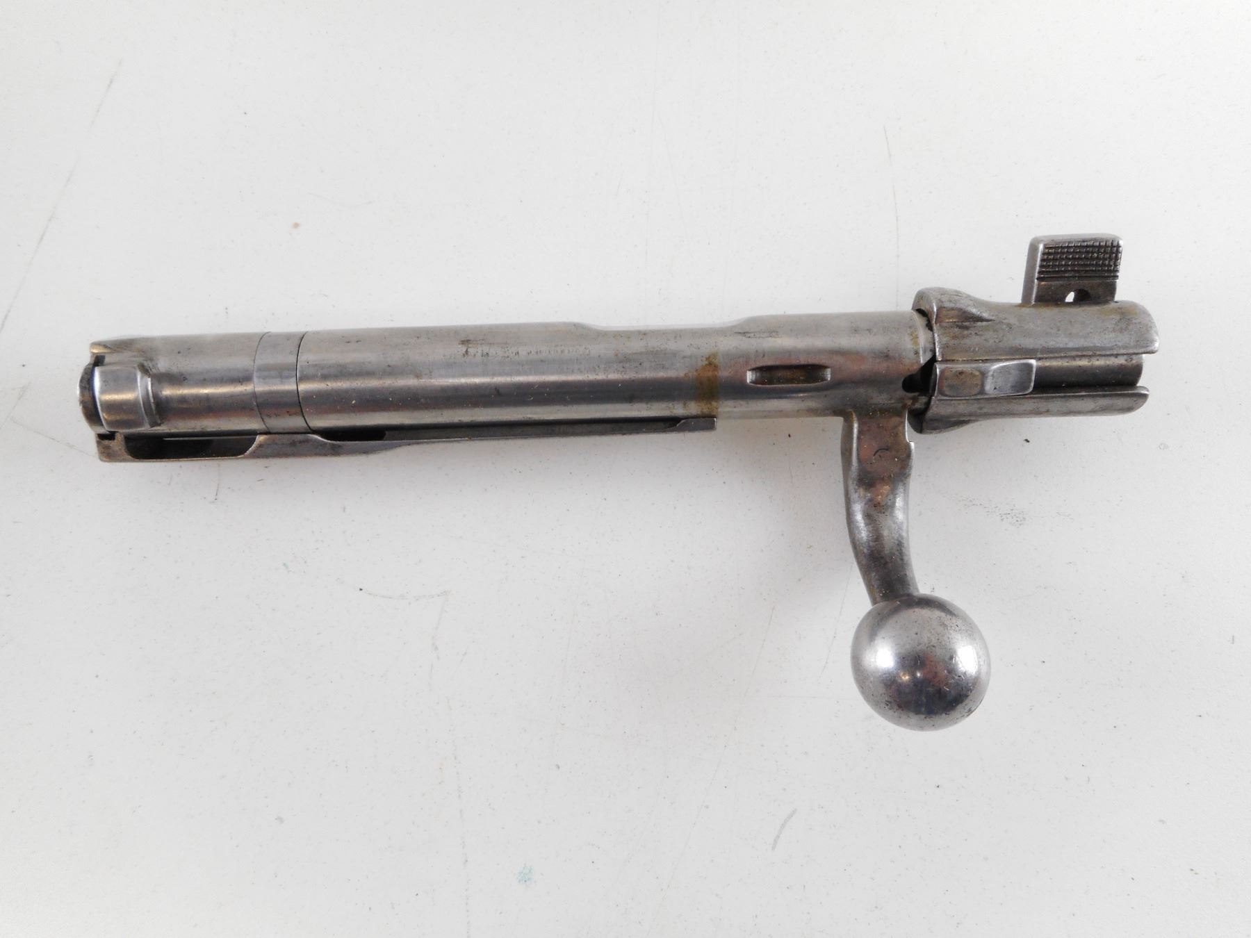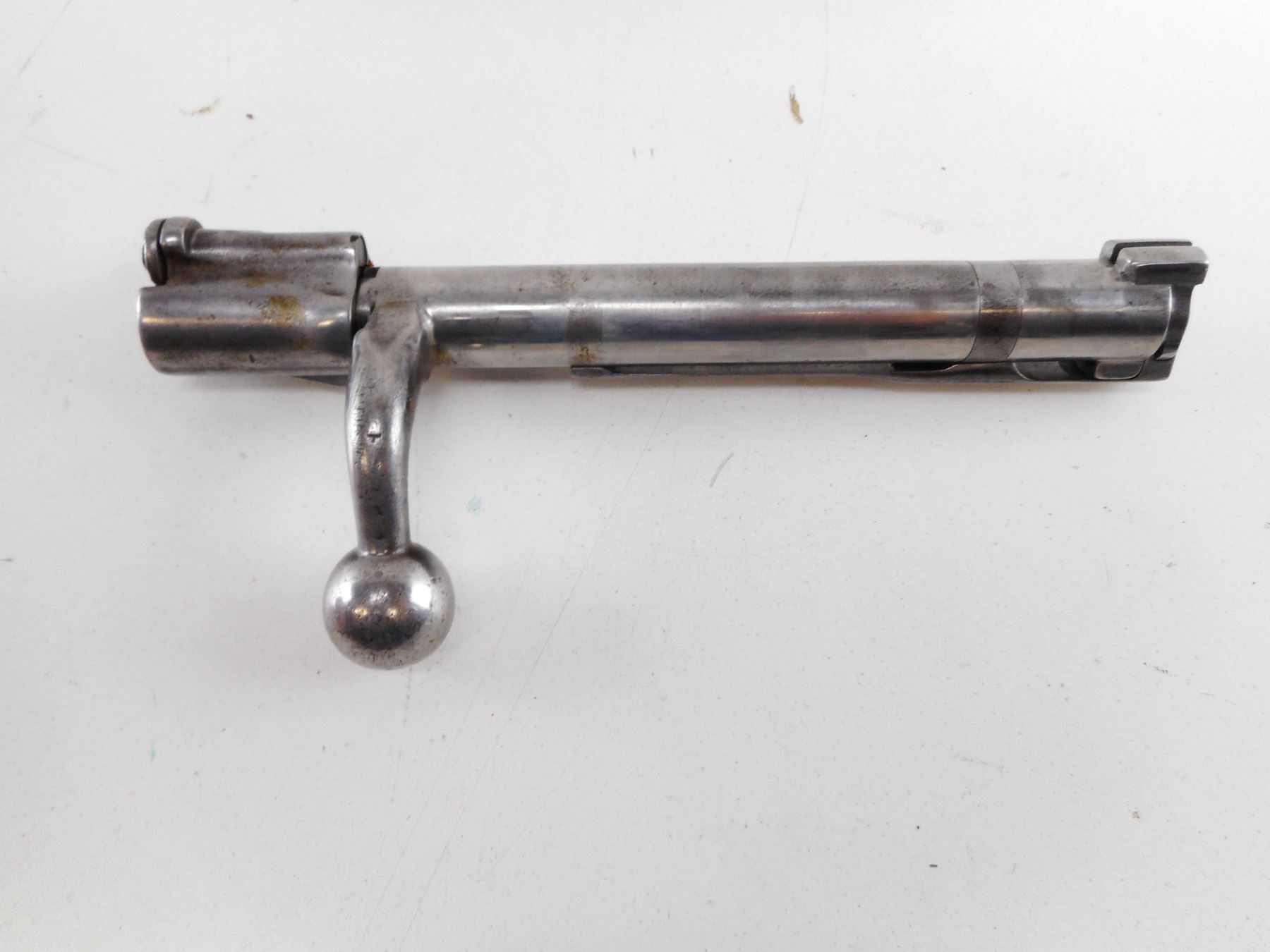 MAUSER 1893/1895 BOLT , FLAT BOTTOM BOLT FACE. COMPLETE UNUMBERED, BENT CARBINE HANDLE. MAY REQUIRE FITTING.